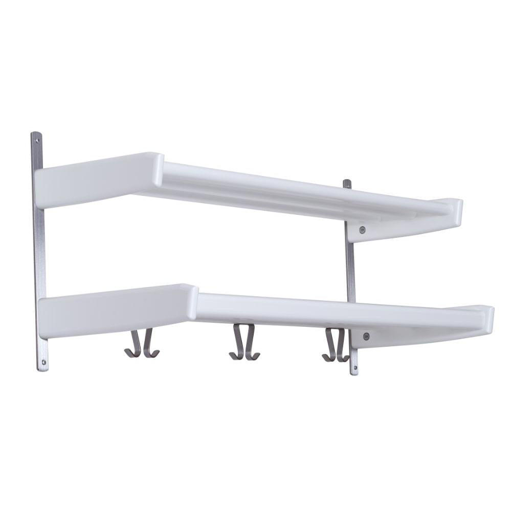 • Vit väggmonterad hylla med två nivåer och krokar i metall för förvaring i kök eller badrum