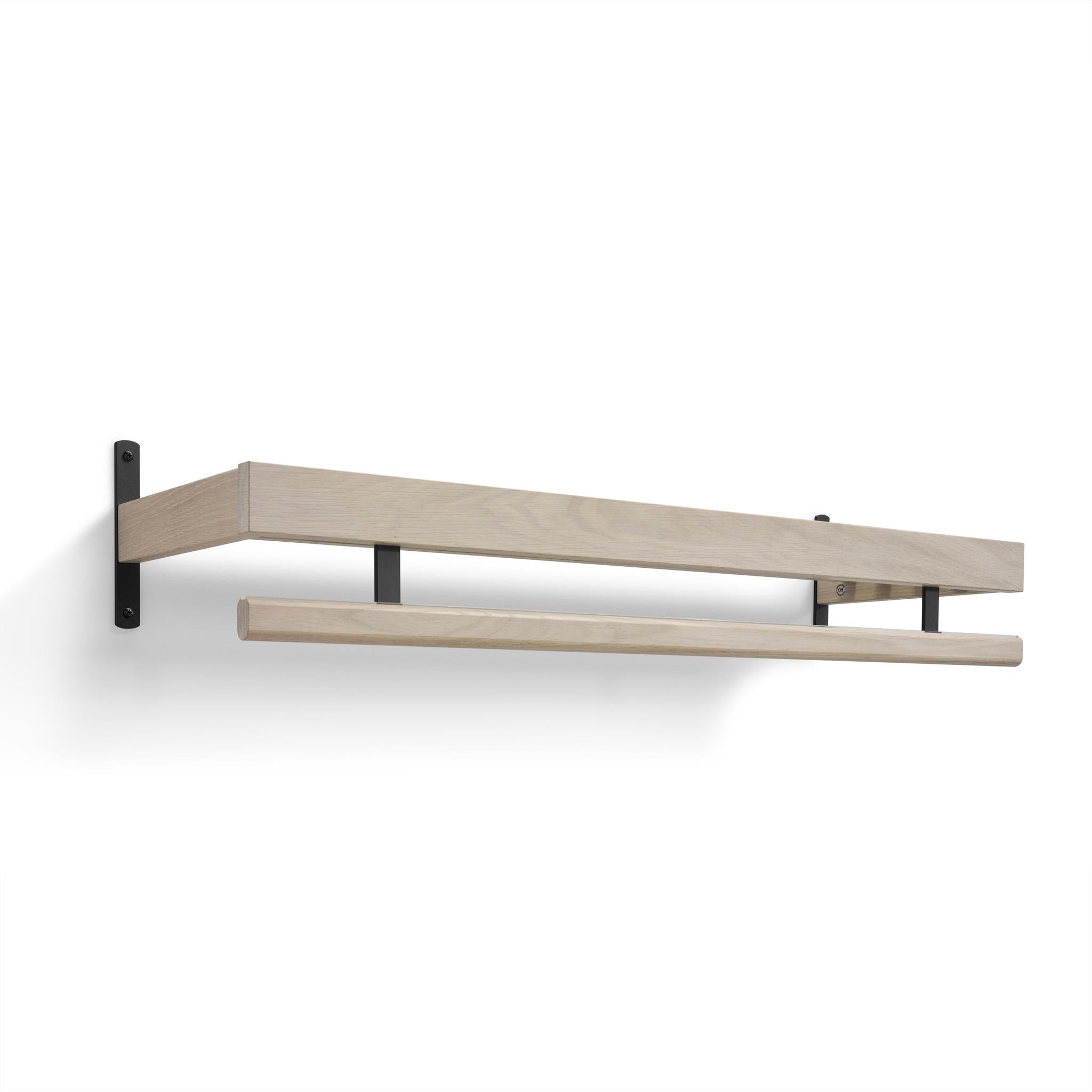 • Väggmonterad hylla i ek med svarta fästen och rundad stång för förvaring