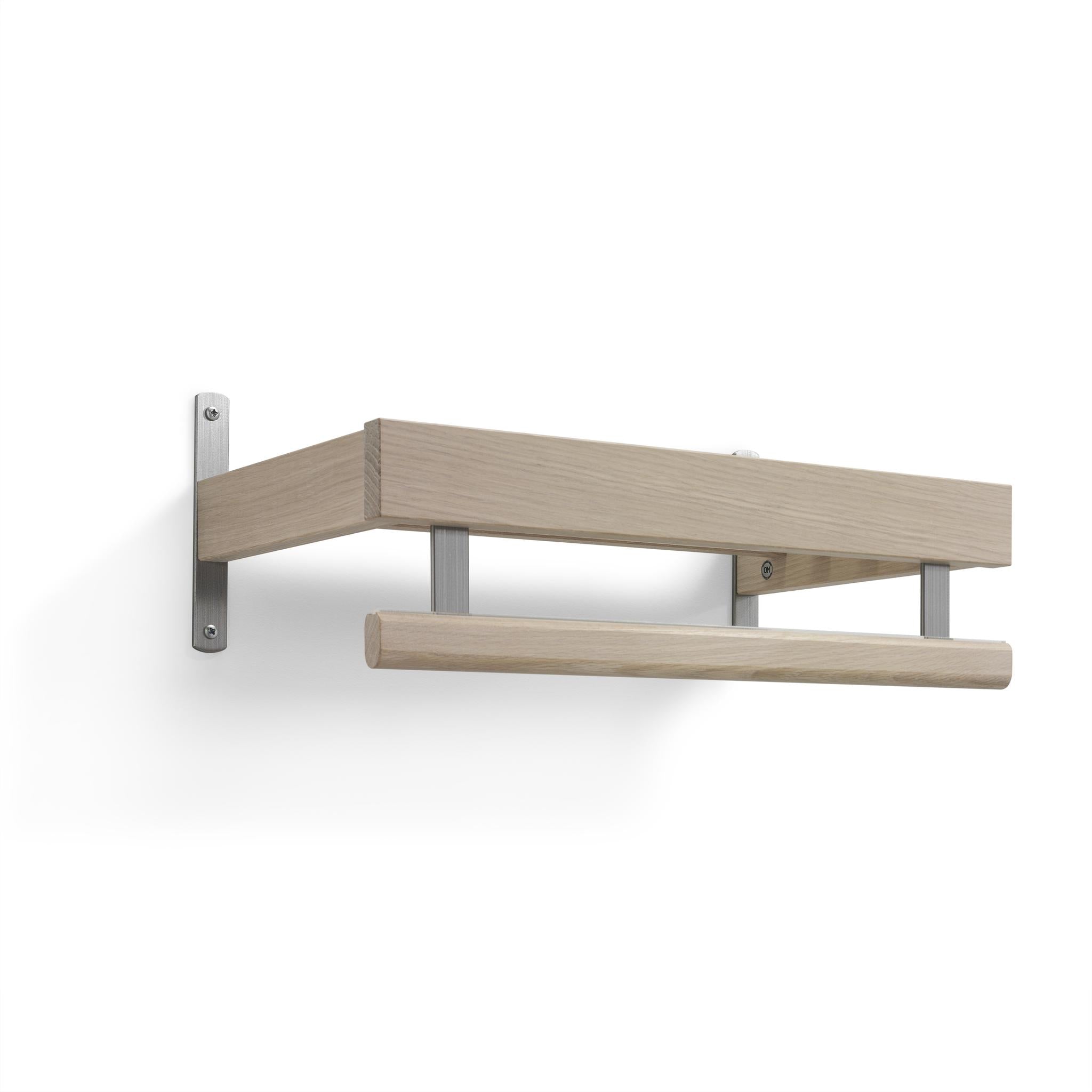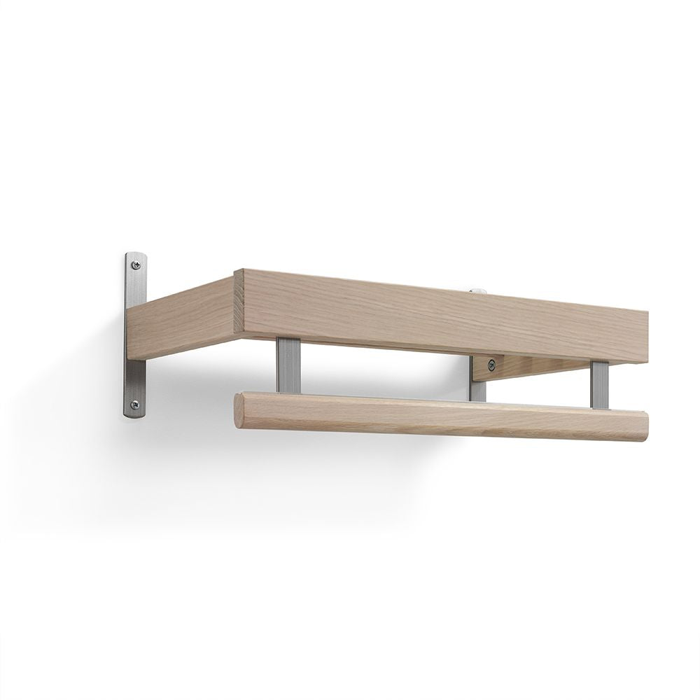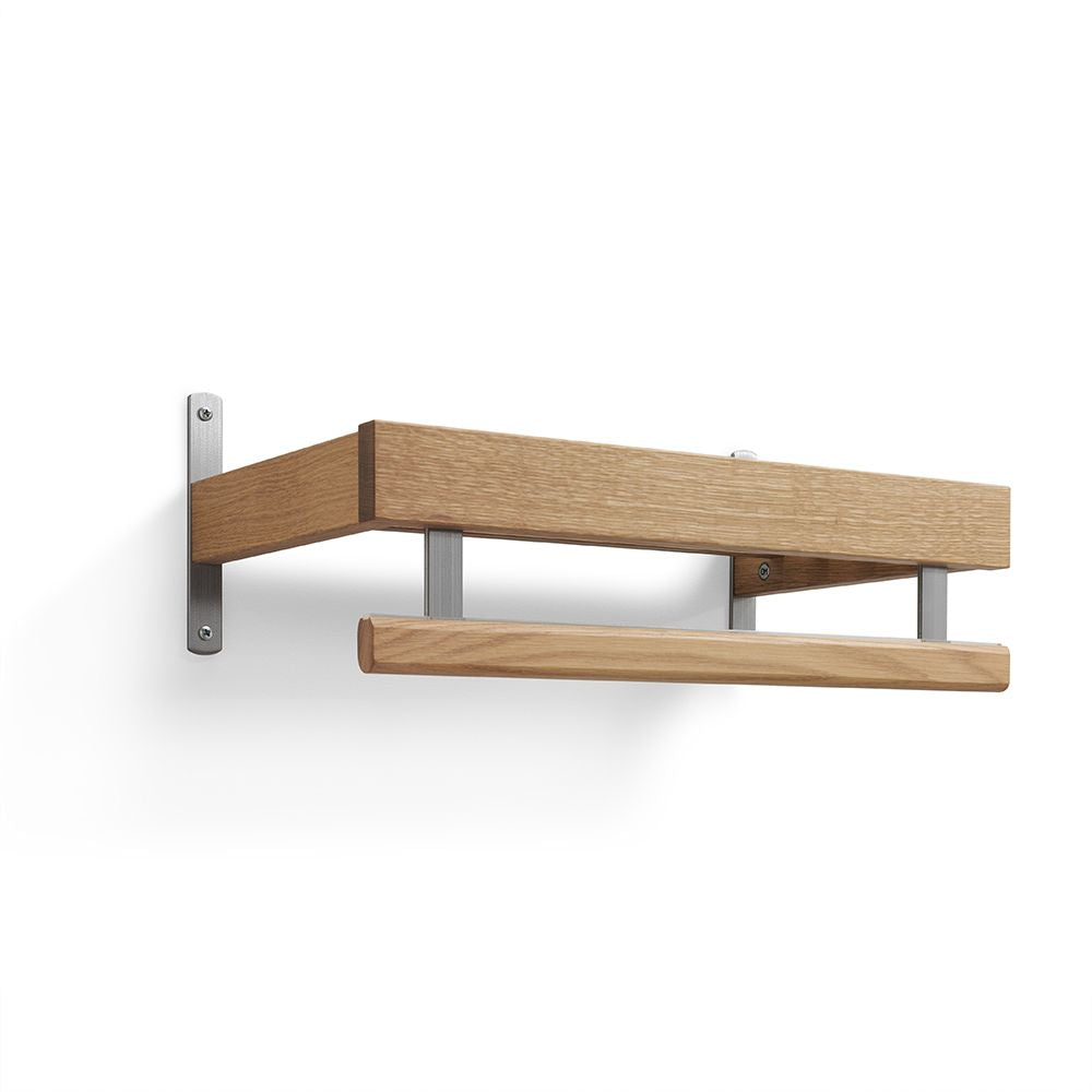 • Väggmonterad hylla i ek med metallbeslag och handdukshängare i modern skandinavisk design