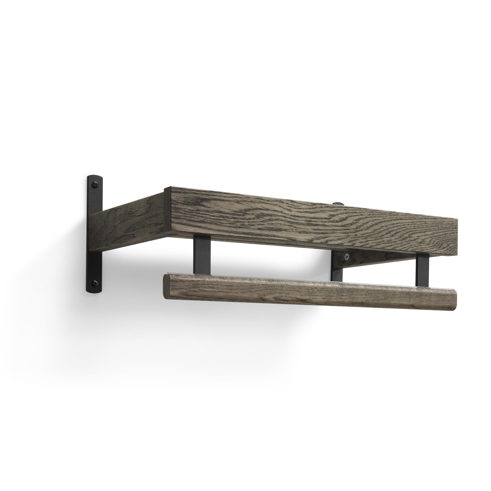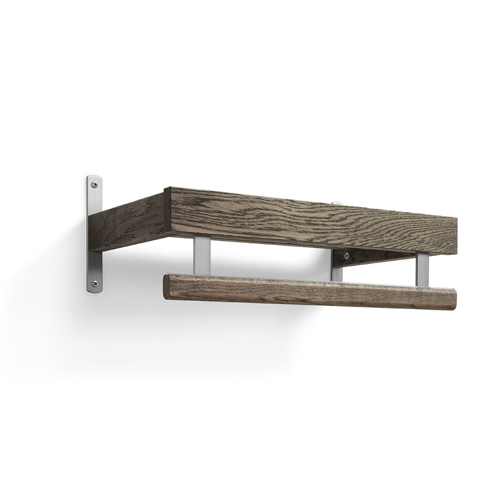 • Väggmonterad hylla i mörkbrun ek med metallkonsol och rundad träpinne för handdukar
