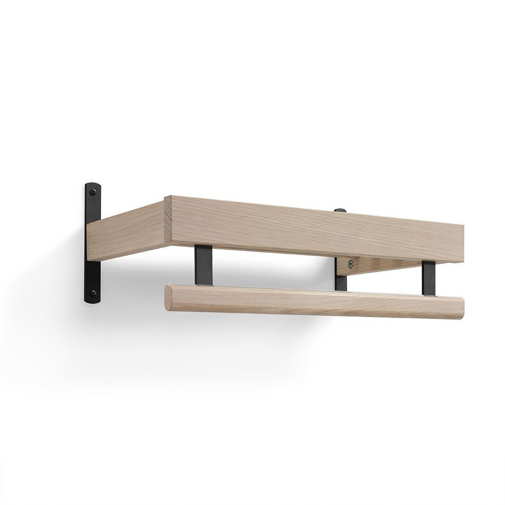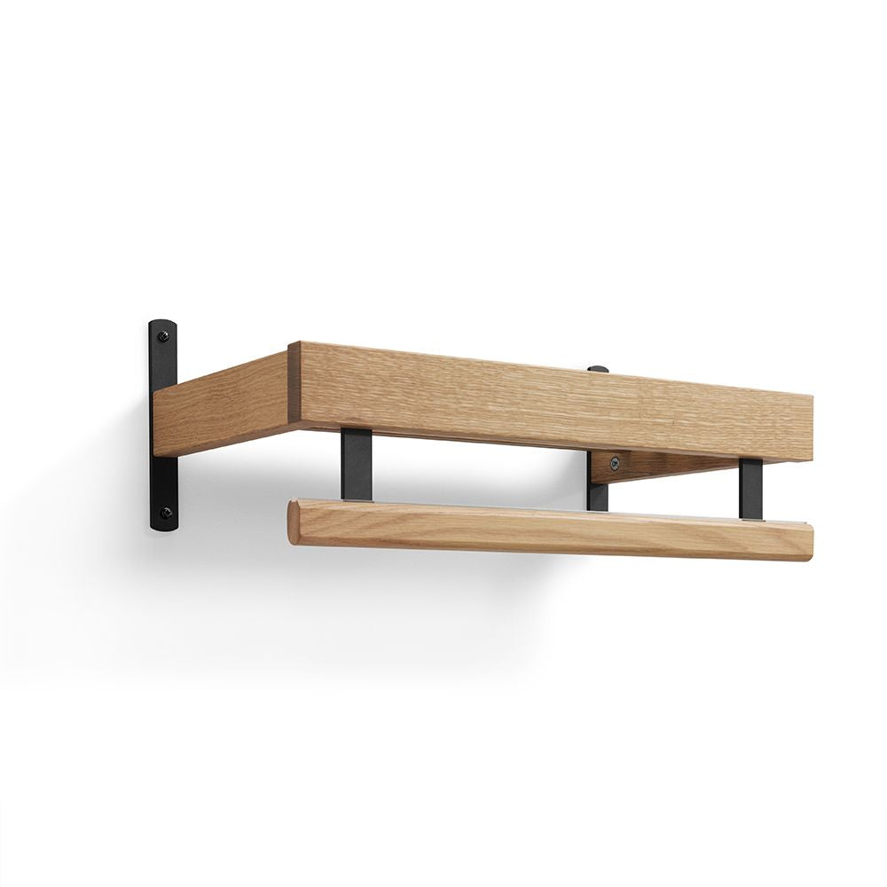 • Väggmonterad hylla i ek med svarta metallbeslag och handduksstång