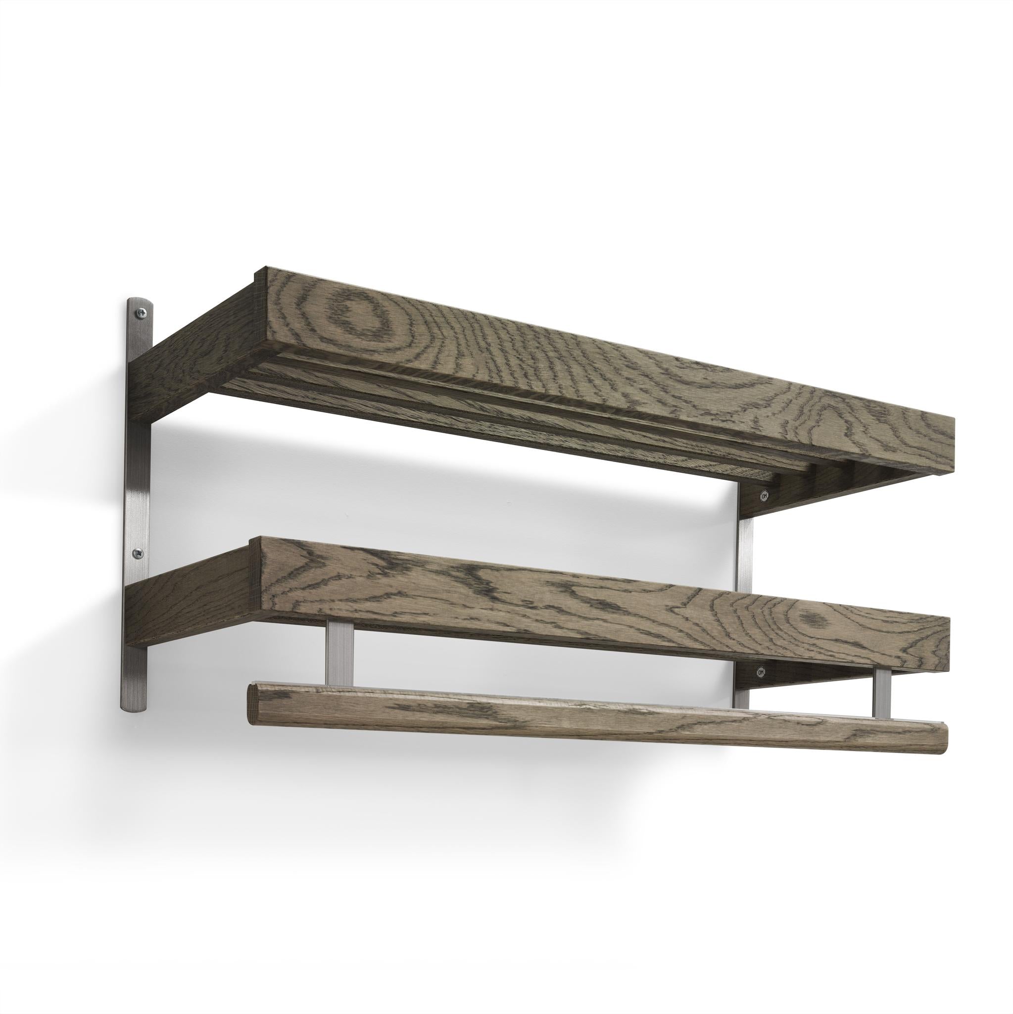 • Väggmonterad hylla i ek med metallbeslag, två nivåer och rundad stång för handduksupphängning