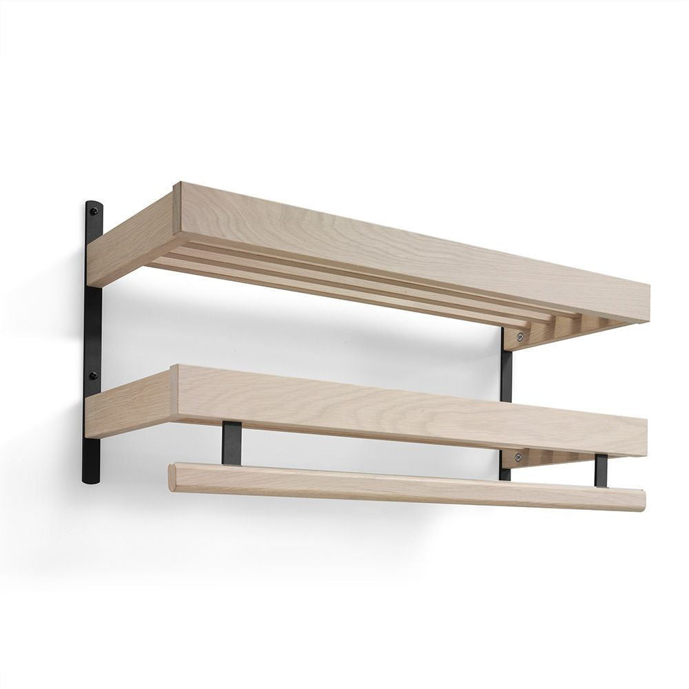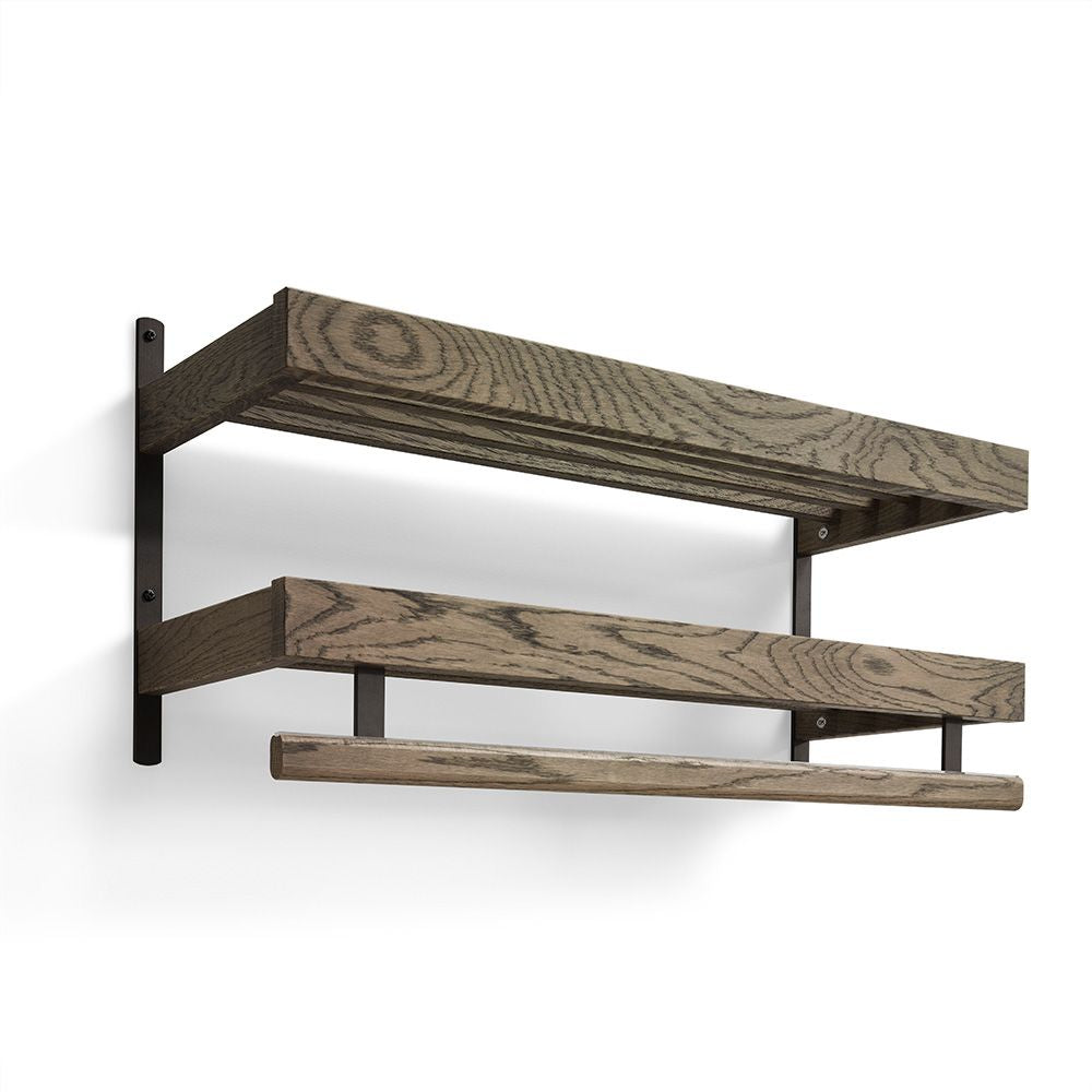 • Väggmonterad hylla i ek med metallbeslag, två nivåer och rundstav för handdukshängning