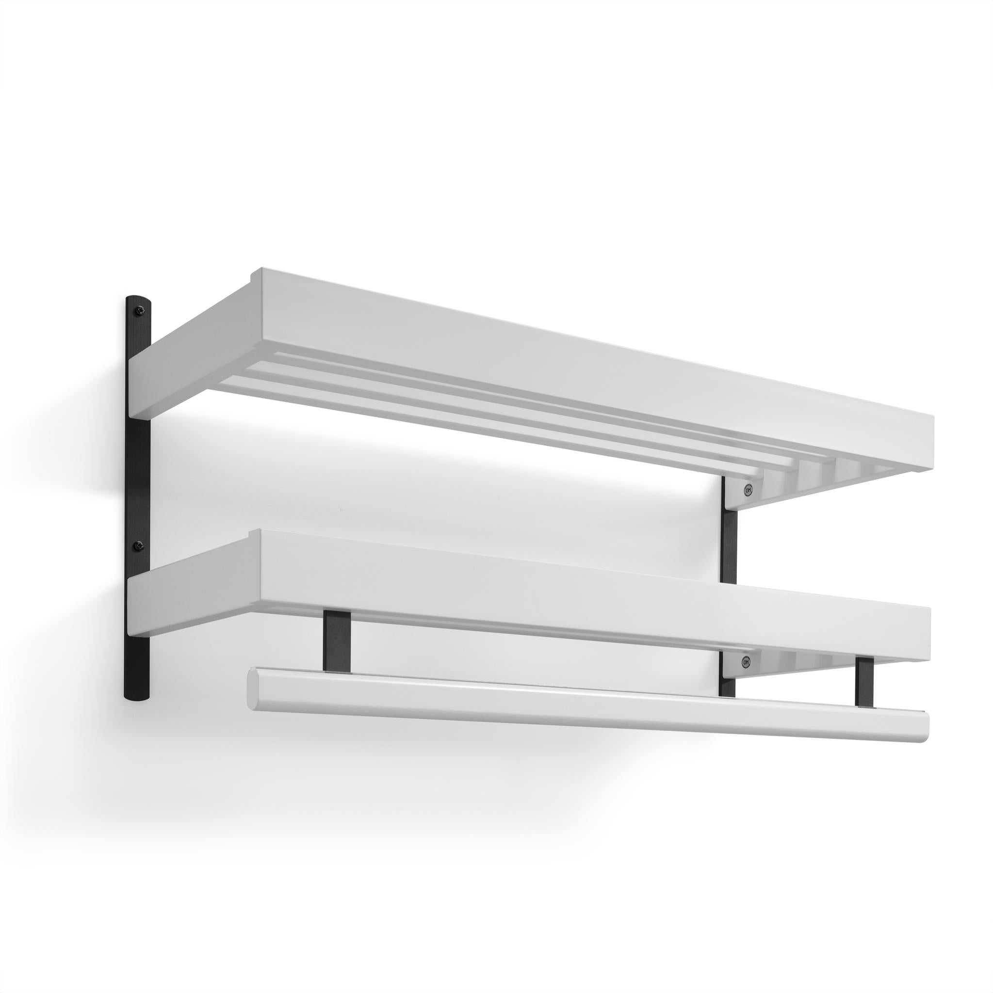 • Vit väggmonterad hylla med handukstork i två nivåer, moderna rena linjer och metallbeslag