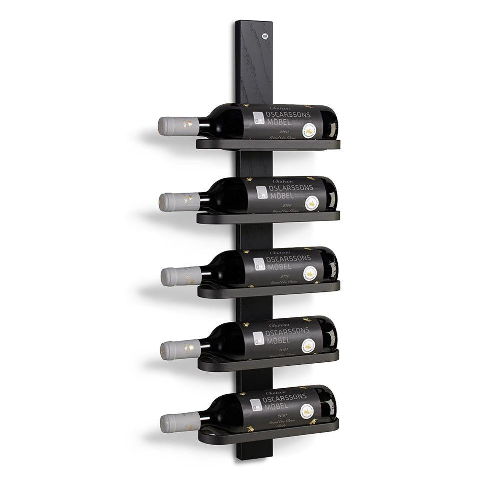 • Vinställ i trä med fem svarta hyllplan som håller vinflaskor i vertikal montering mot vit vägg