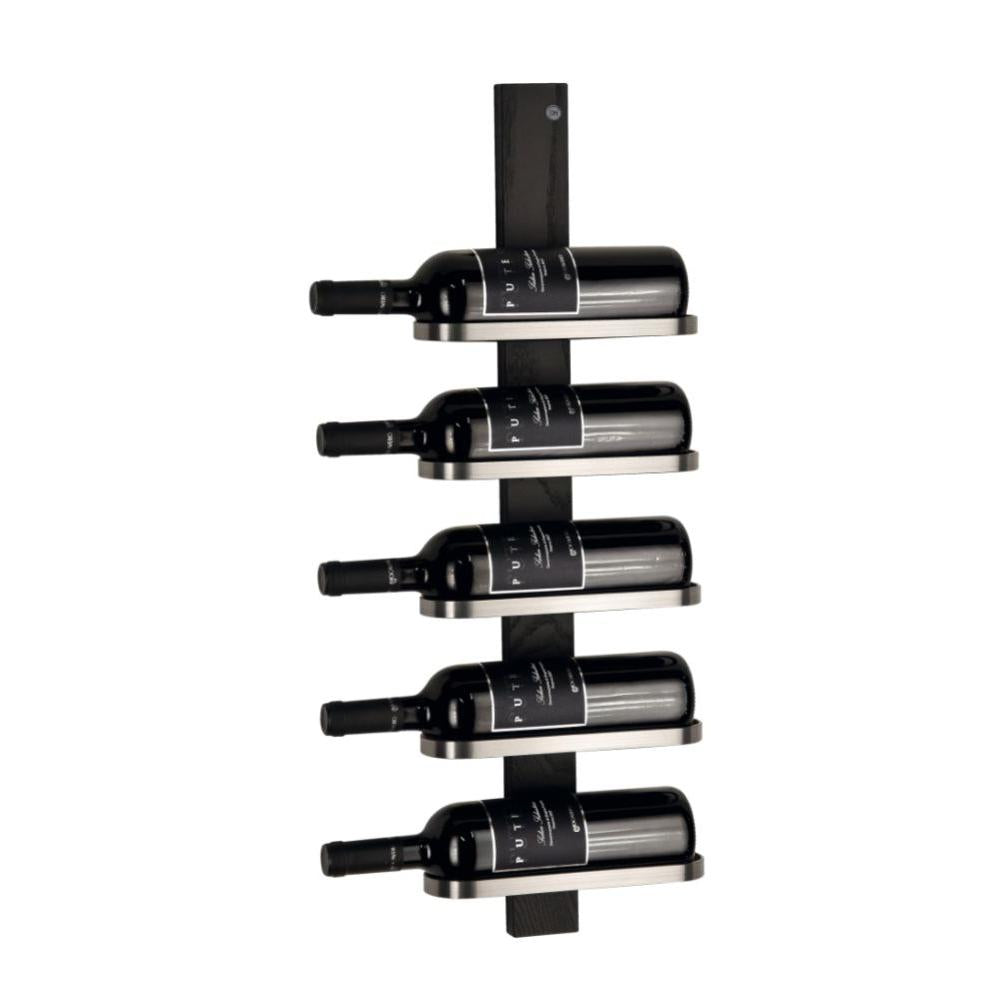 • Vinställ i rostfritt stål med fem svarta vinflaskor, modern vertikal väggmonterad design