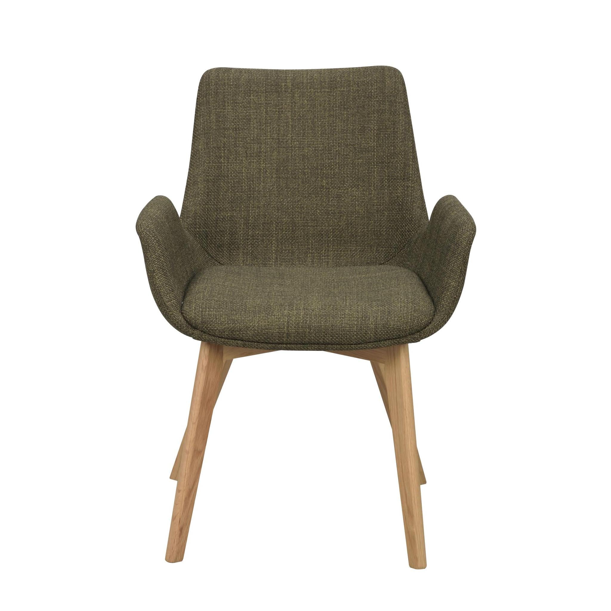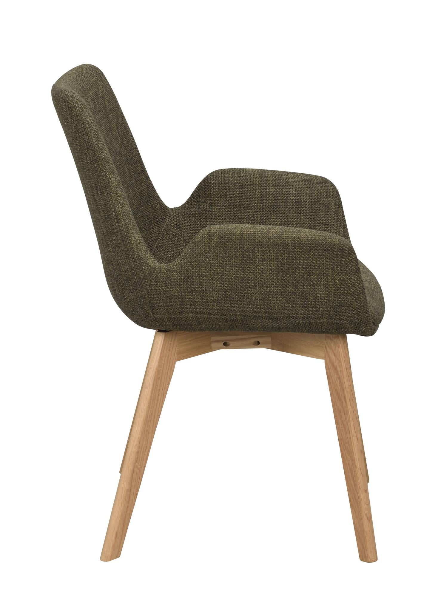 • Grön stol med armstöd och träben i ljust trä, modern skandinavisk design