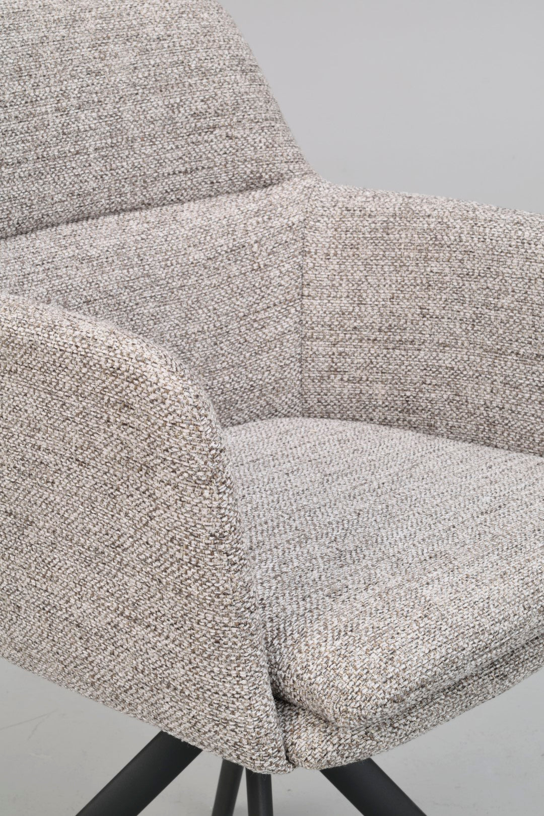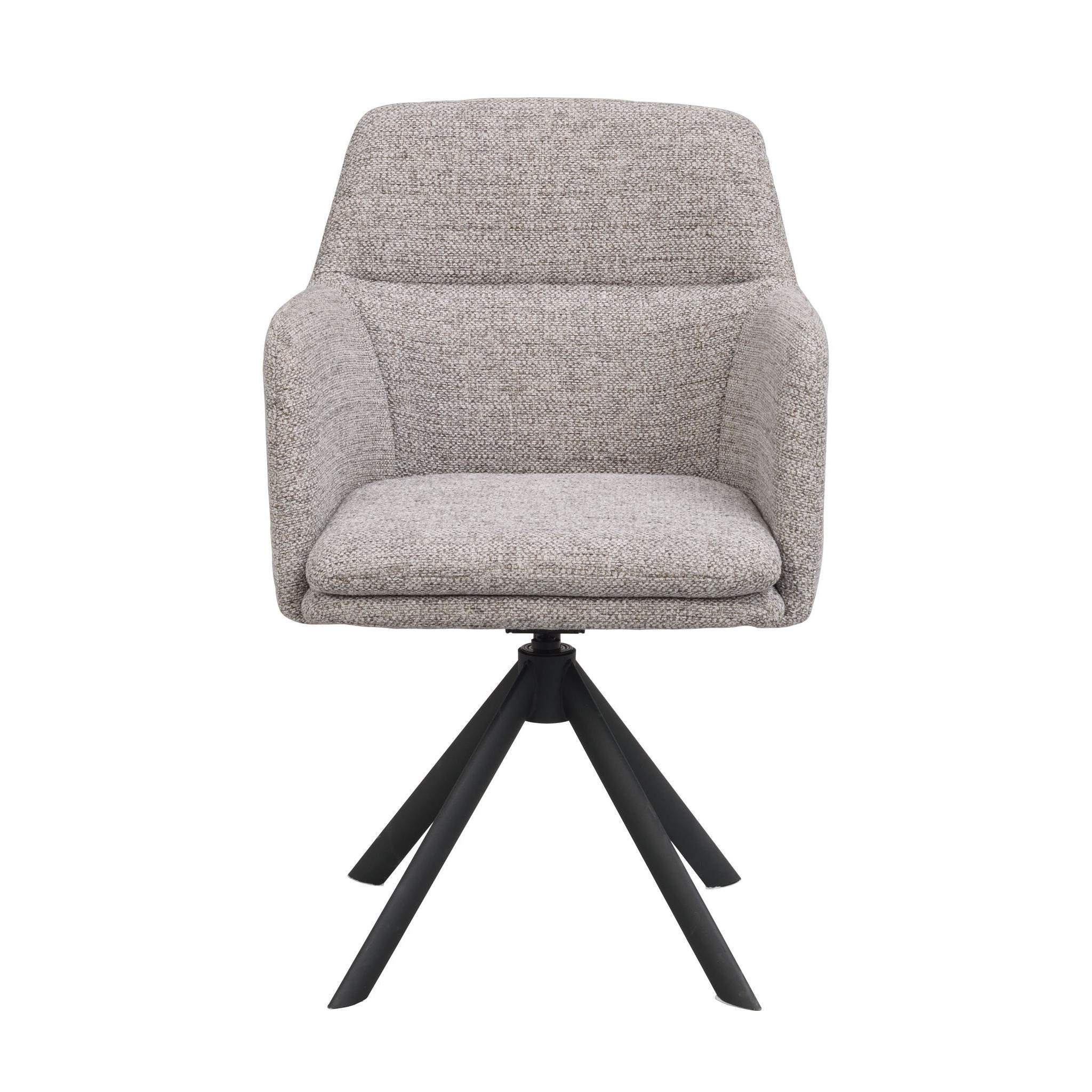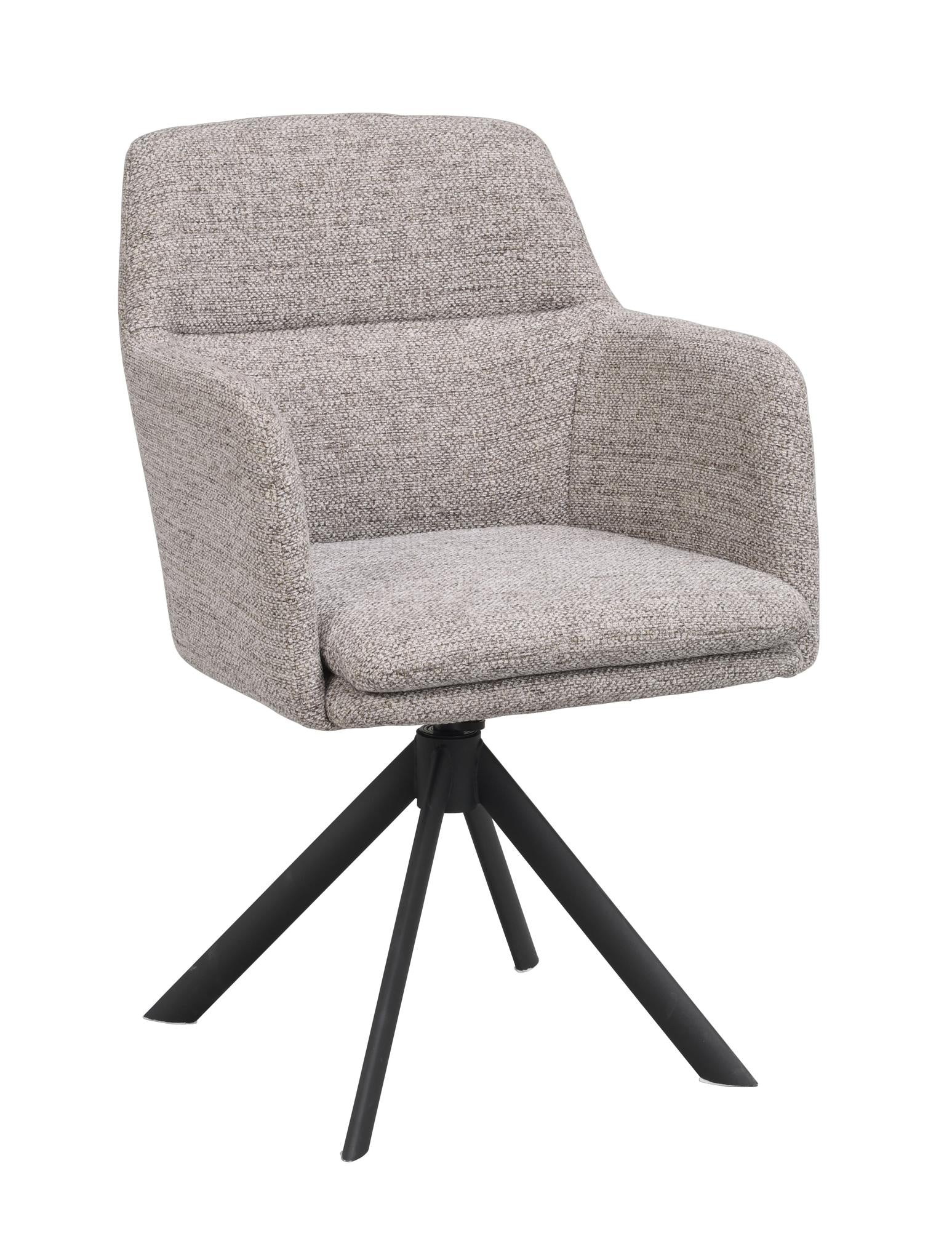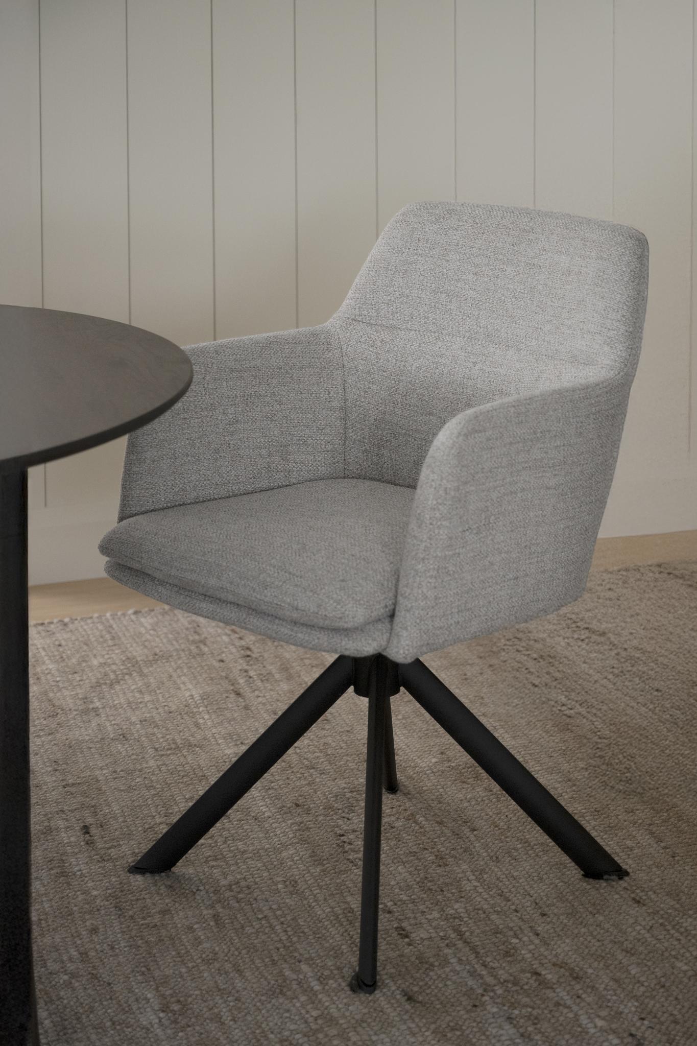 • Grå stol med armstöd och svart snurrfot i metall, modern design med textilklädsel