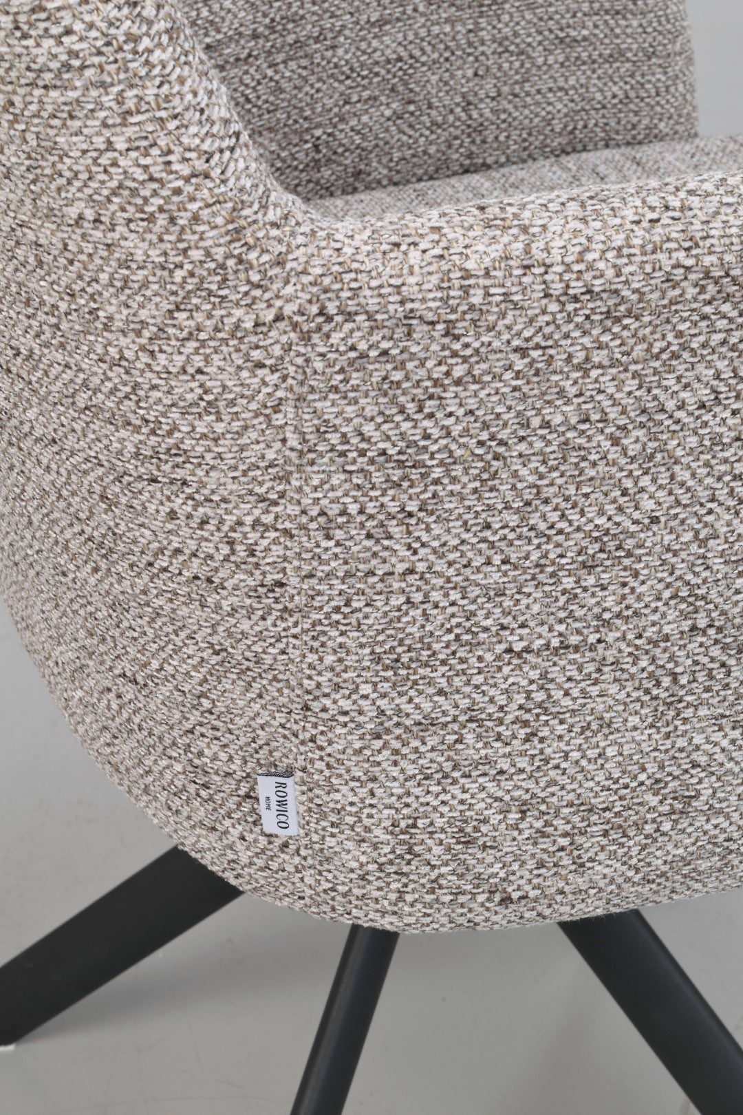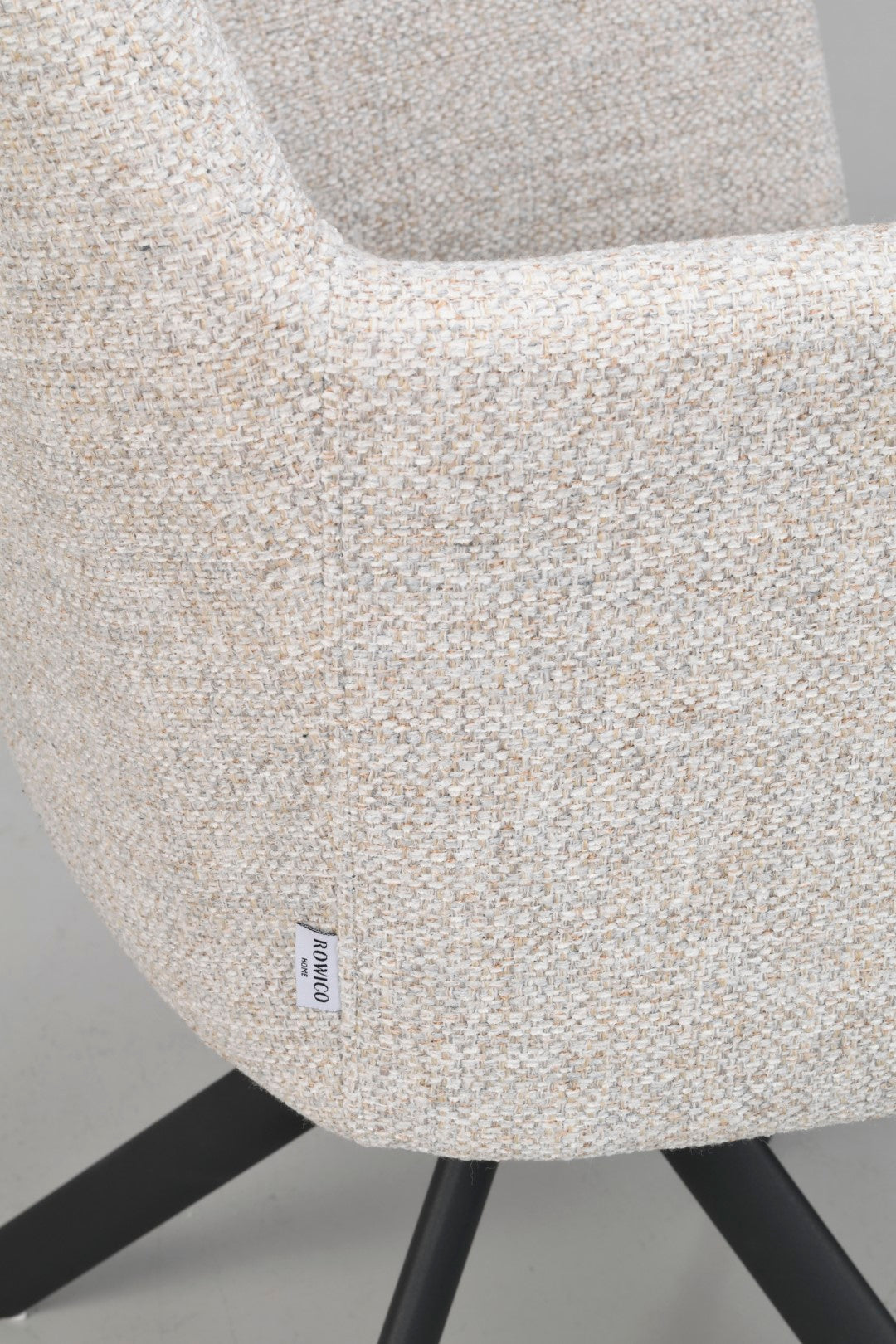 • Närbild på beige fåtölj med textilklädsel och svarta träben, samt en vit etikett med texten "ROWICO"