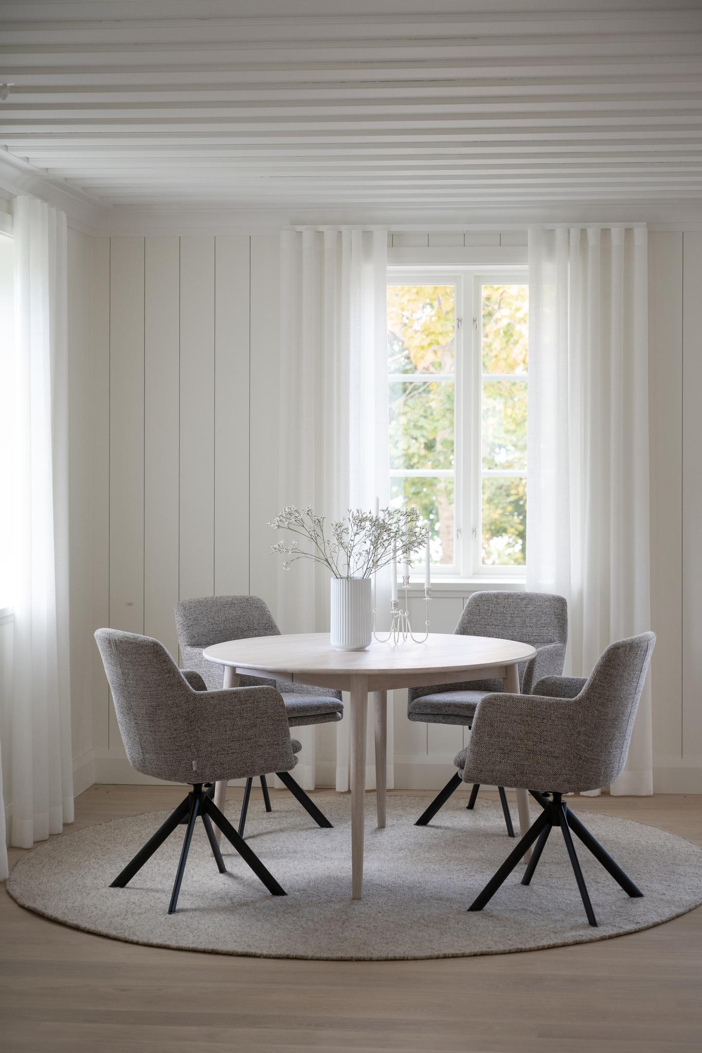 • Rund matbord i vitt med grå stolar och svarta ben i ljust skandinaviskt matrum
