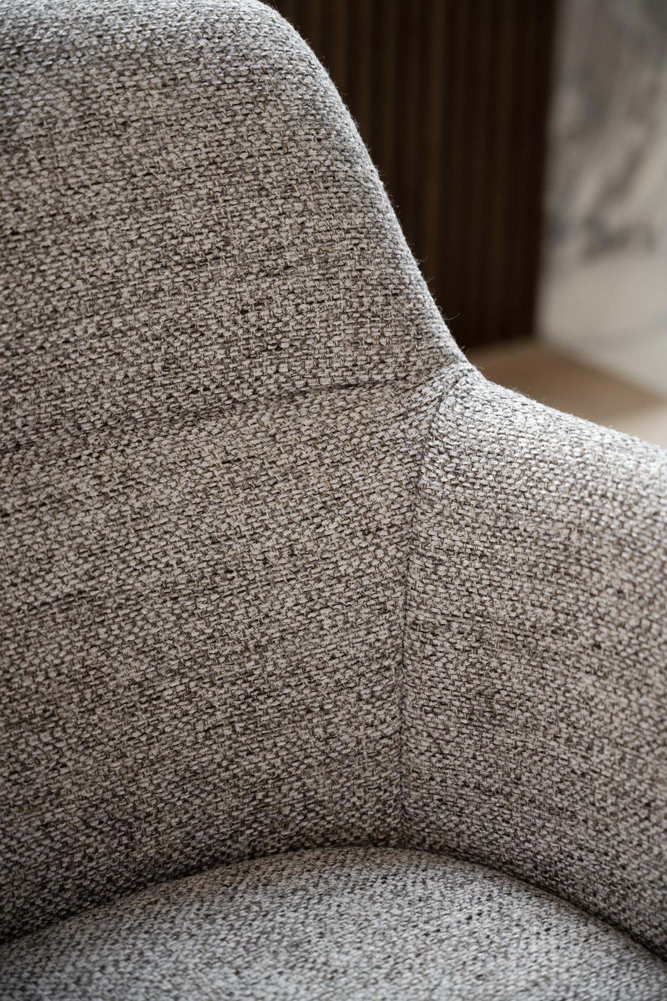 • Närbild på grå textilklädsel på fåtölj med tydlig vävstruktur och mjuka kurvor