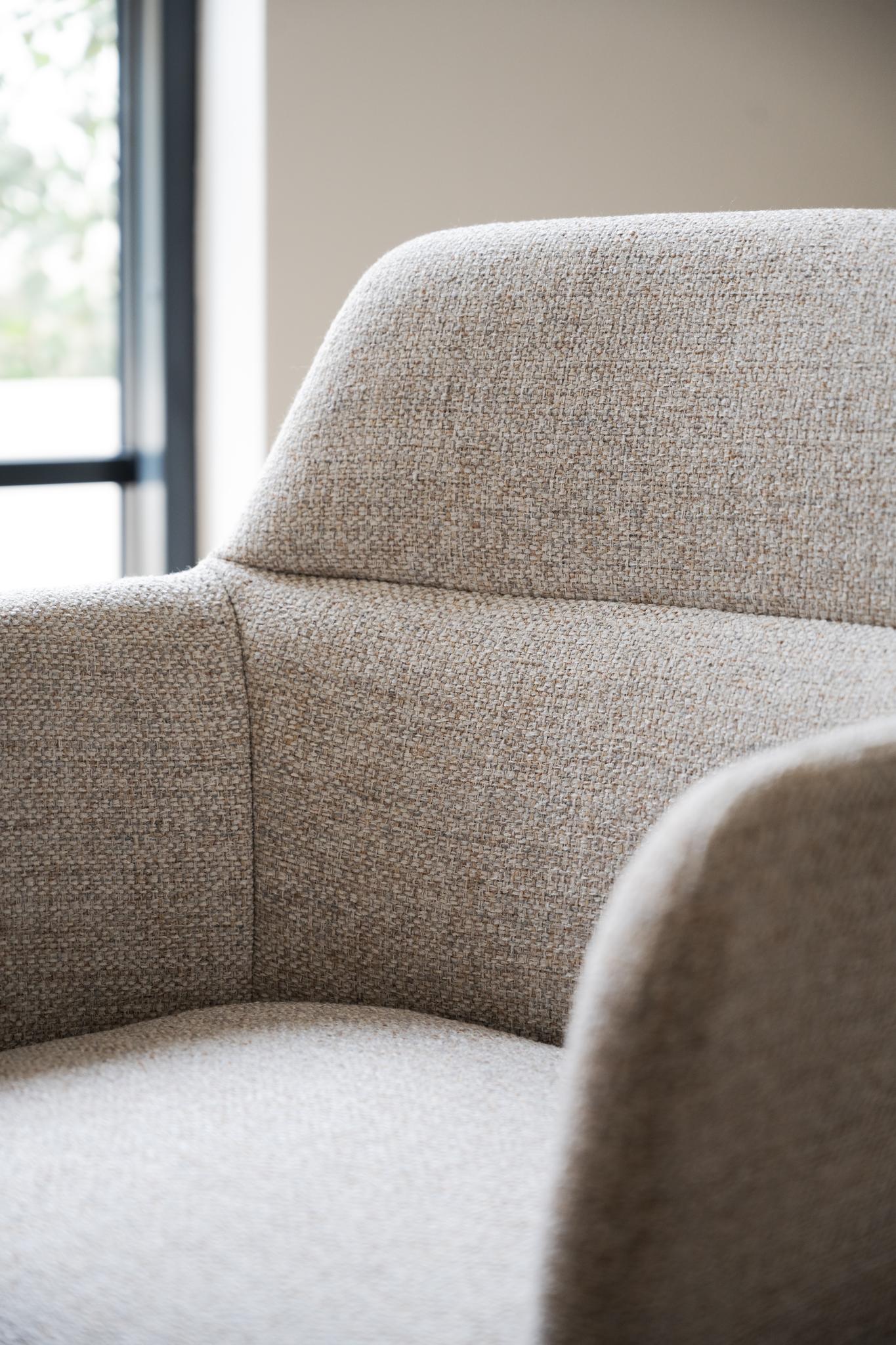 • Närbild på beige fåtölj med strukturerad klädsel och svarta ben i modern skandinavisk design