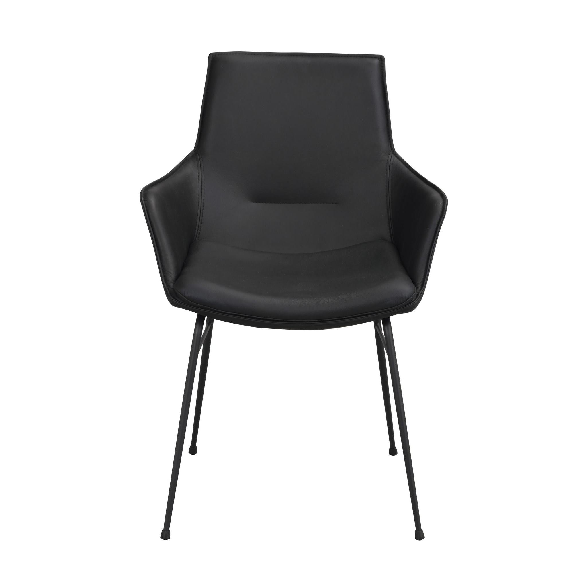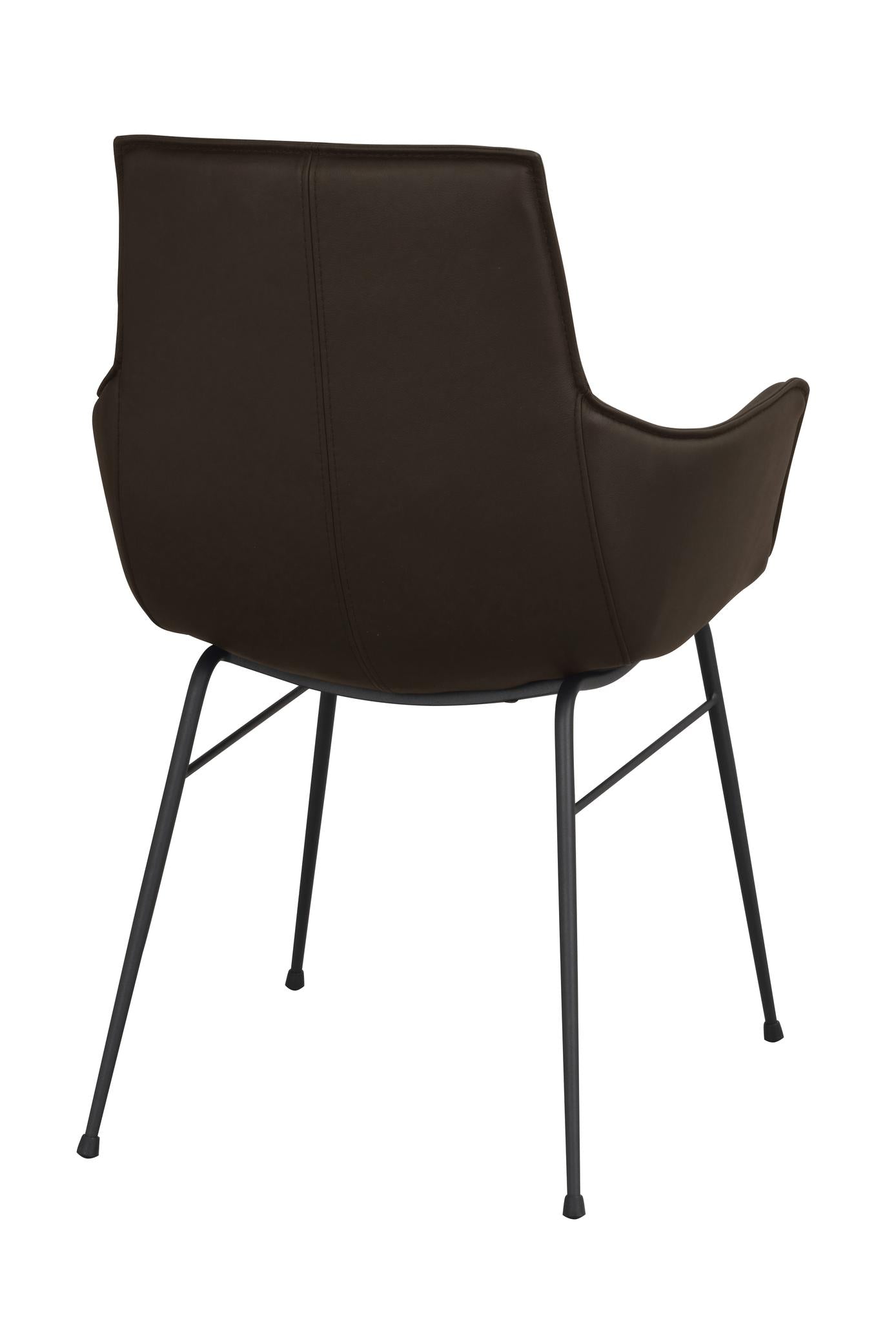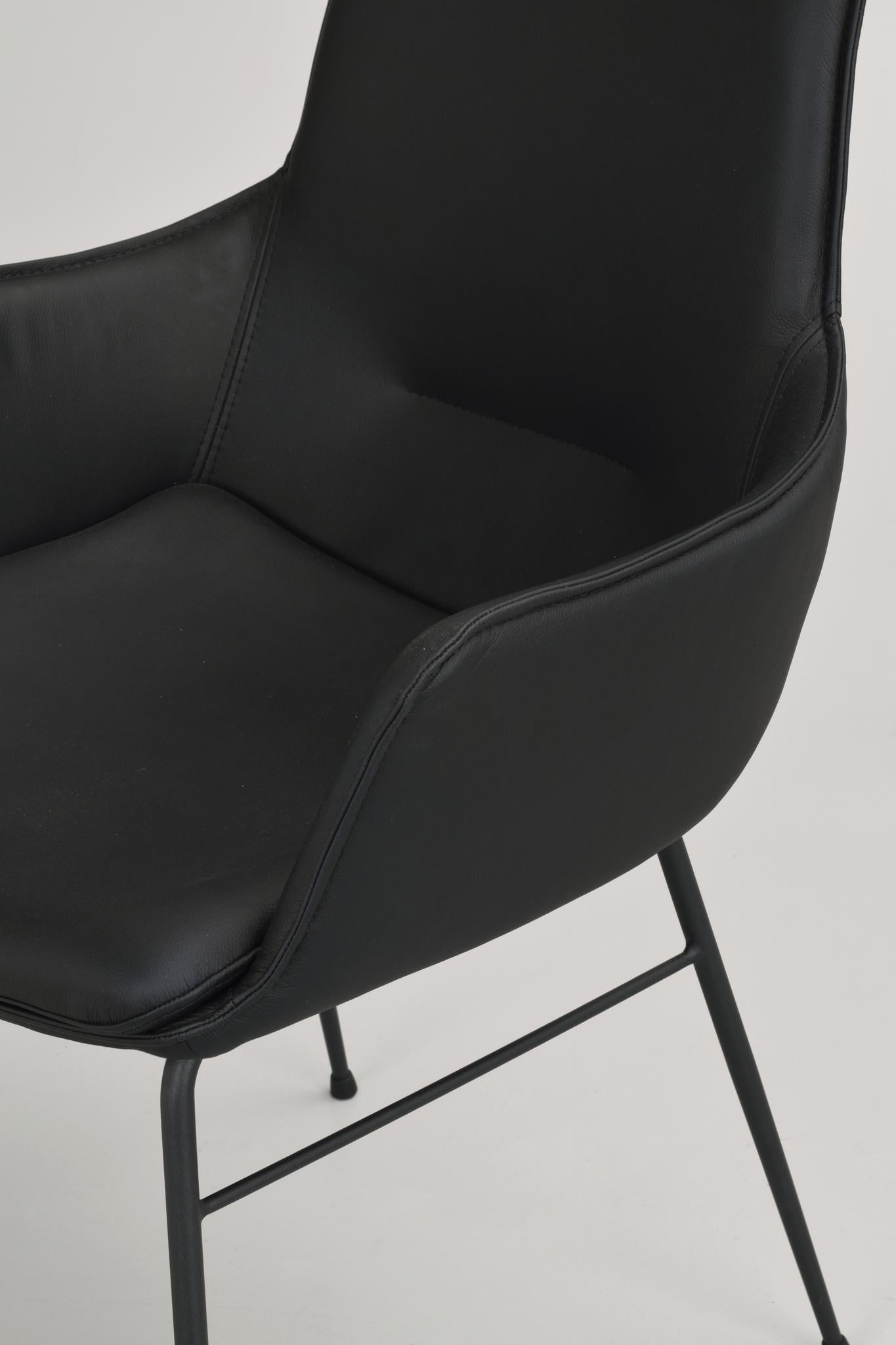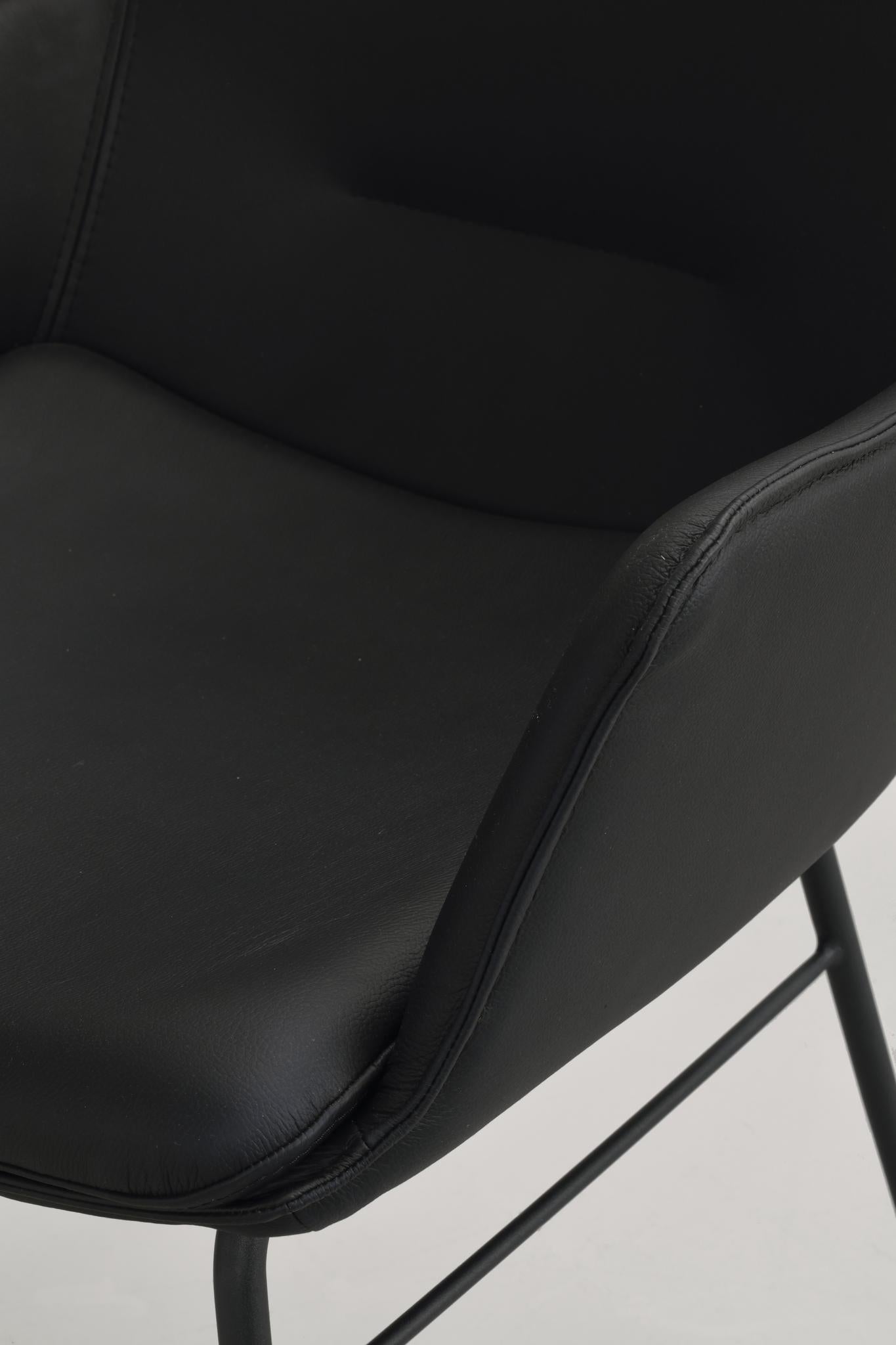 Stoppad karmstol med äkta läder på plywoodstomme, ben i pulverlackad metall i sandstruktur. Fot i gummi.