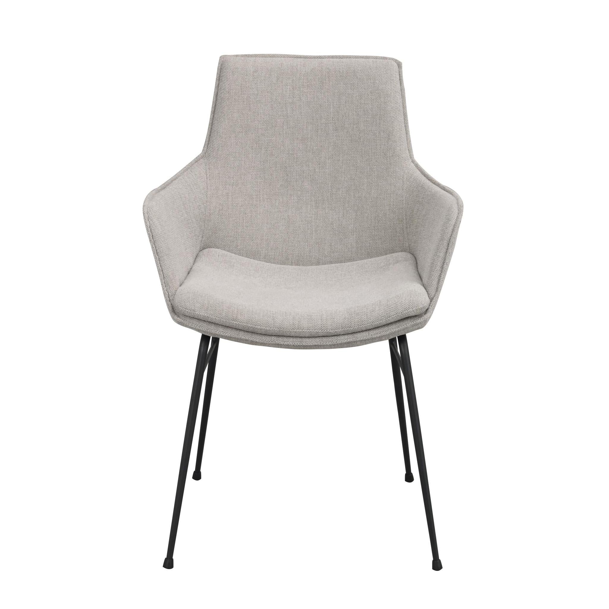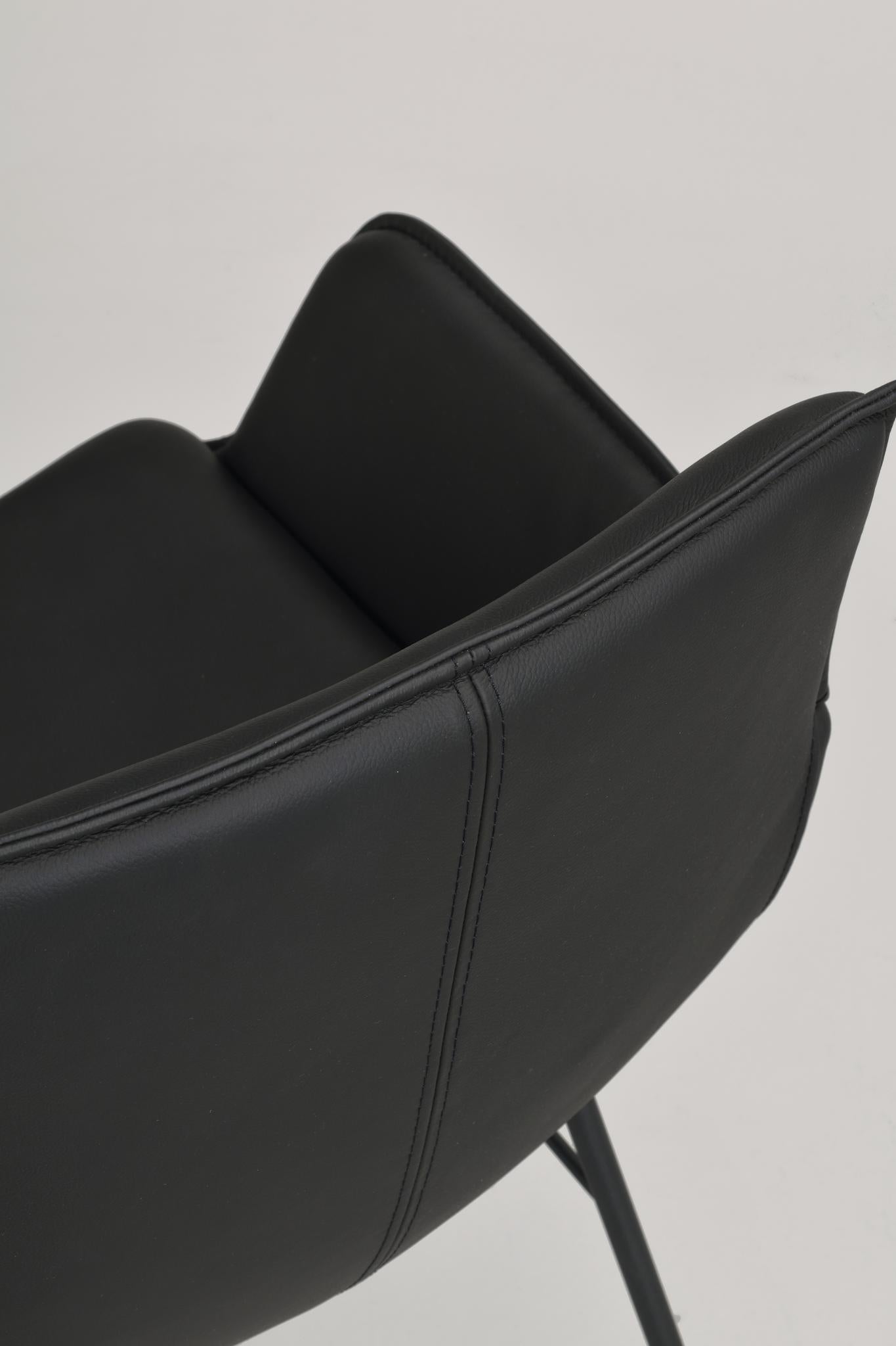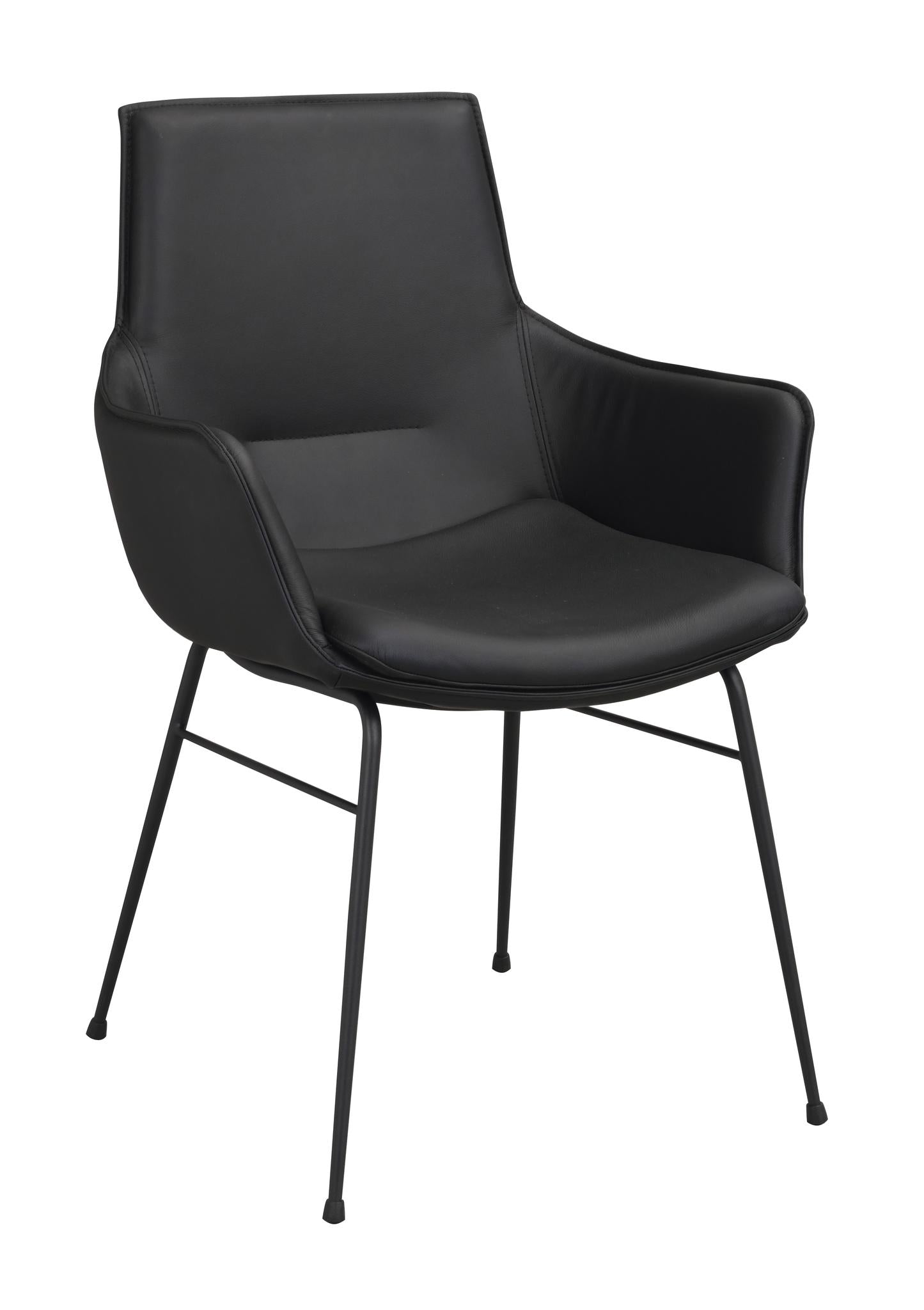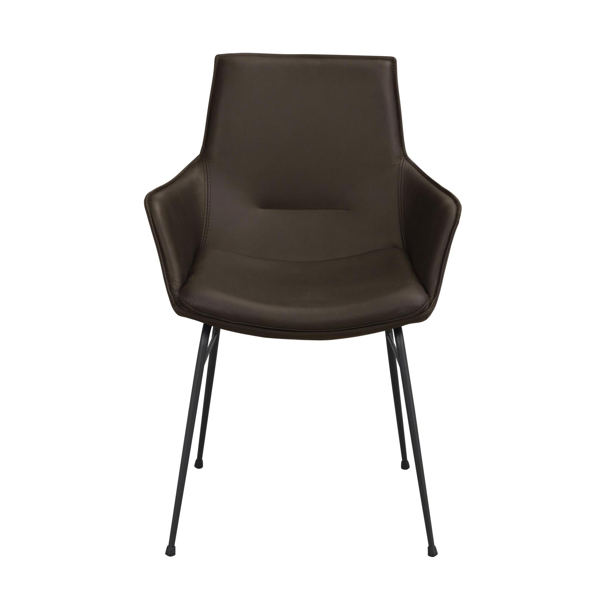 Stoppad karmstol med äkta läder på plywoodstomme, ben i pulverlackad metall i sandstruktur. Fot i gummi.