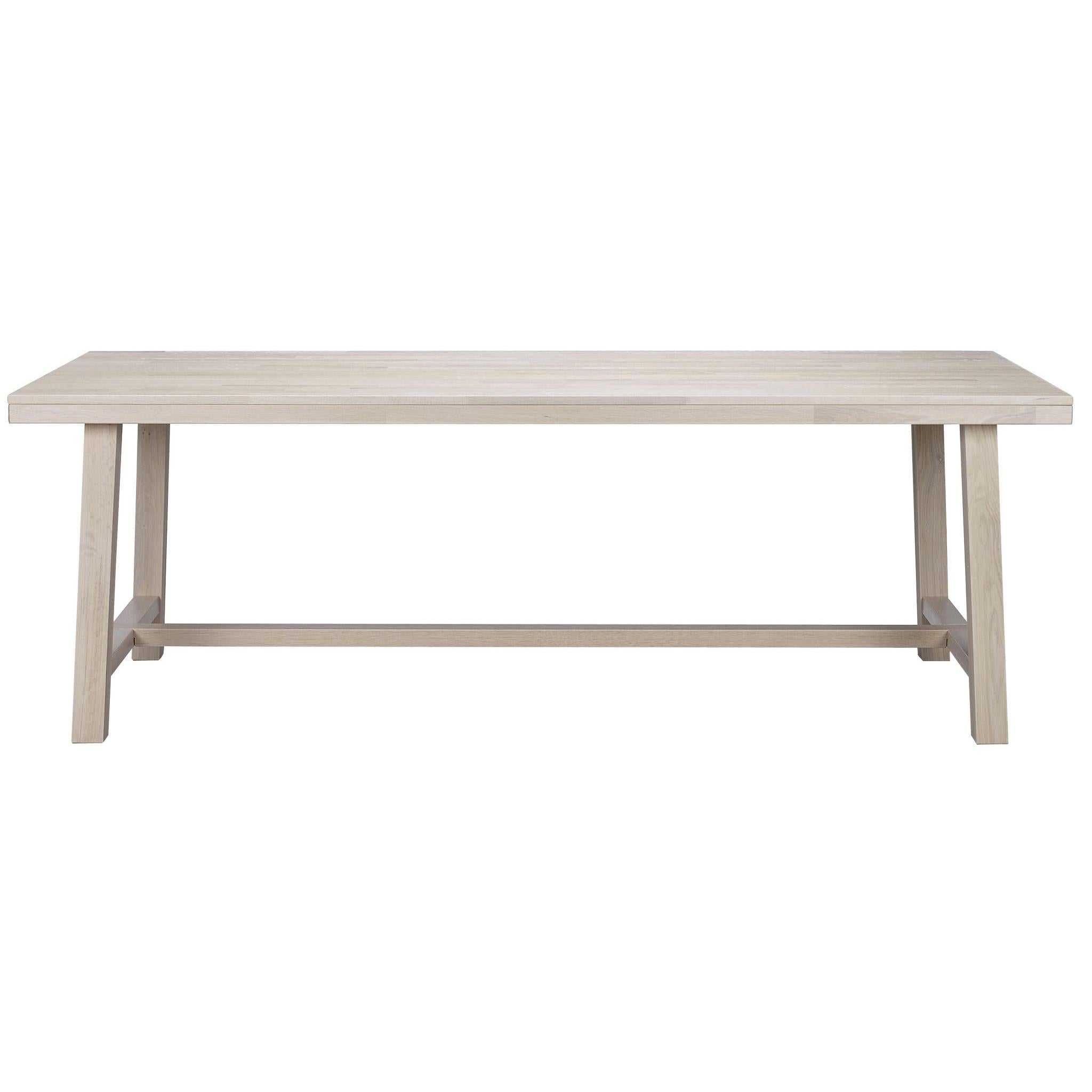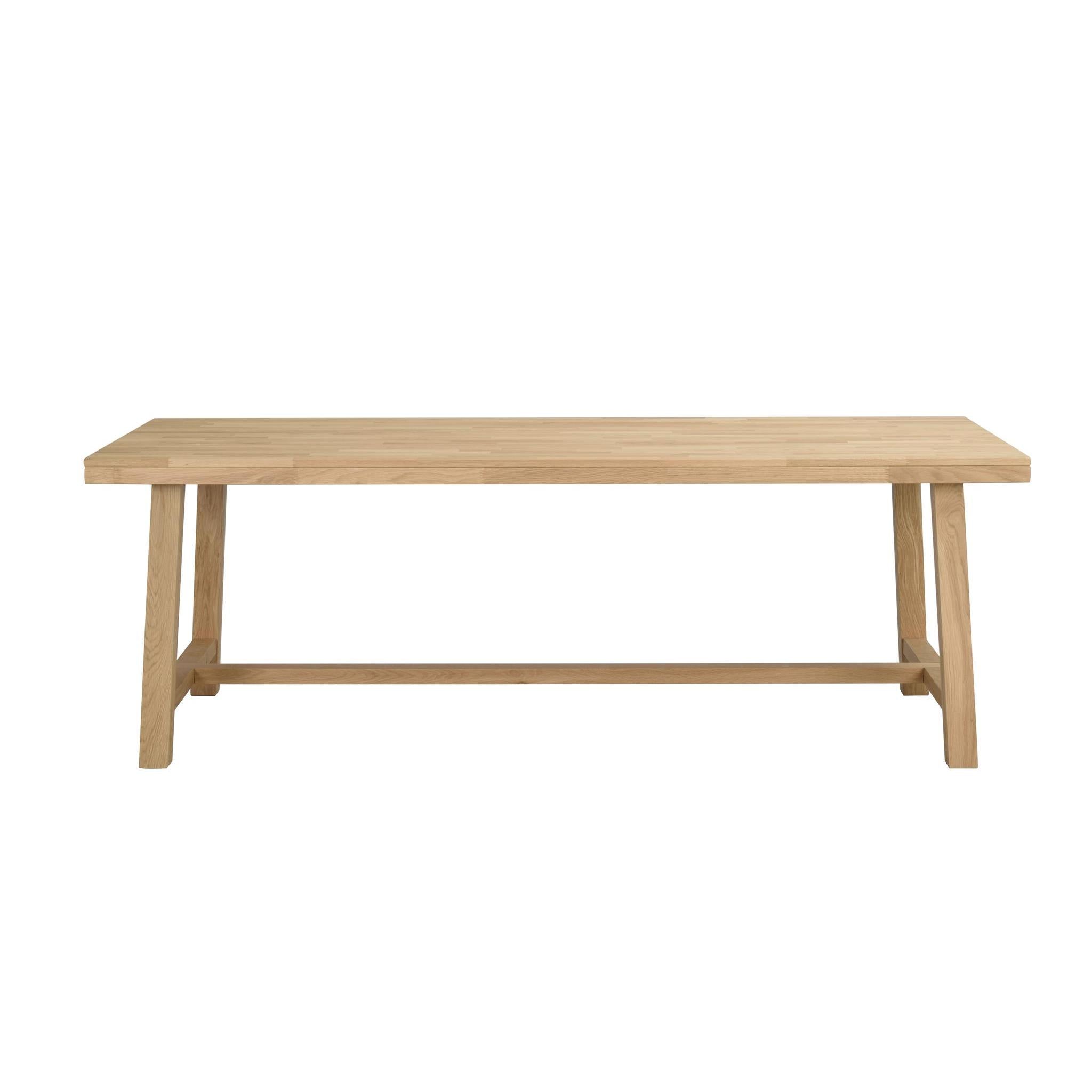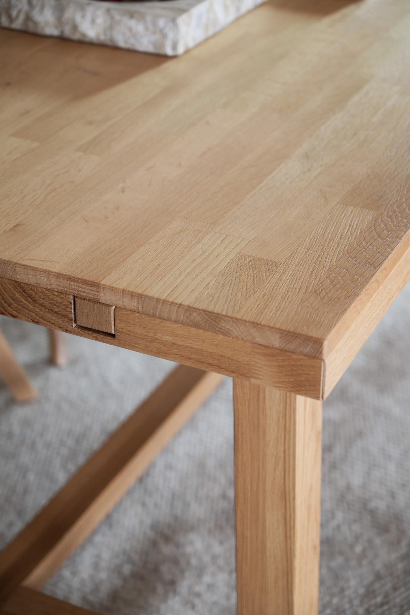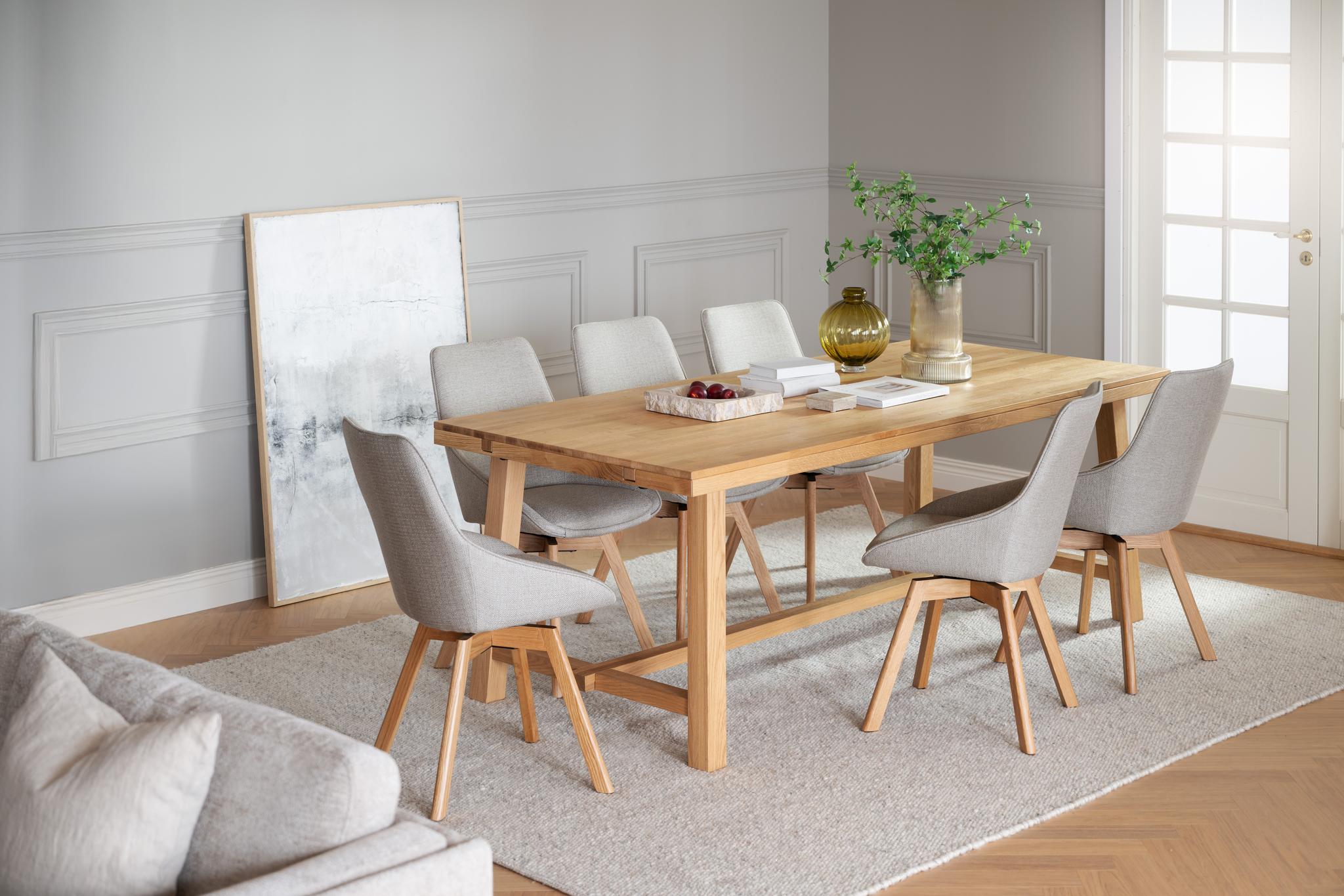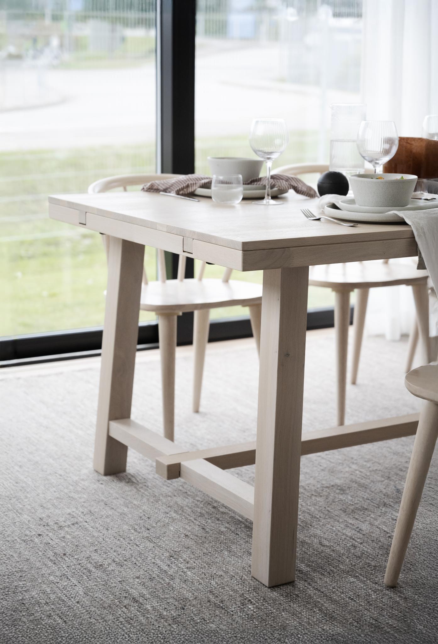 Matbord med rejäla mått i klassisk design och av hög kvalitet. Tillverkat i massiv, fingerskarvad, lackad europeisk ek. Bordsskivan har en borstad yta och kan kompletteras med 1 eller 2 tilläggsskivor a 50 cm.