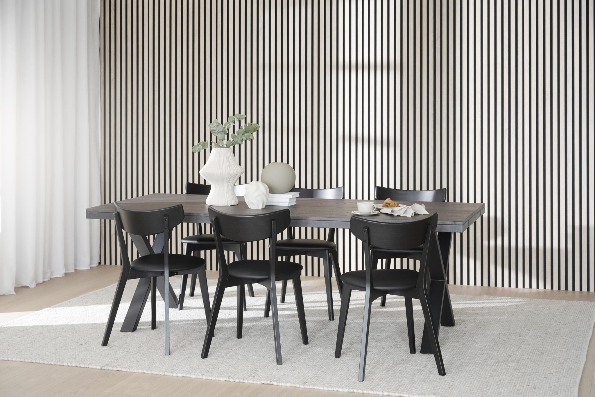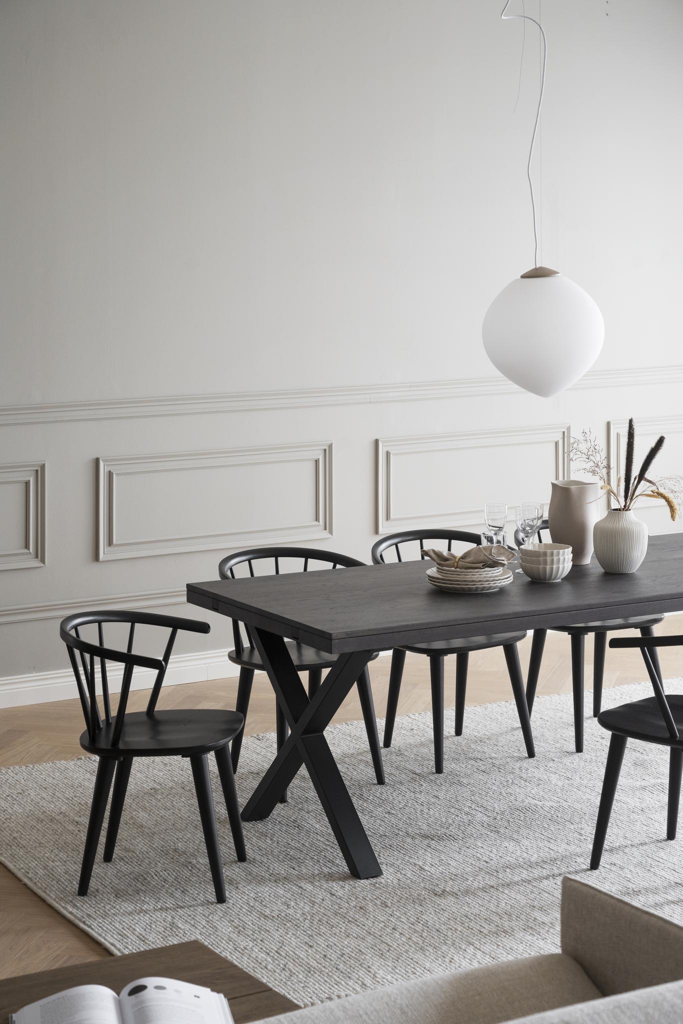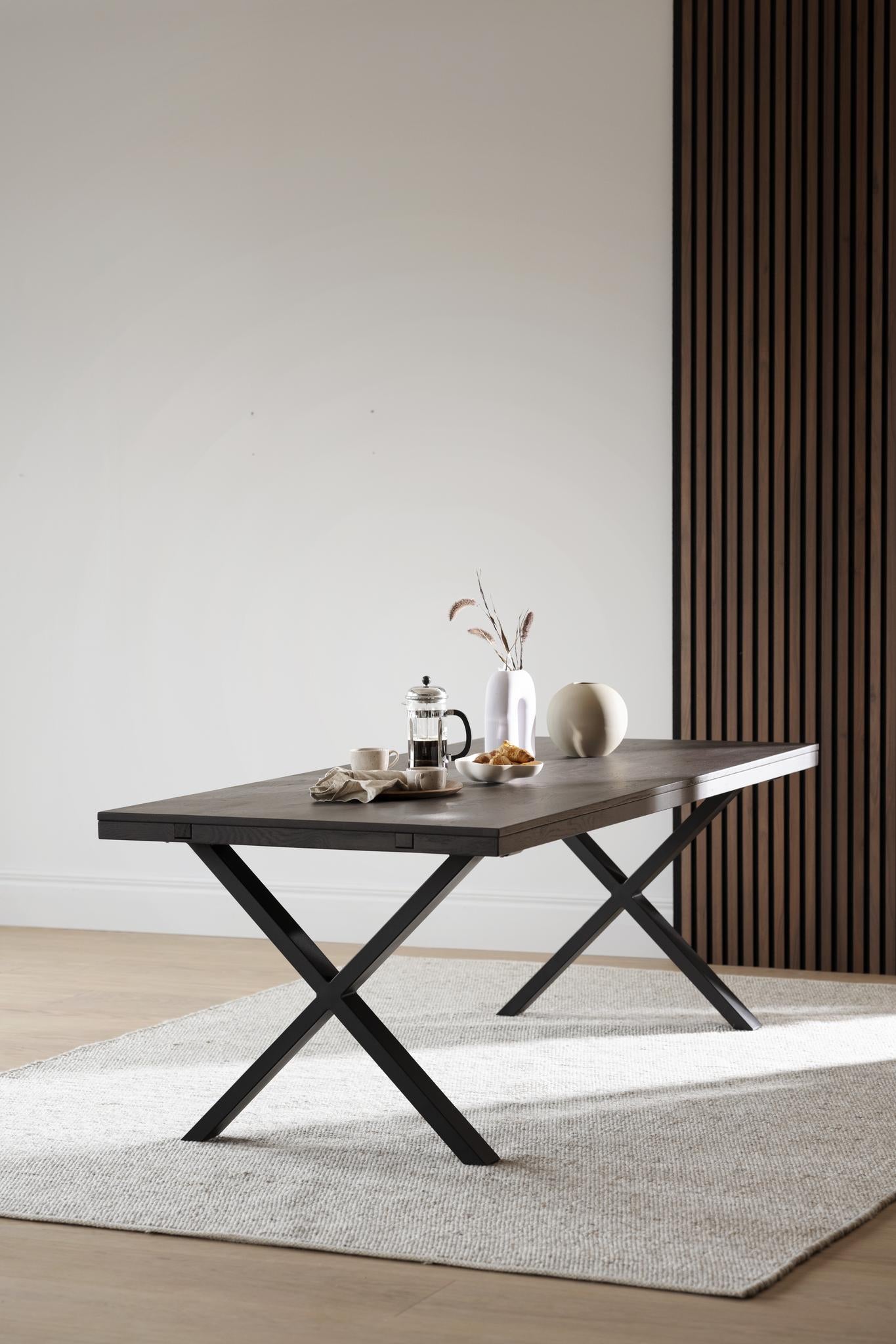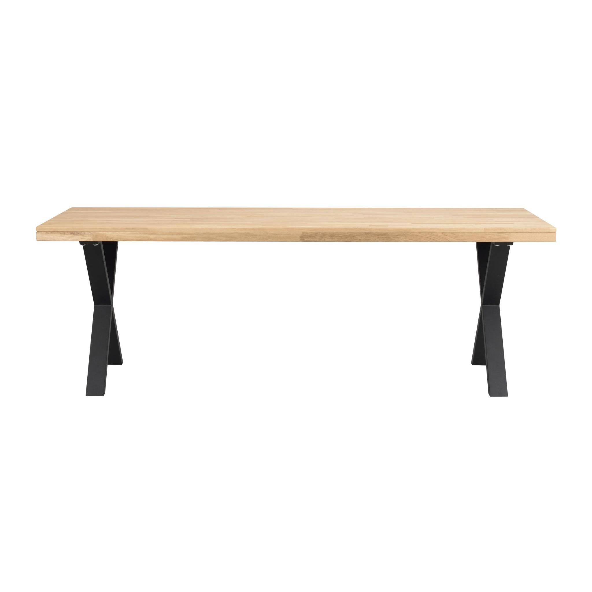 Brooklyn matbord i längden 220 cm med bordsskiva i lackad ek och med svarta X-ben i pulverlackad metall med sandstruktur. Bordsskivan är tillverkad i massiv, fingerskarvad, europeisk lackad ek. Skivan har en lätt borstad finish och kan kompletteras med 1 eller 2 tilläggsskivor a 50 cm. Matbordet ingår i den flexibla Brooklyn Serien - du kan själv genom tre enkla val utforma ditt matbord som just du vill ha det - välj färg/utförande, storlek och typ av underrede. I den breda Brooklyn Serien ingår även förvaring, soffbord och tv-bänk - samtliga delar är FSC®-certifierade.