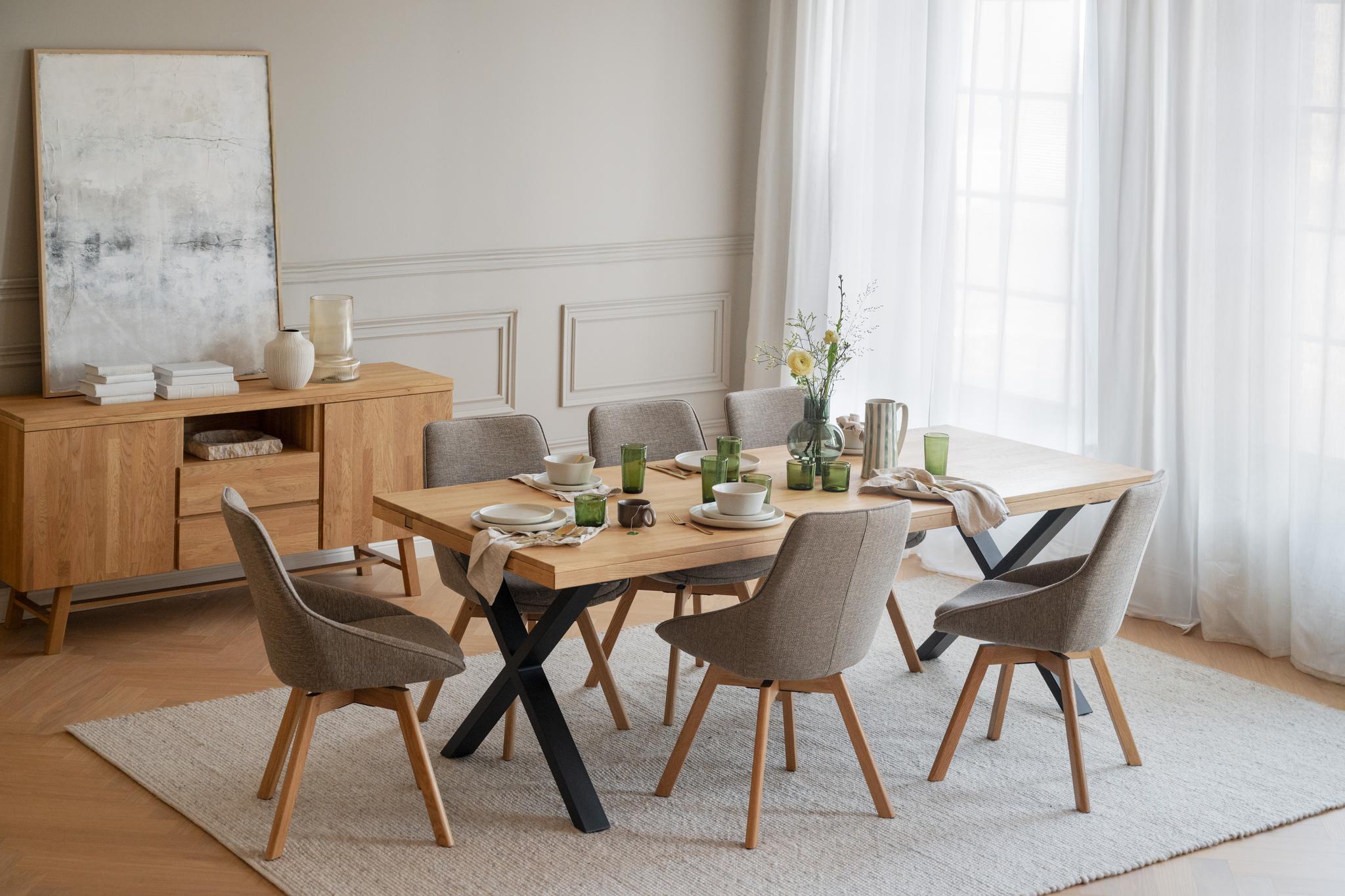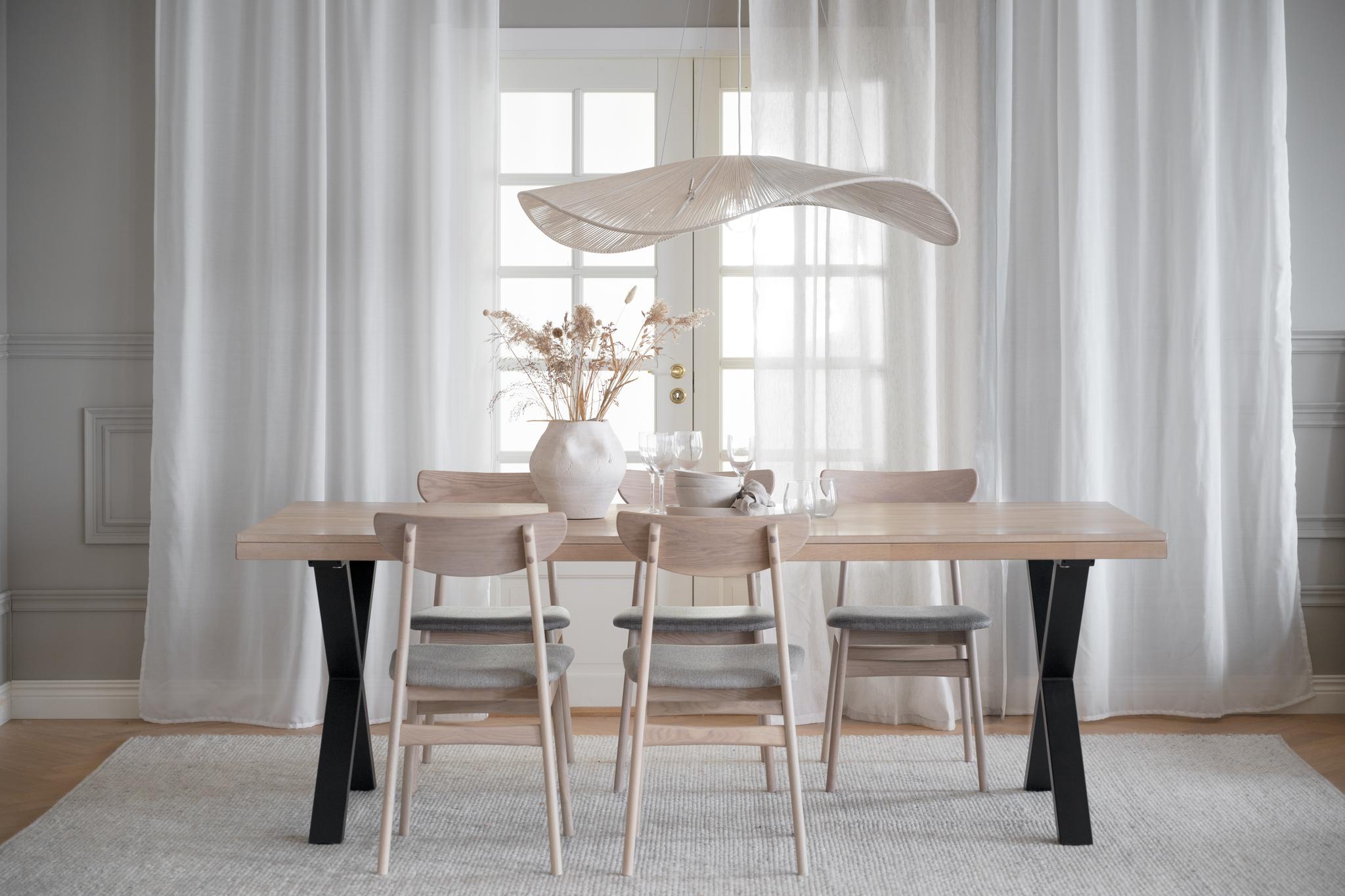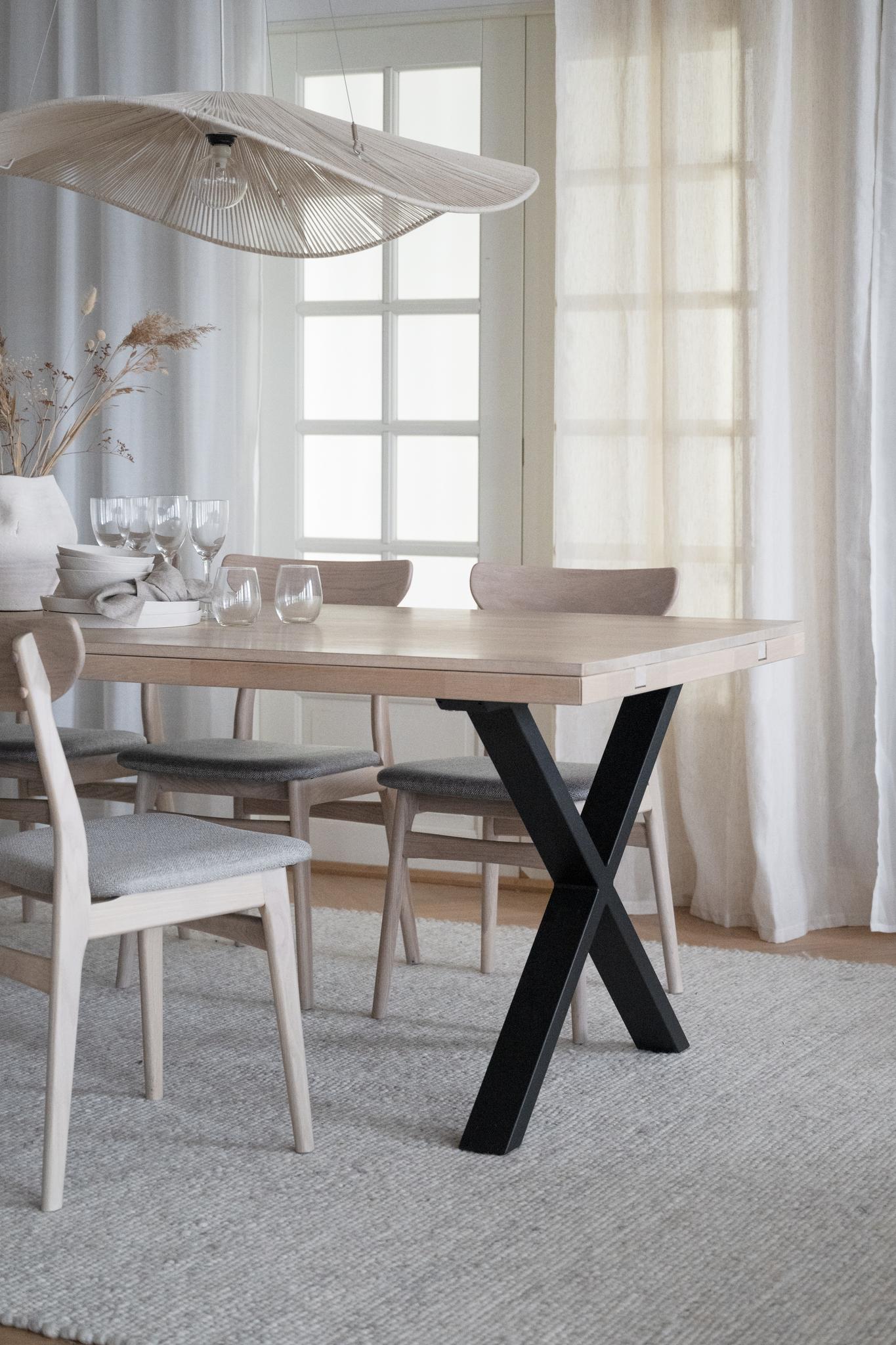 Massiv fingerskarvad Europeisk ek i borstat och lackat utförande. Utdragsreglar till tilläggsskivor i massiv ek. Ben i pulverlackad metall i sandstruktur.
