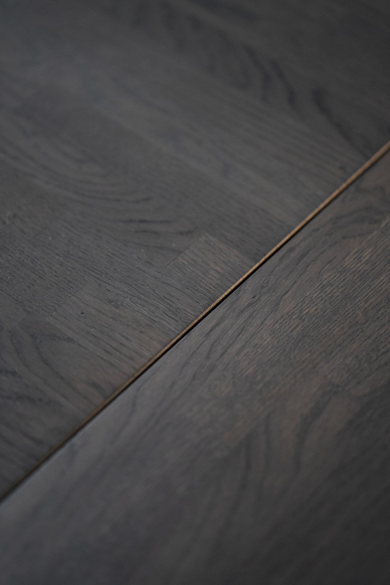 • Mörkgrå ekparkettgolv med synlig trästruktur och fog mellan plankorna
