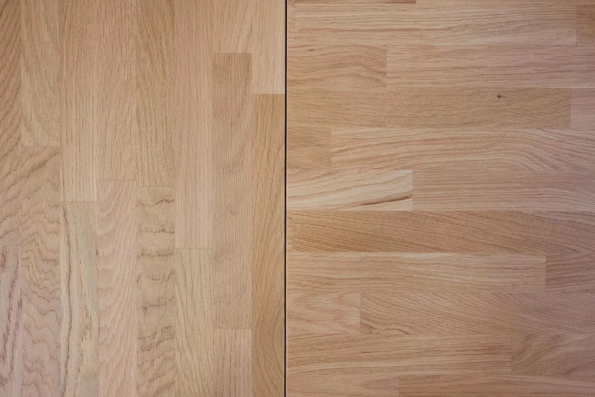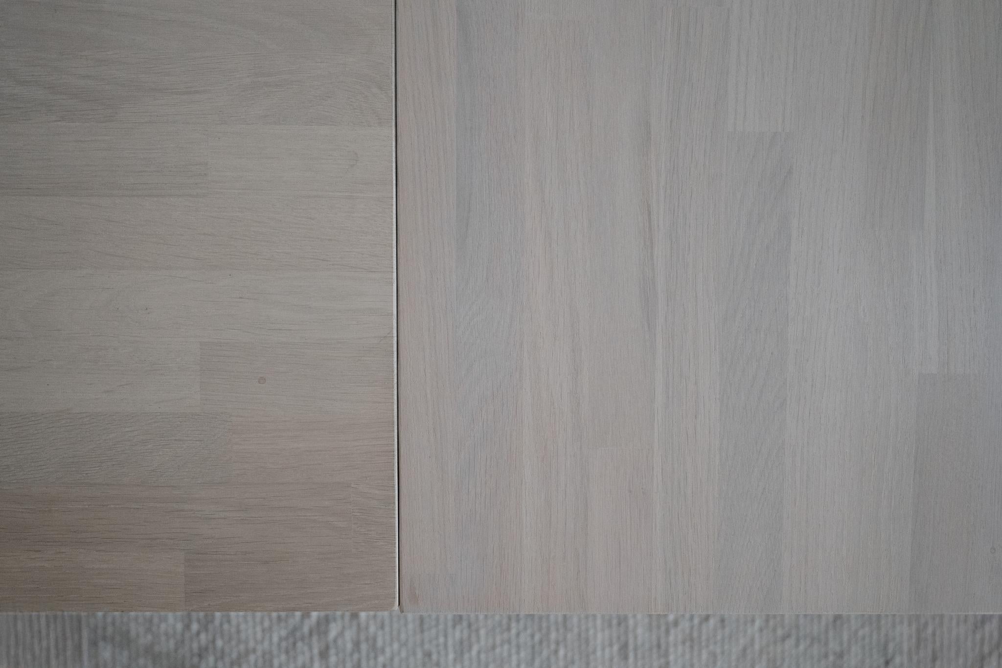 • Jämförelse av två träfärgade golvplankor i ljus och mellanmörk ek bredvid varandra