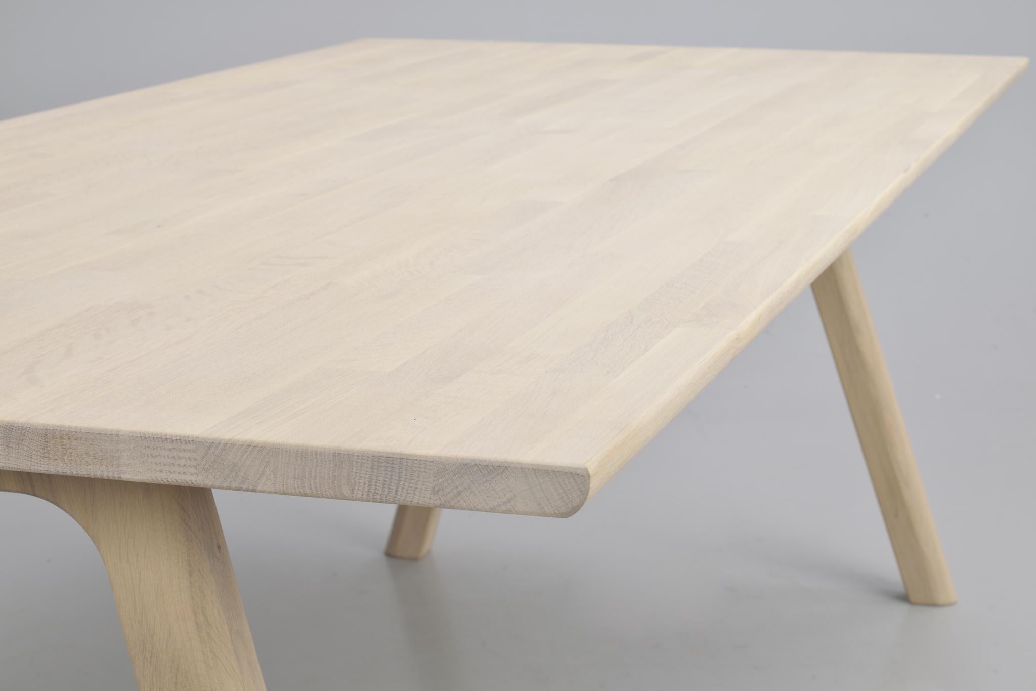 • Ljust träbord med rundade hörn och sneda ben i naturlig ek, närbild av bordsskiva och konstruktion