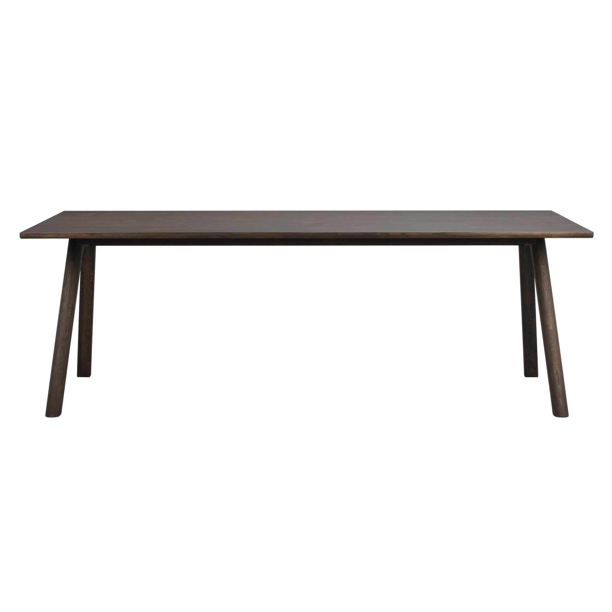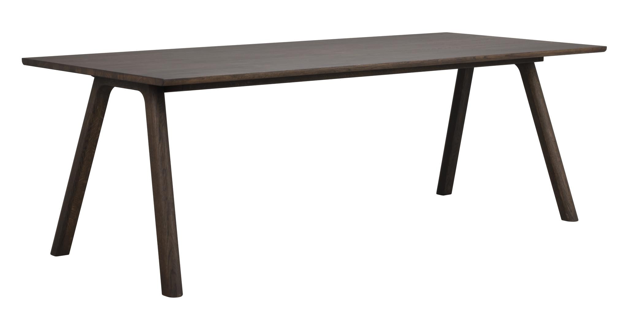 • Mörkbrun träbord med rektangulär skiva och snedställda ben i modern skandinavisk design