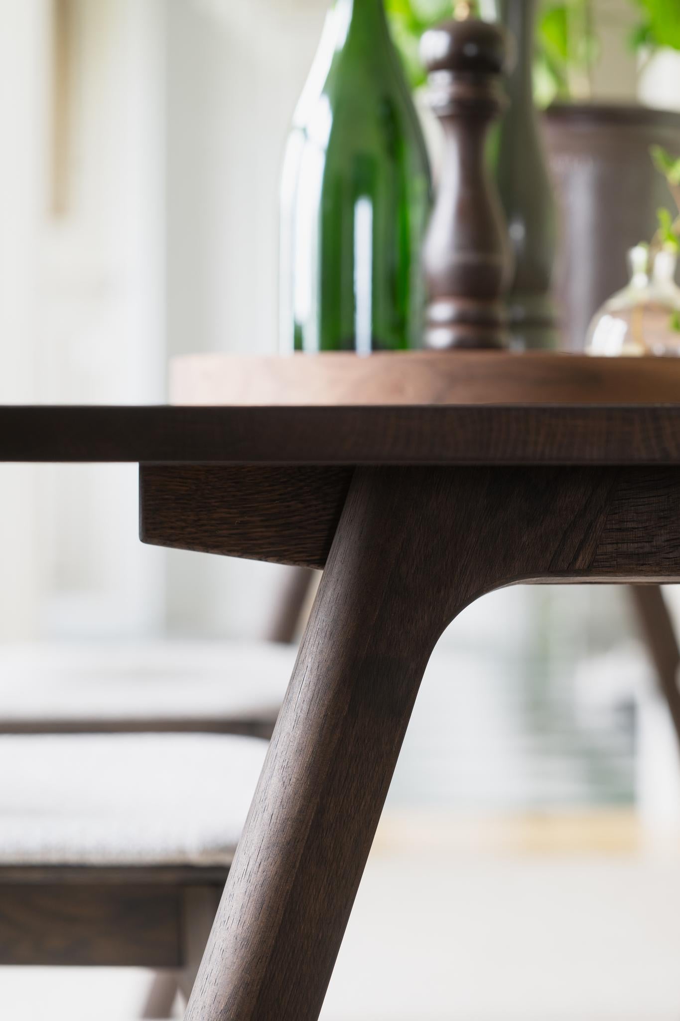 • Närbild på mörkbrun träbordsben med sned vinkel och synlig trästruktur, modern skandinavisk design
