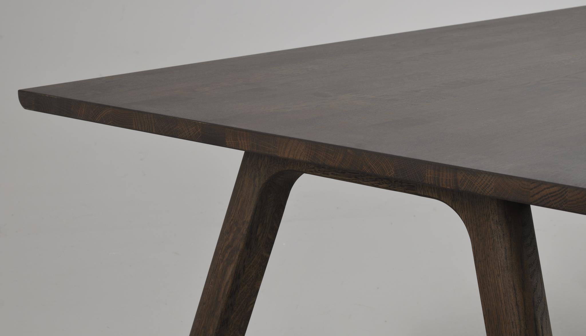 • Mörkbrun träbord med rektangulär skiva och sneda ben i modern skandinavisk design