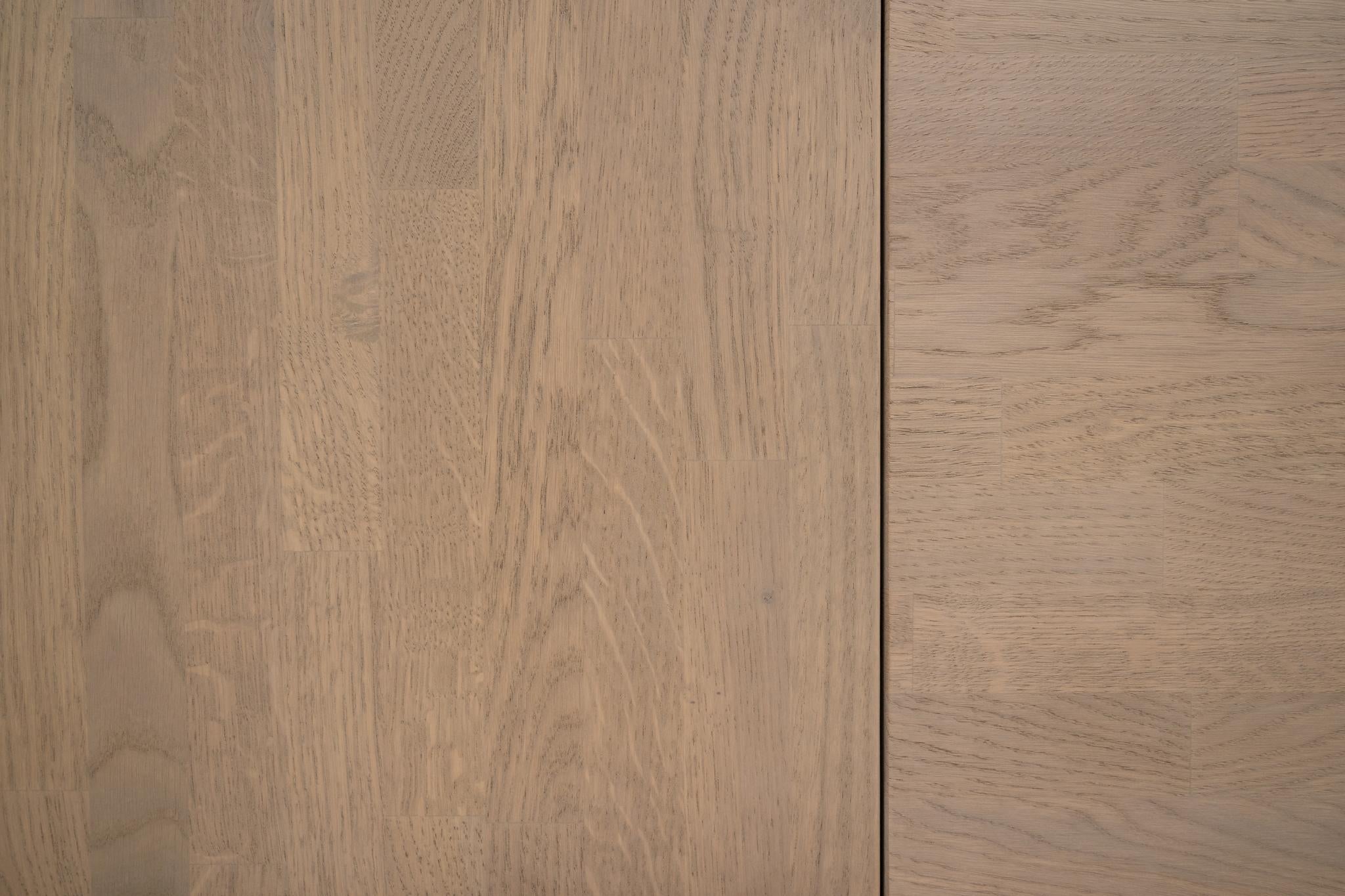 • Ljust trägolv i ek med naturlig trästruktur och synliga årsringar i två nyanser