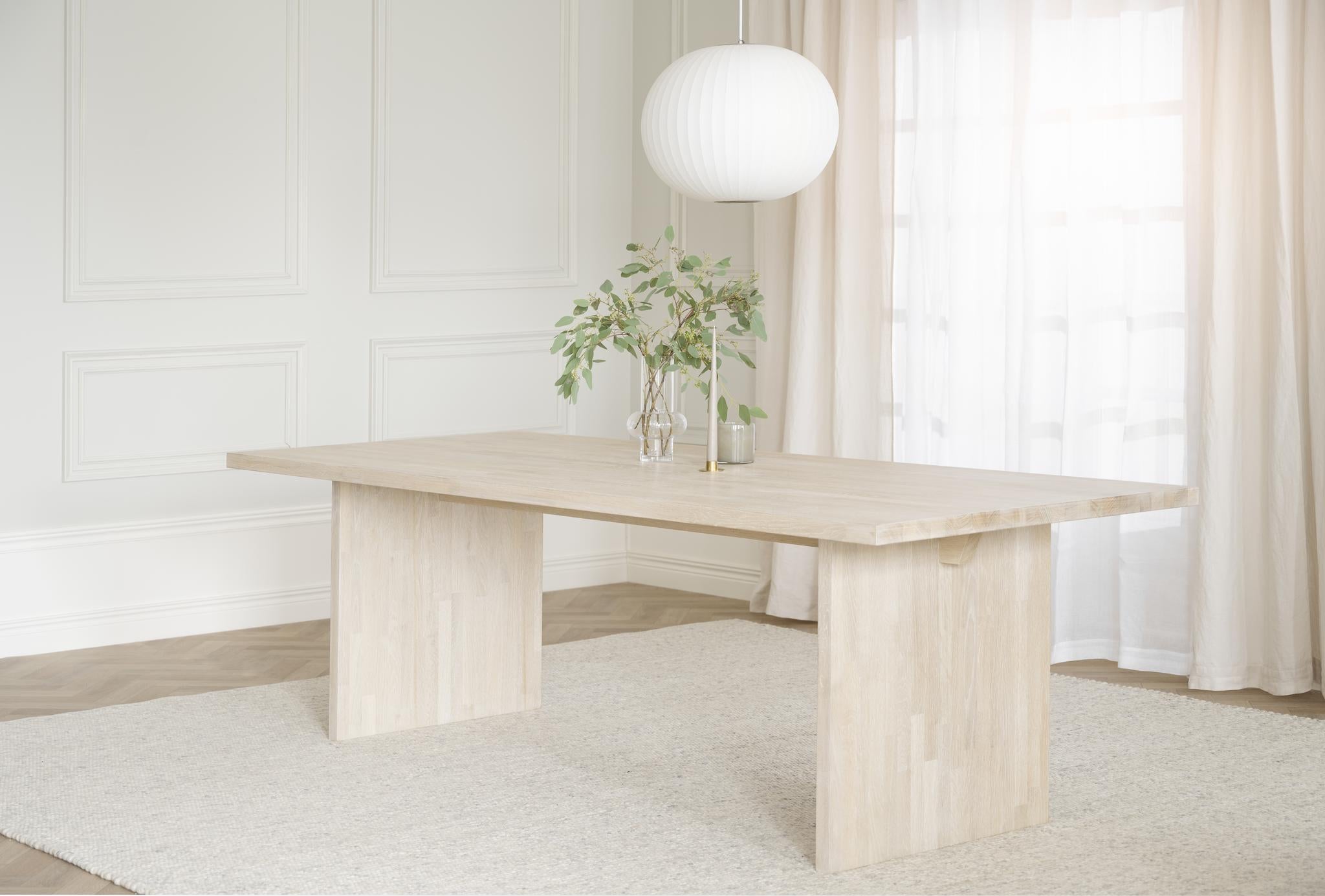 • Matbord i massiv ek med rektangulär skiva och två plankliknande ben i naturlig träfärg