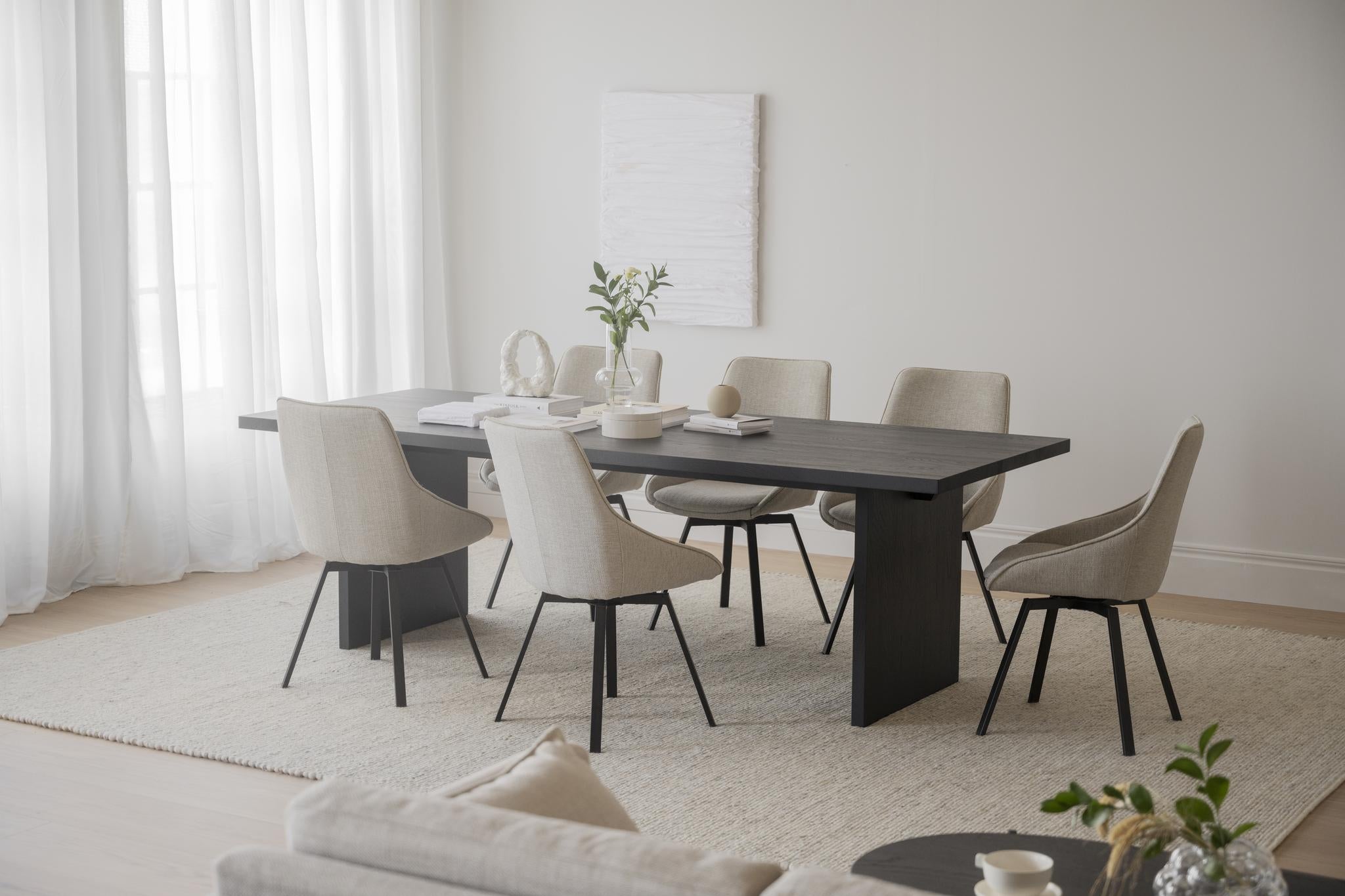 • Matgrupp med ljust träbord och svarta snurrbara stolar i modern matsal med vita gardiner