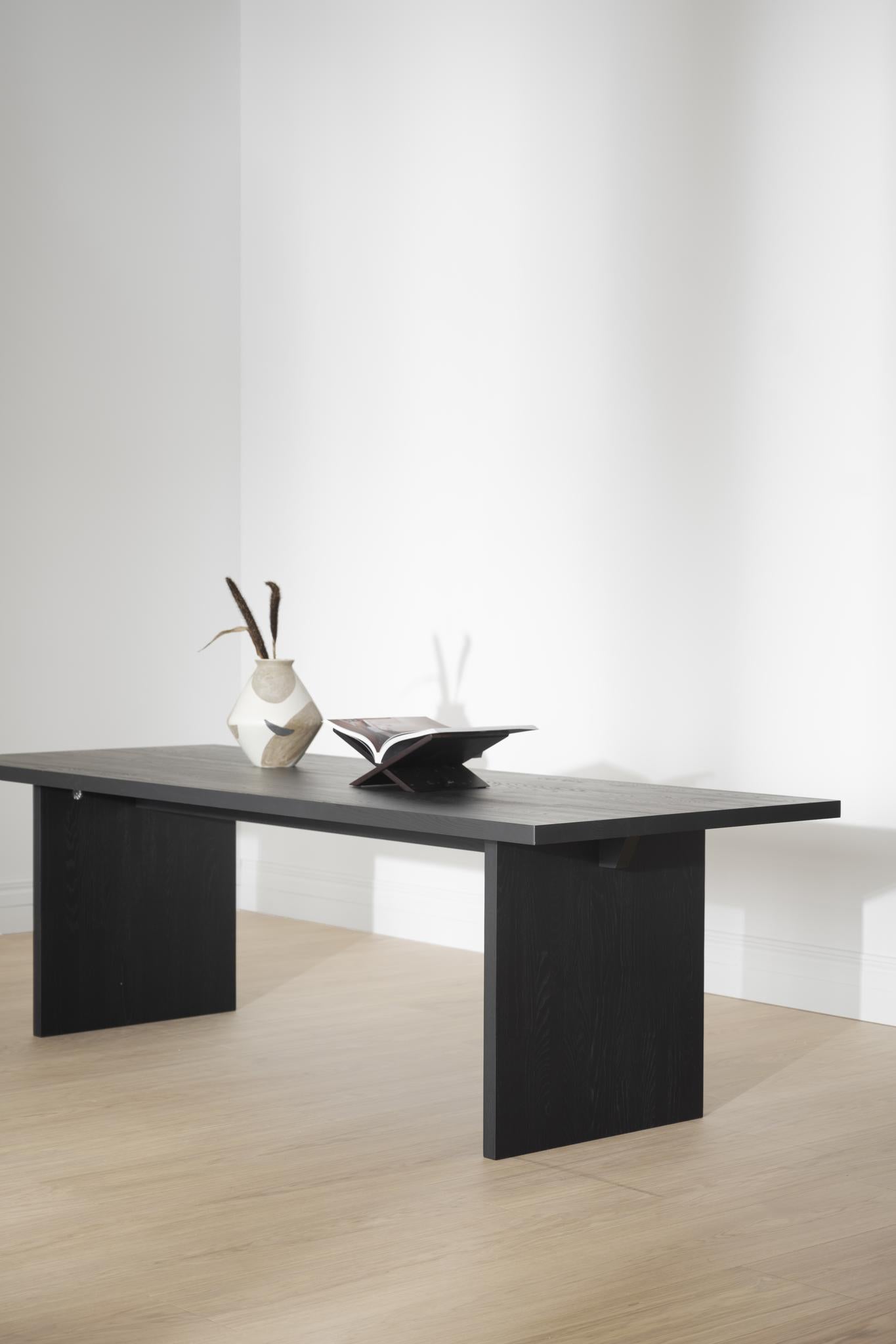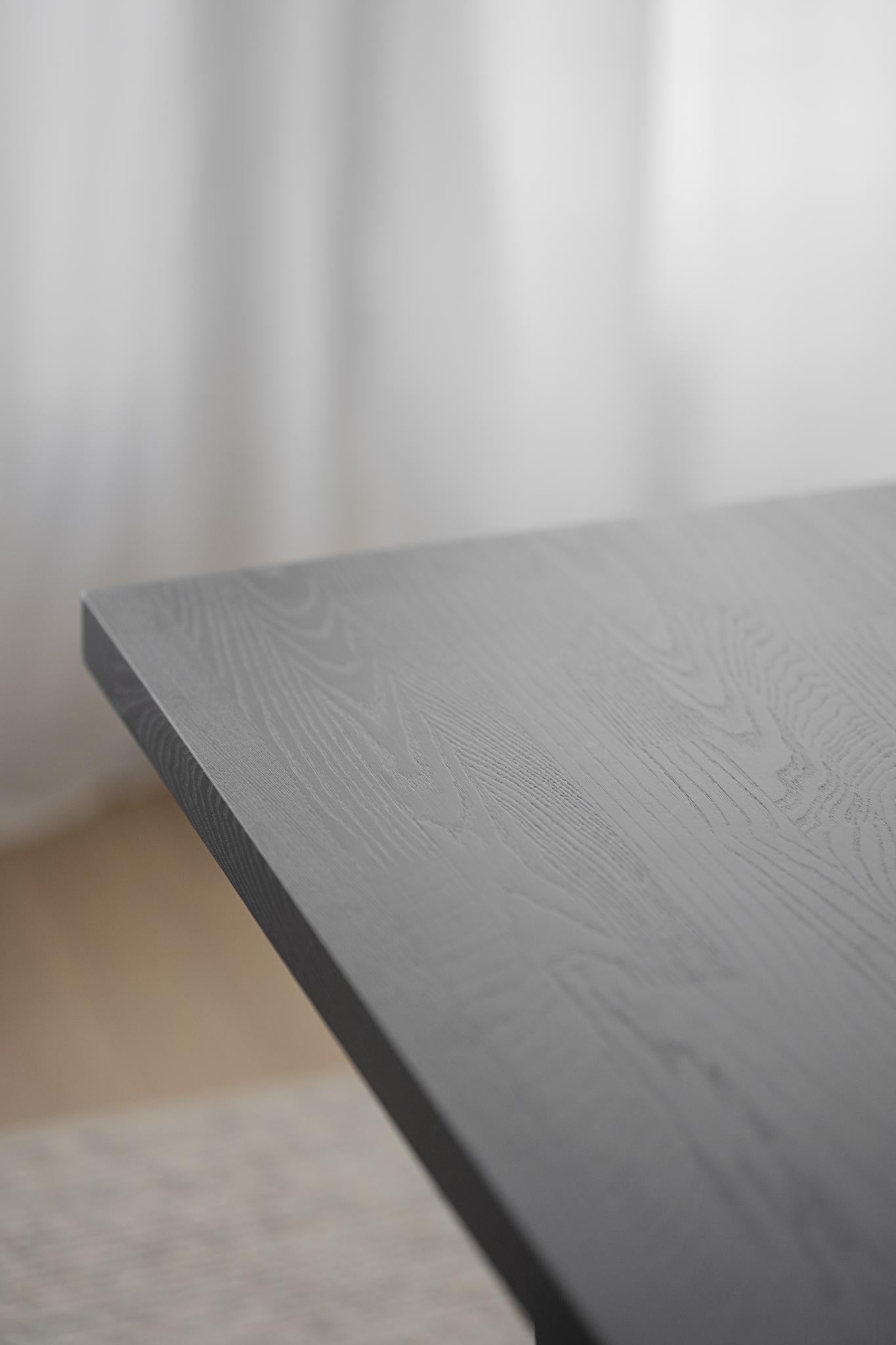 • Svart matbord i trä med rektangulär skiva och massiva plankben i modern design