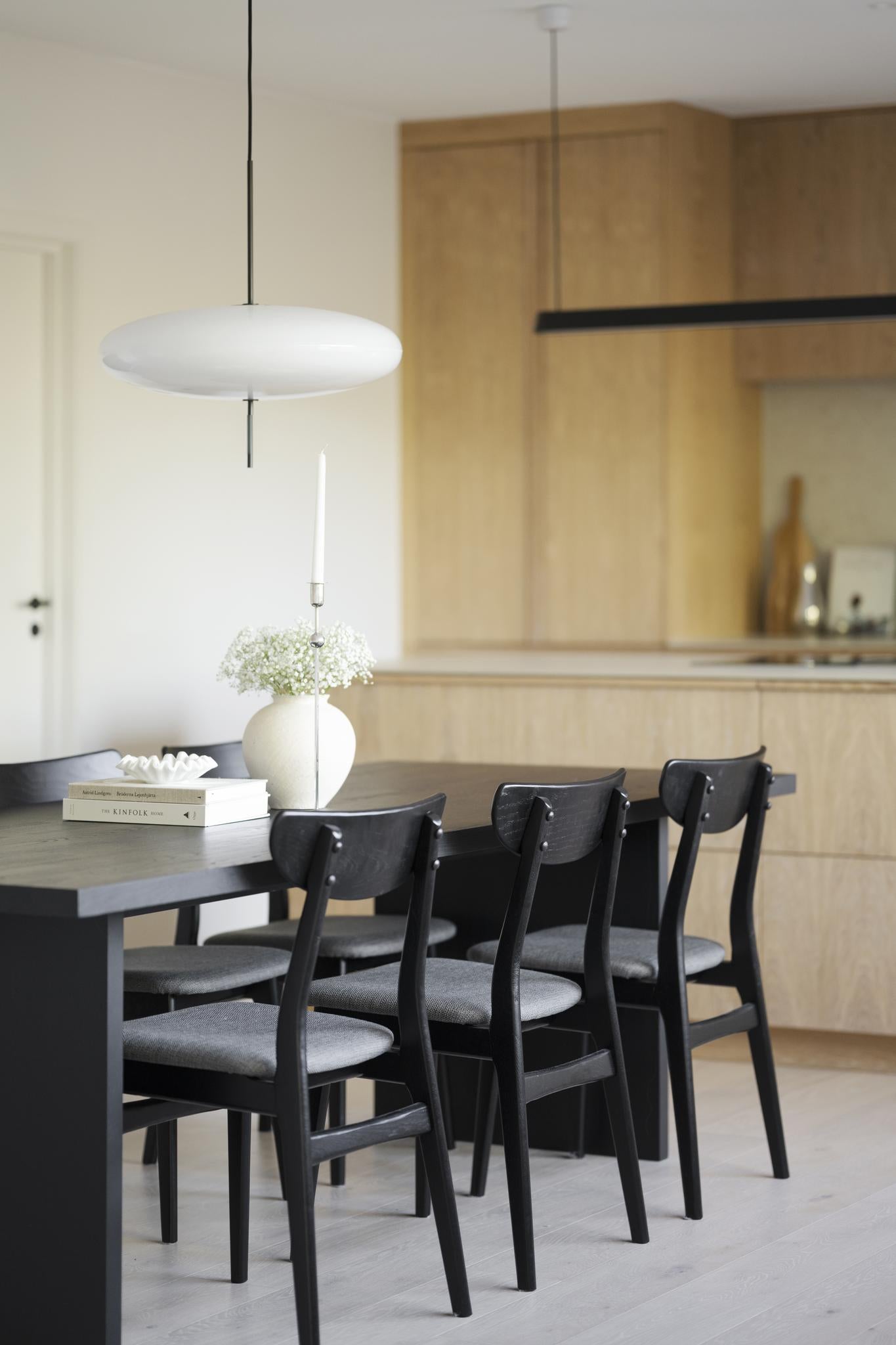 • Ljust kök med matplats, mörkt matbord i trä, beigea stolar och vågformad taklampa