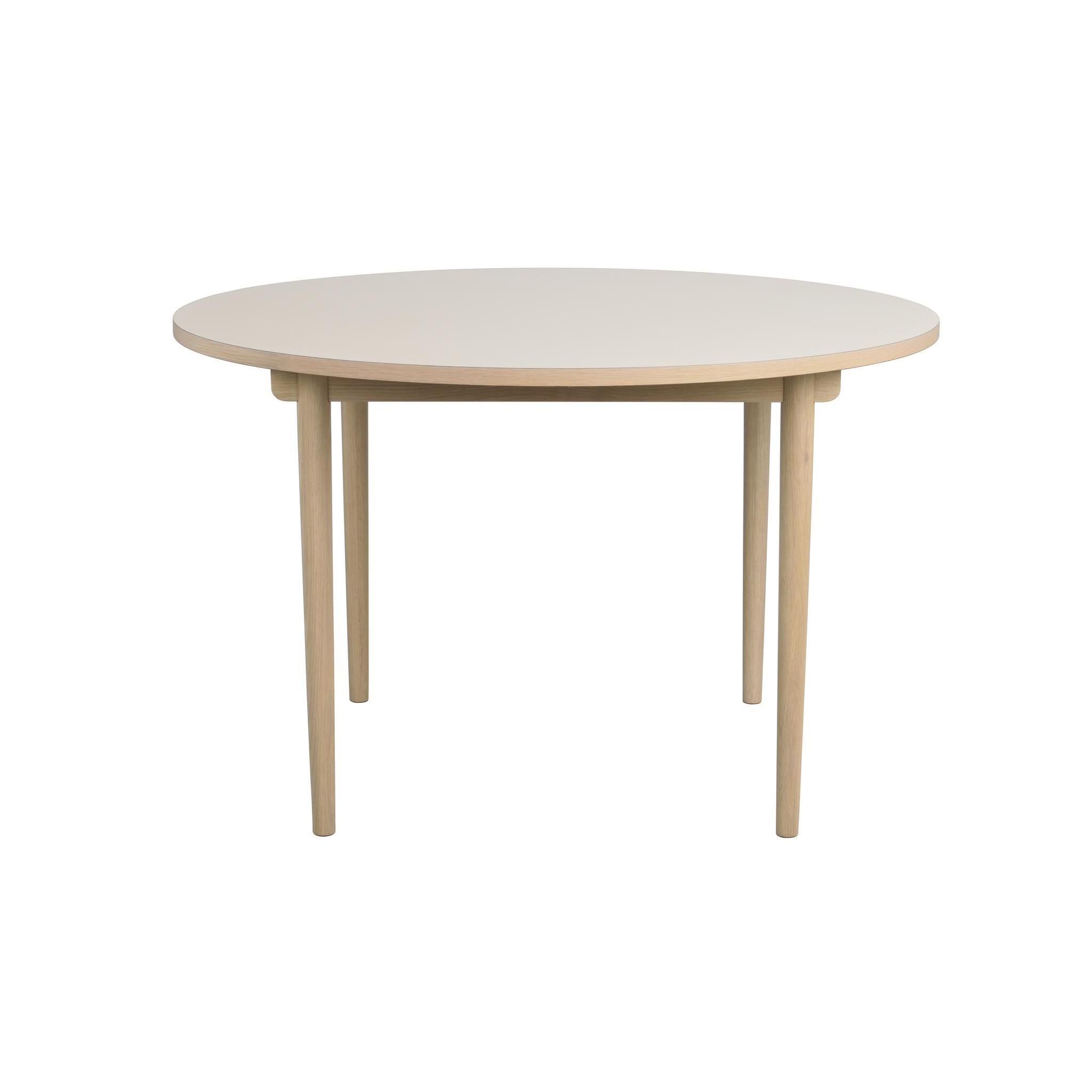 • Runt matbord i ljust trä med fyra ben och enkel skandinavisk design