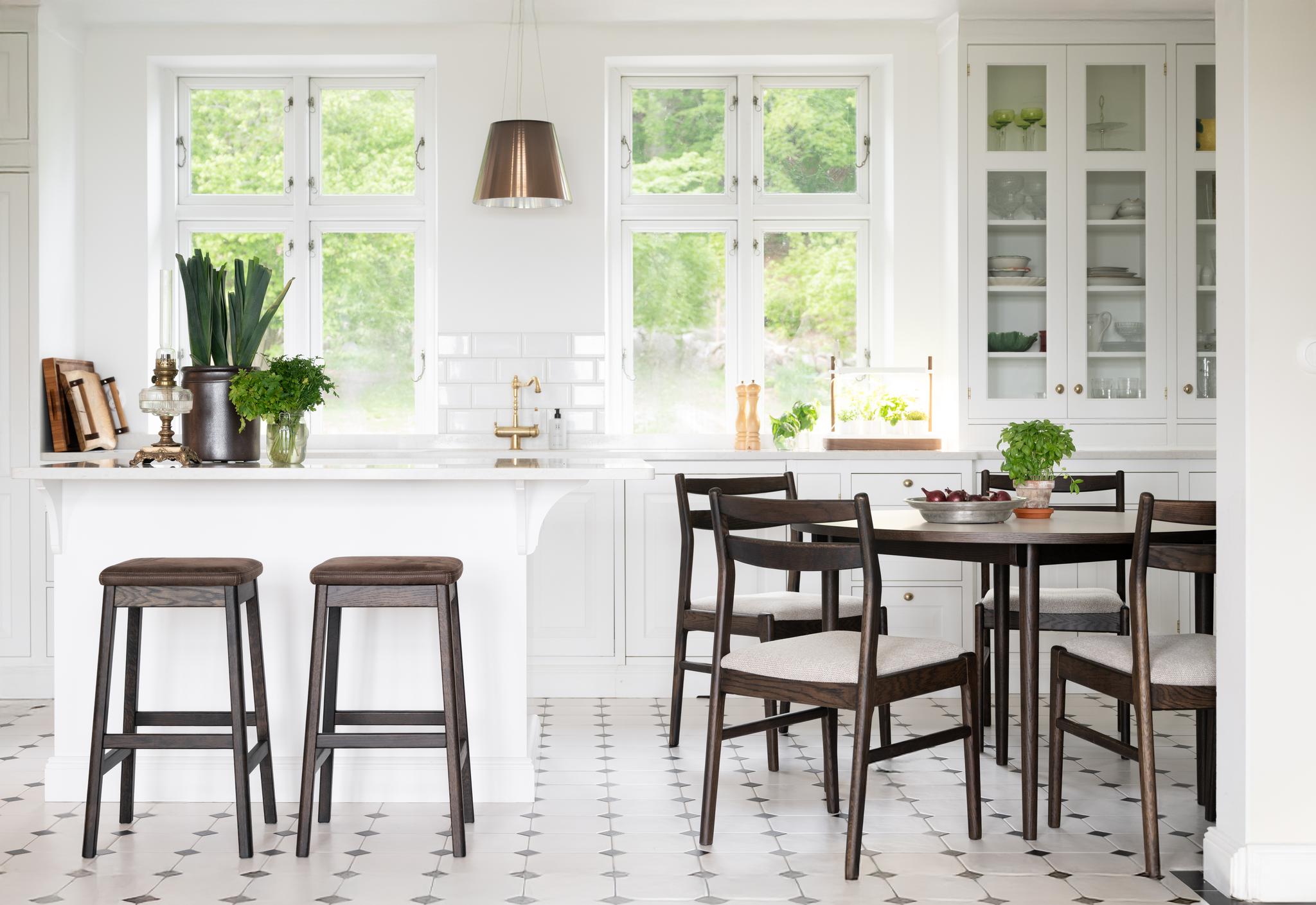 • Ljust kök med vita skåp, barstolar, matbord i mörkt trä och glasdörrar med vitrinskåp
