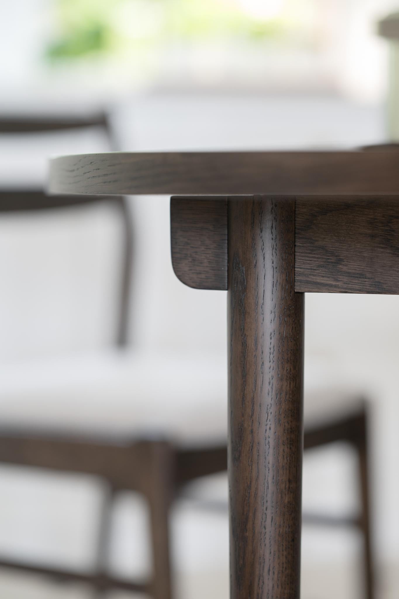 • Närbild på möbelskarv i mörkt trä där bordsskiva möter cylindriskt ben med synlig trästruktur