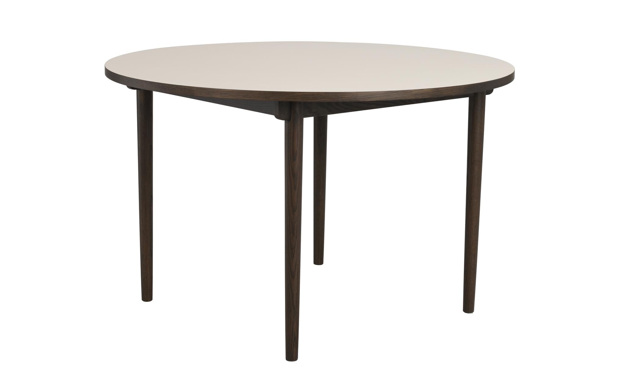 • Runt matbord med ljus skiva och mörka träben, modernt skandinavisk design