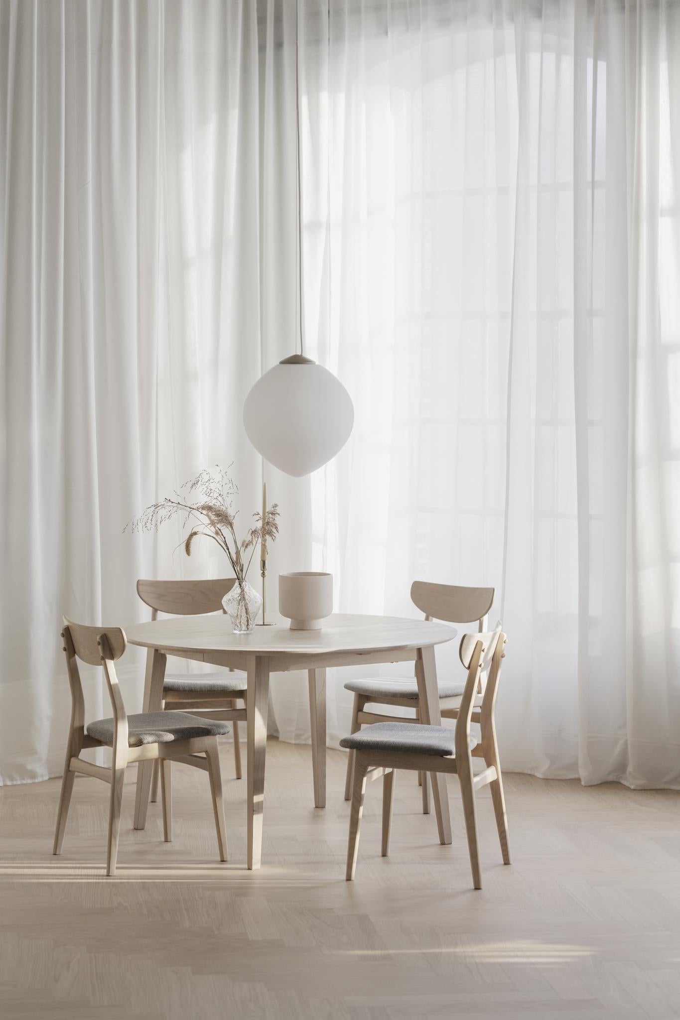 • Rund matgrupp i ljust trä med fyra stolar och grå dynor under vit taklampa i minimalistisk matsal