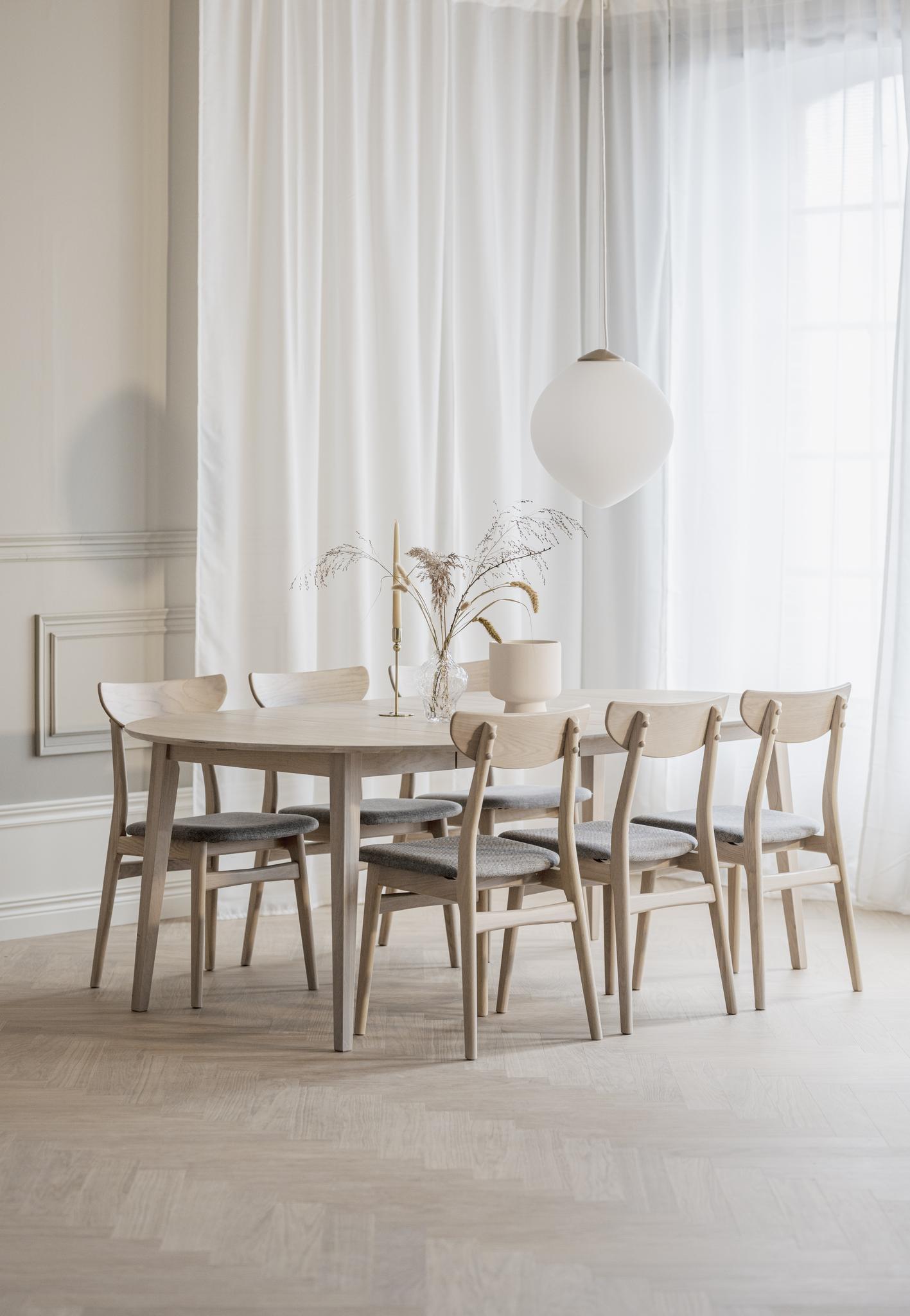 • Ljus matplats med ovalt matbord i ljust trä och sex stolar med grå dynor i skandinavisk stil
