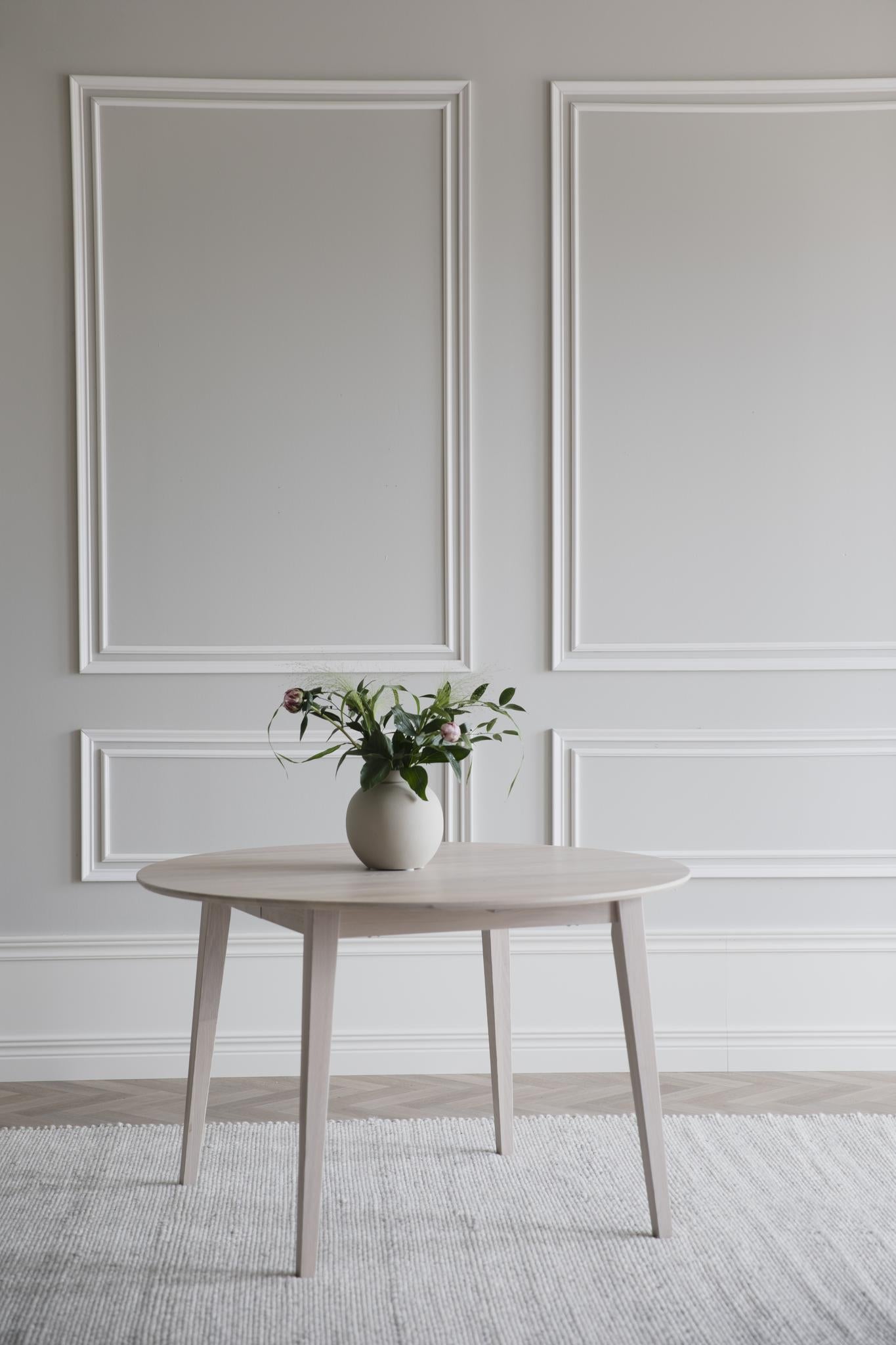 • Runt matbord i ljust trä med vas och blommor, placerat på vit matta mot vägg med vit inramning