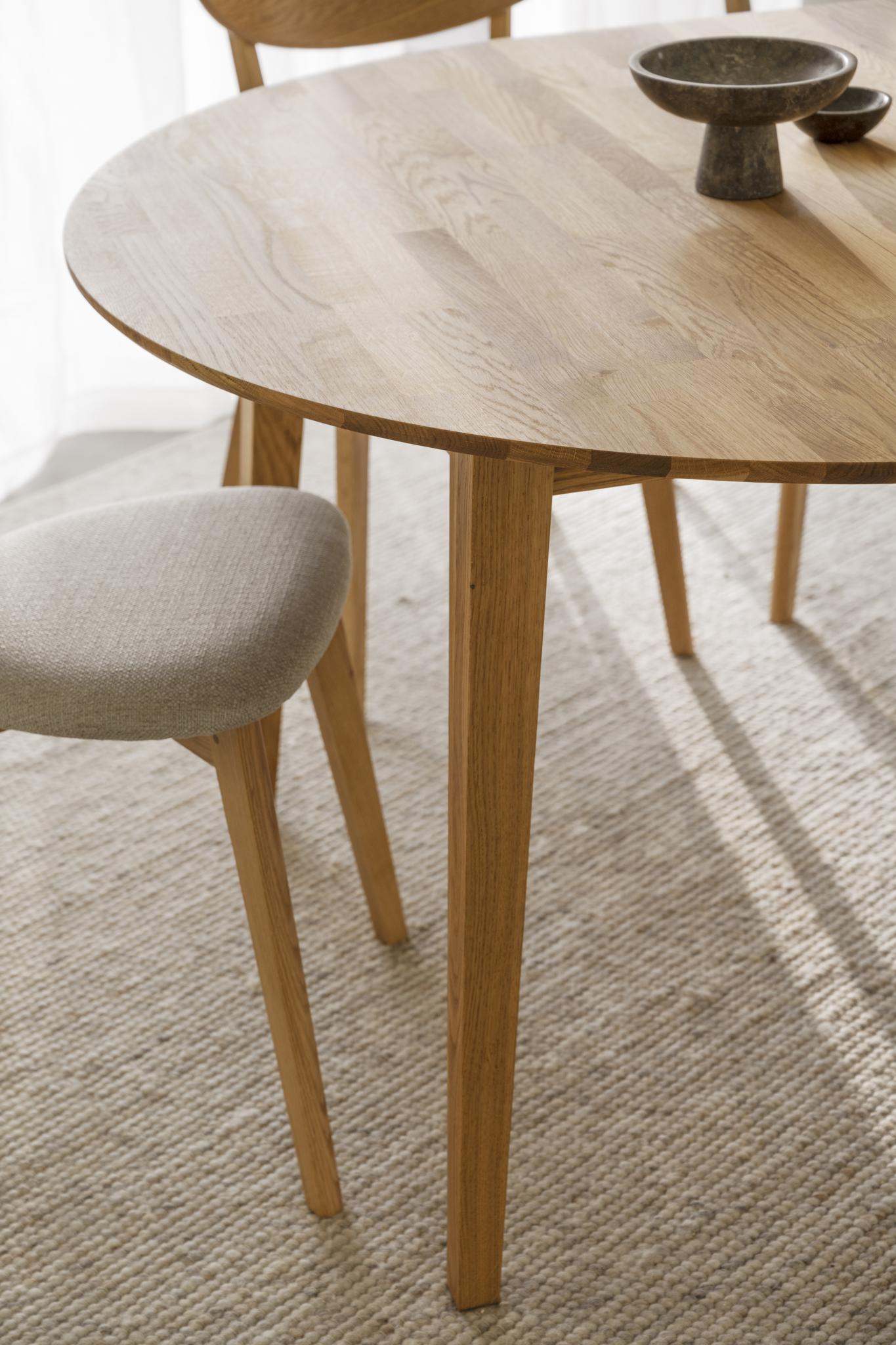 • Runt matbord i ljus ek med fyra ben i modern skandinavisk design