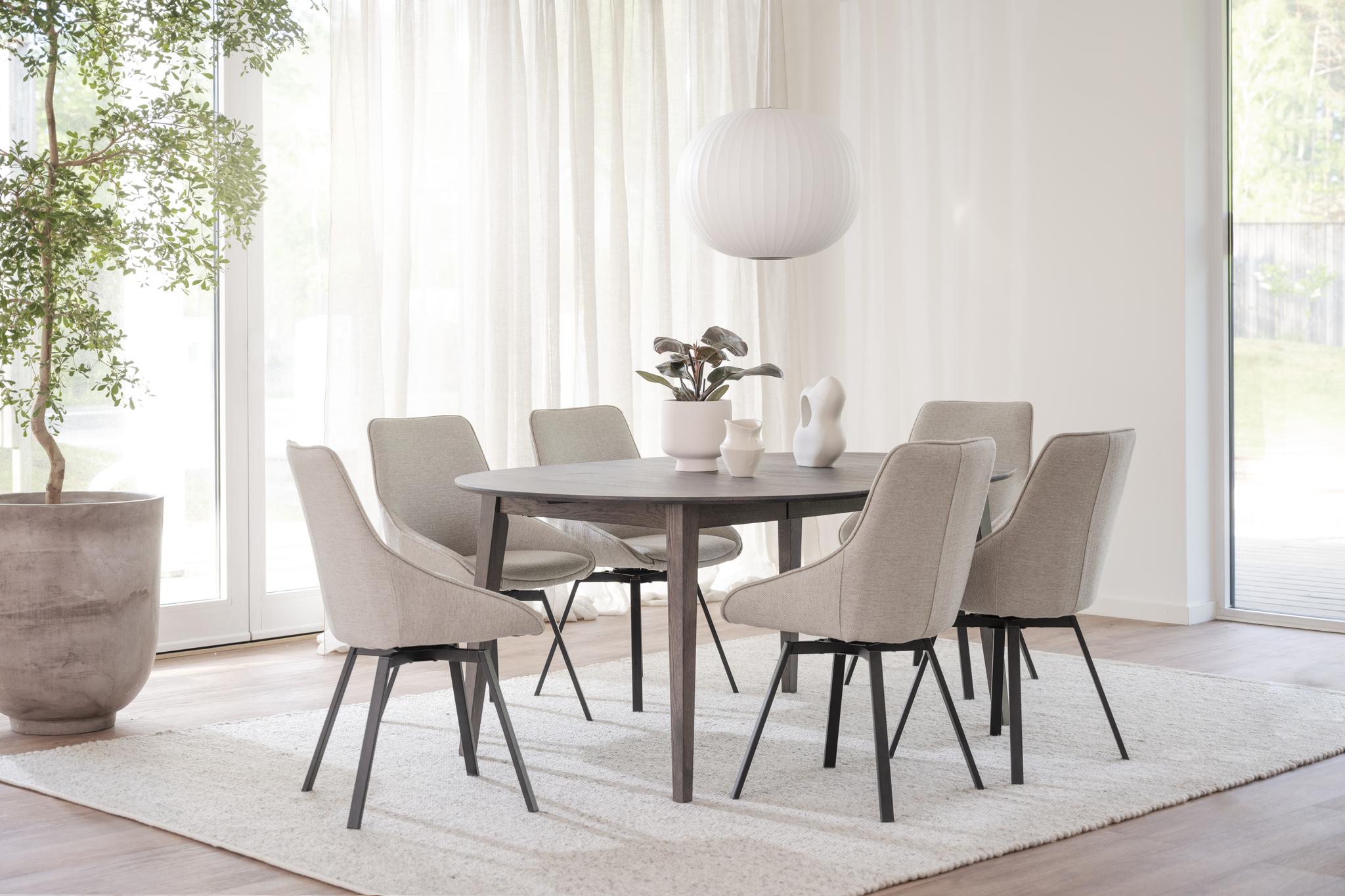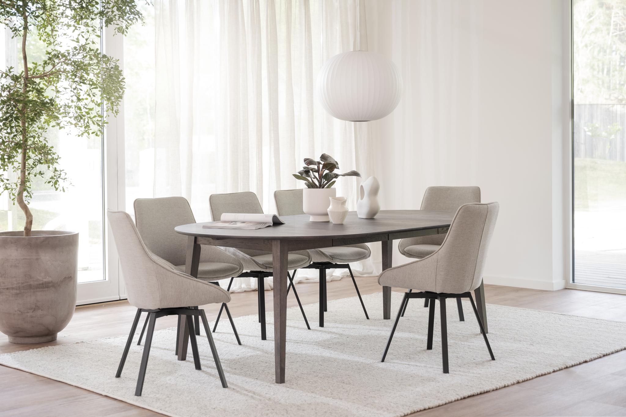 • Runt matbord i grå ek med utdragsskiva och fyra ben i klassisk skandinavisk design