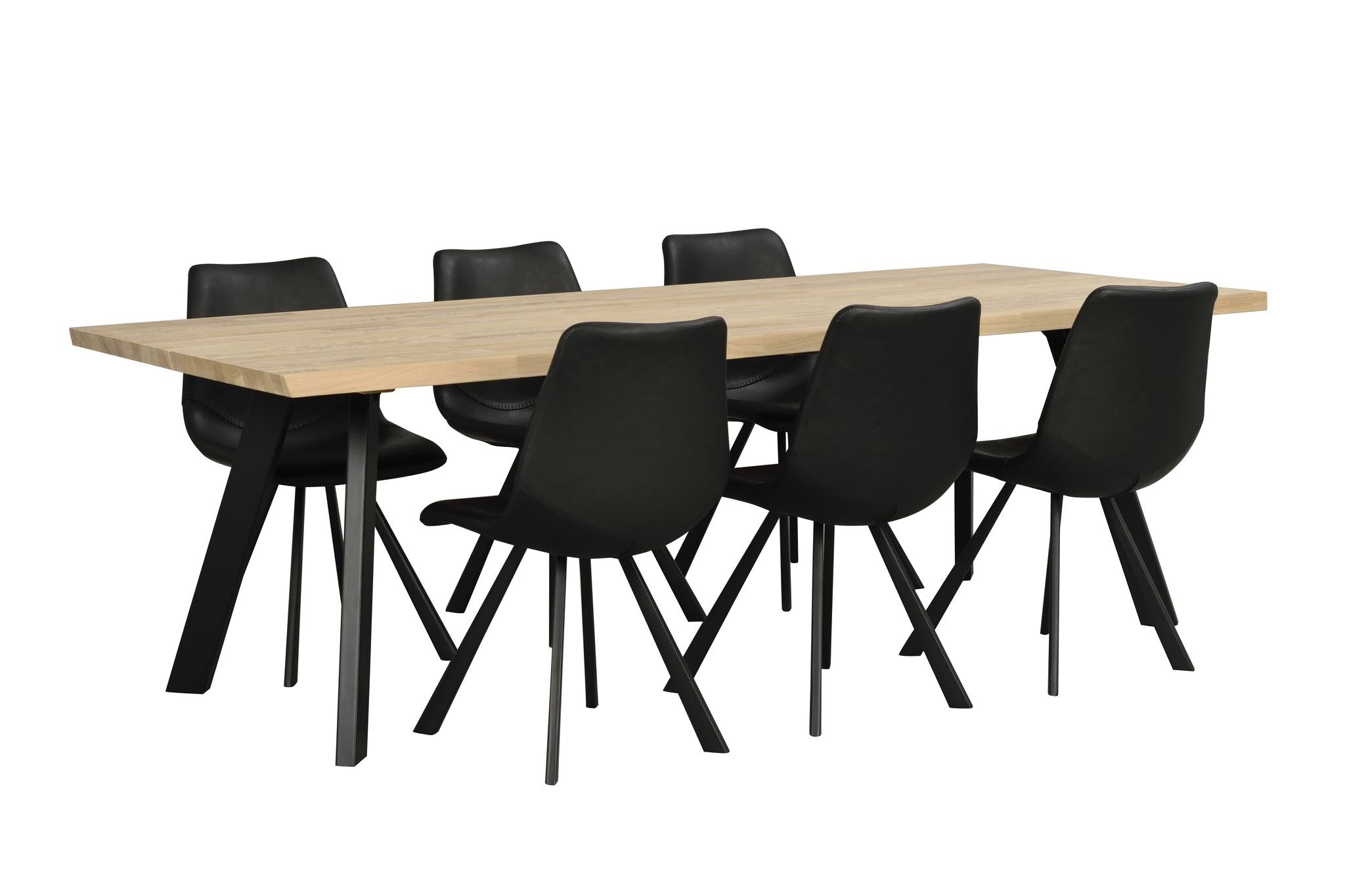 • Matbord med ljus träskiva och svarta snedställda metallben i modern skandinavisk design