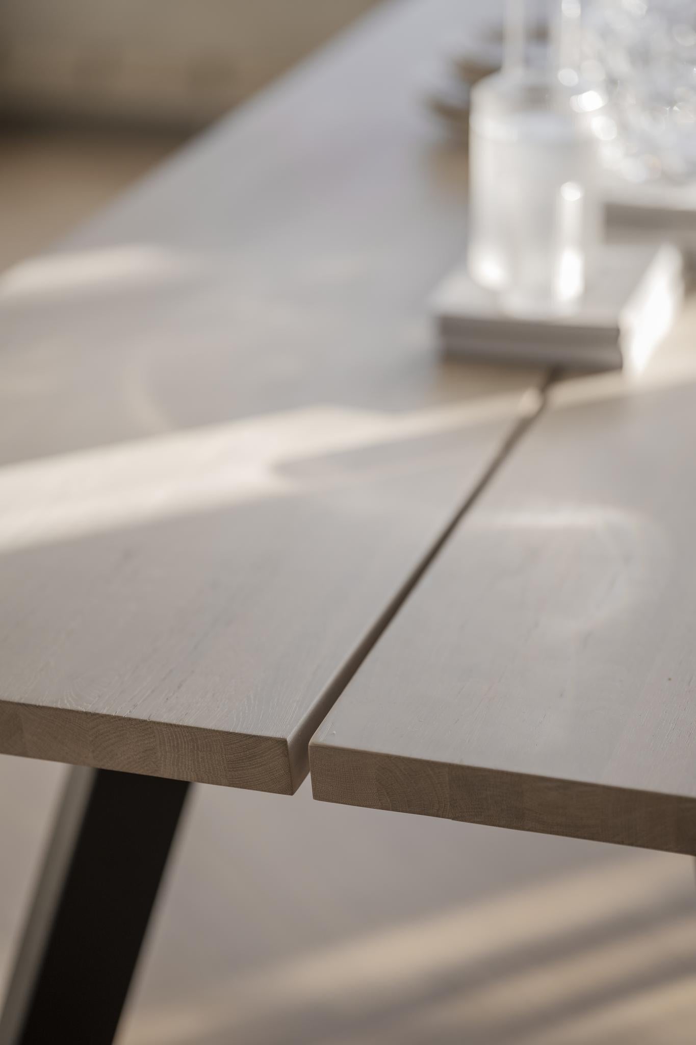 • Utdragbart matbord i ljust trä med synlig fog mellan skivorna och svarta metallben