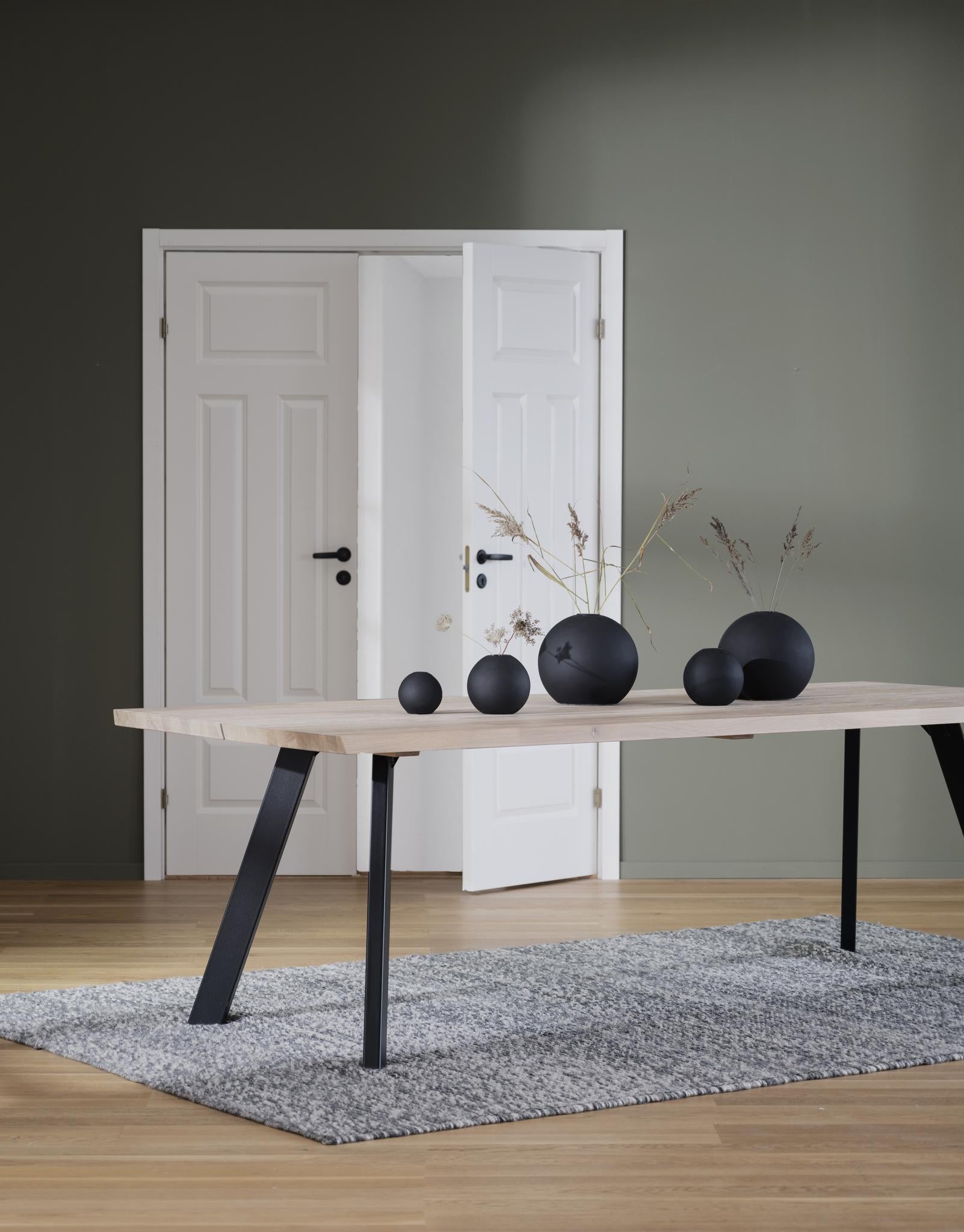 • Matbord i ljust trä med svarta metallben och matchande svarta dekoration på grå matta i modernt hem