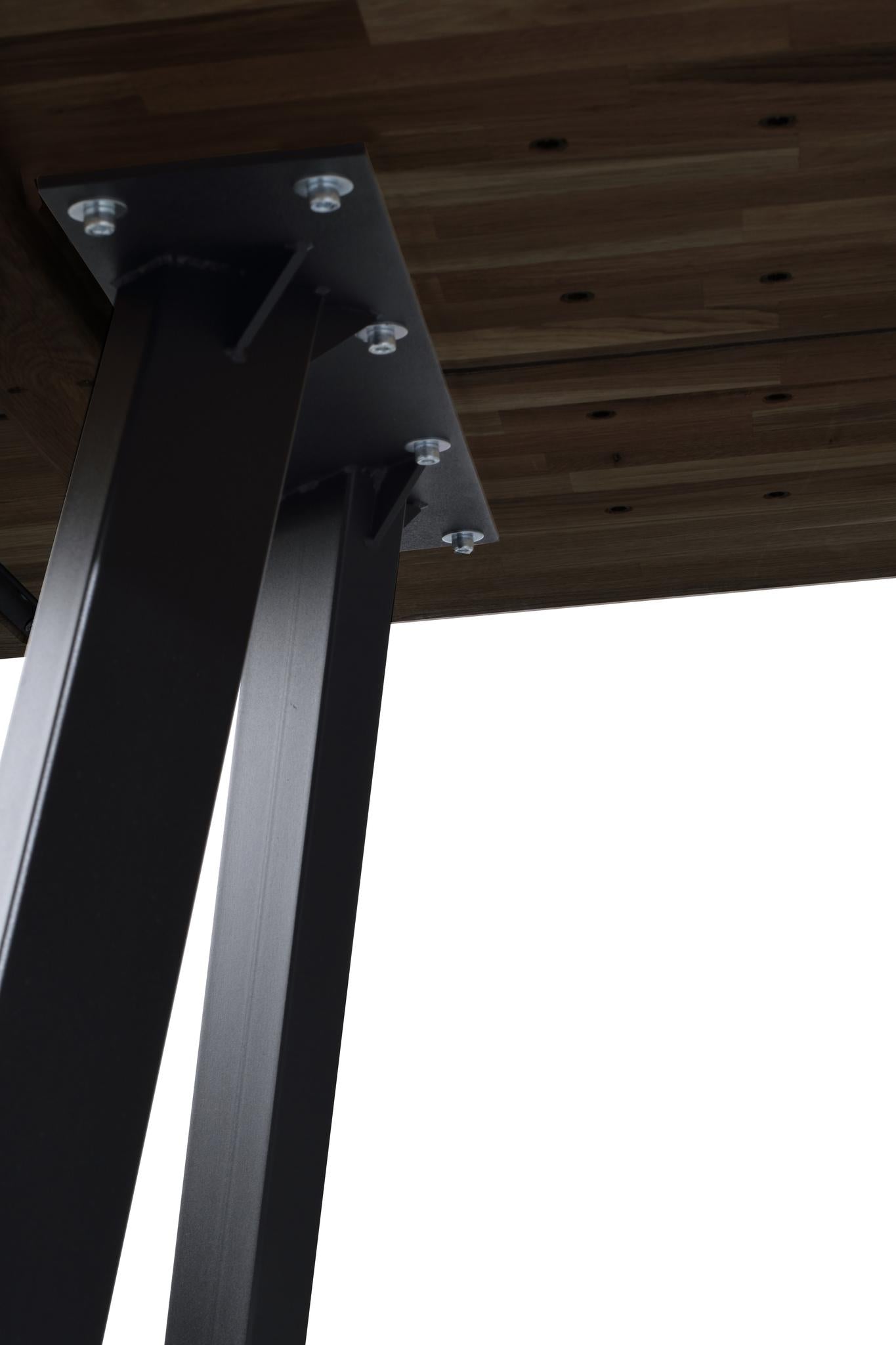 • Svart metallbordsben i industriell stil monterat under träskiva med synliga skruvar