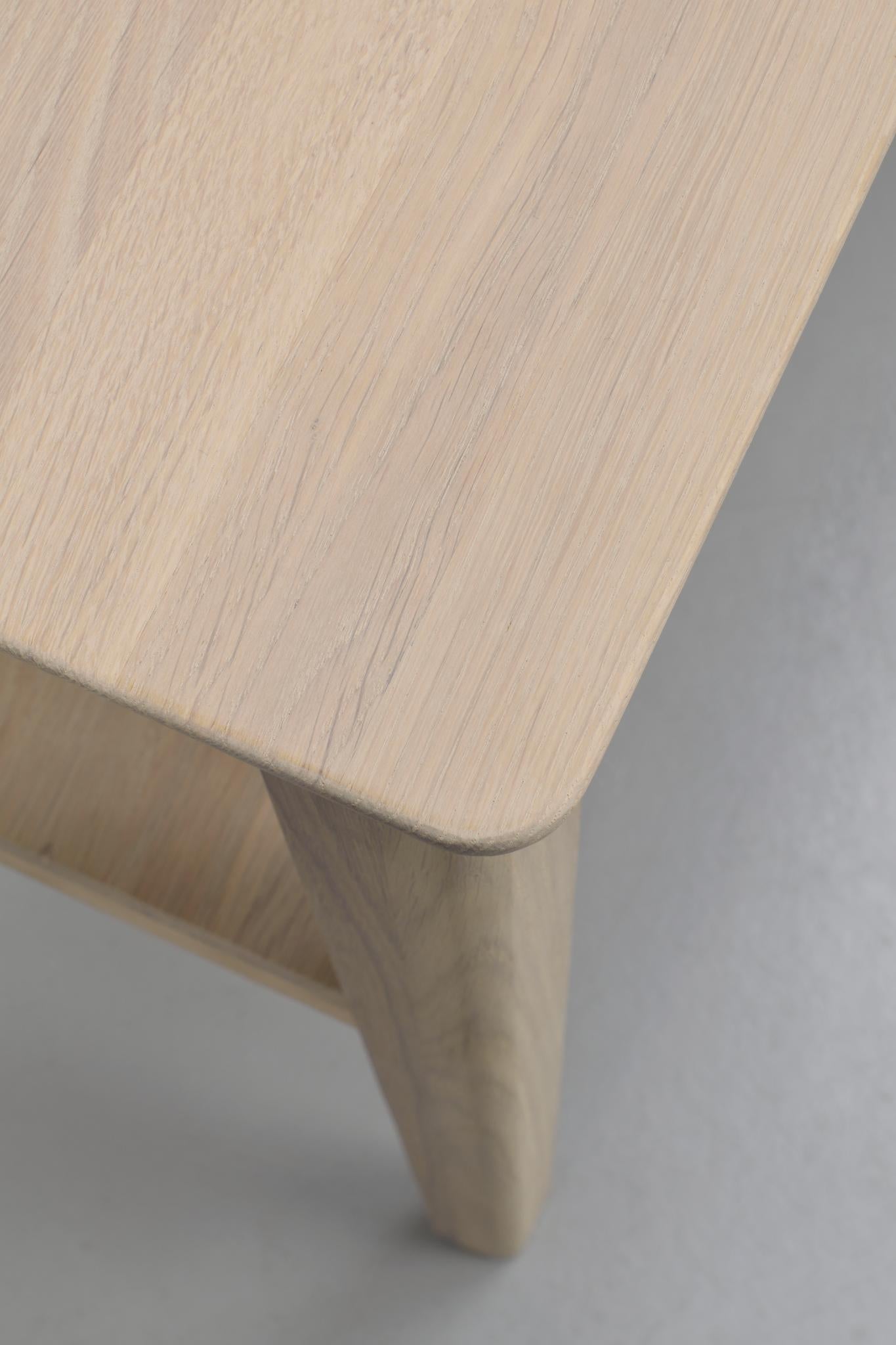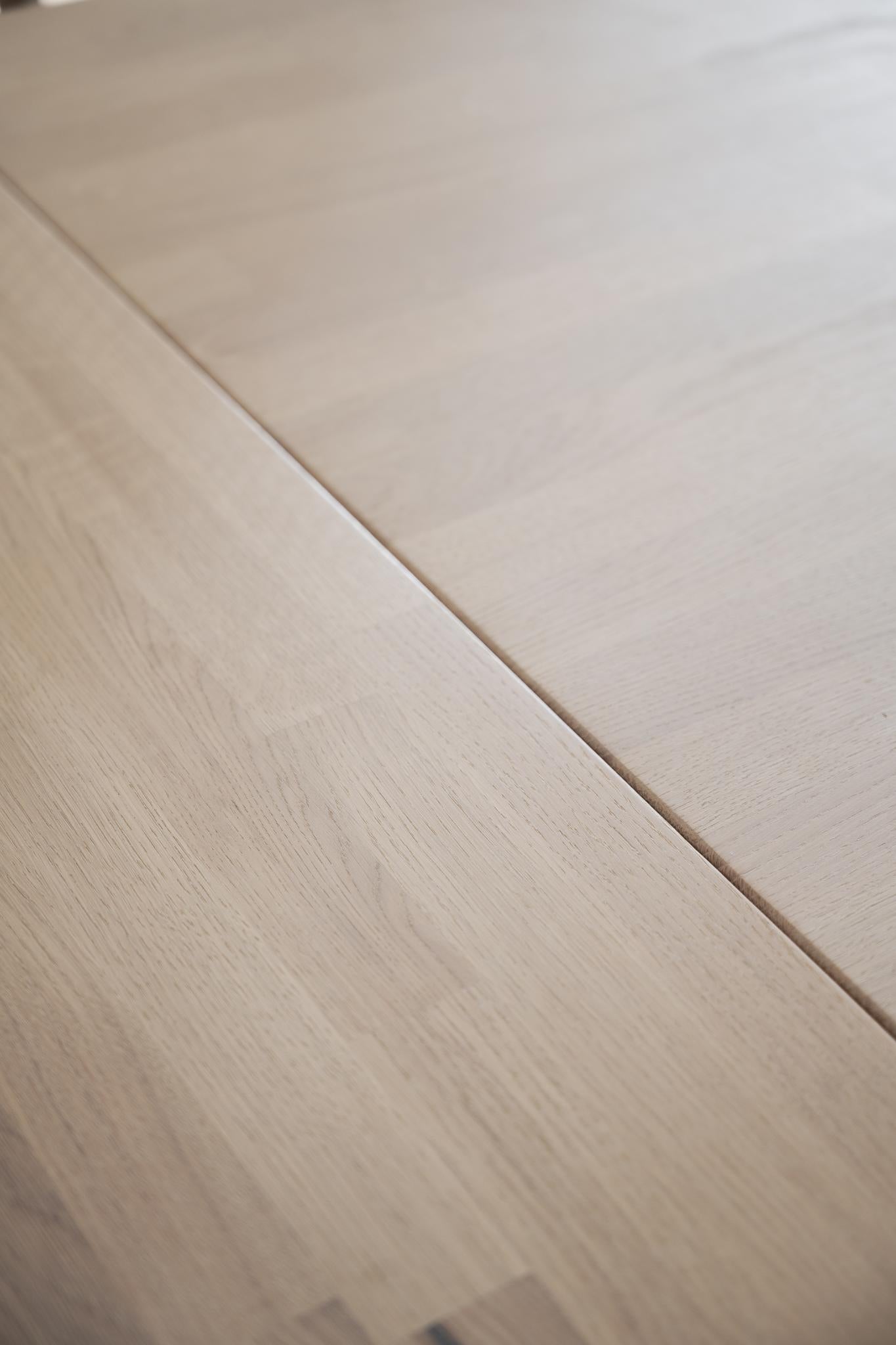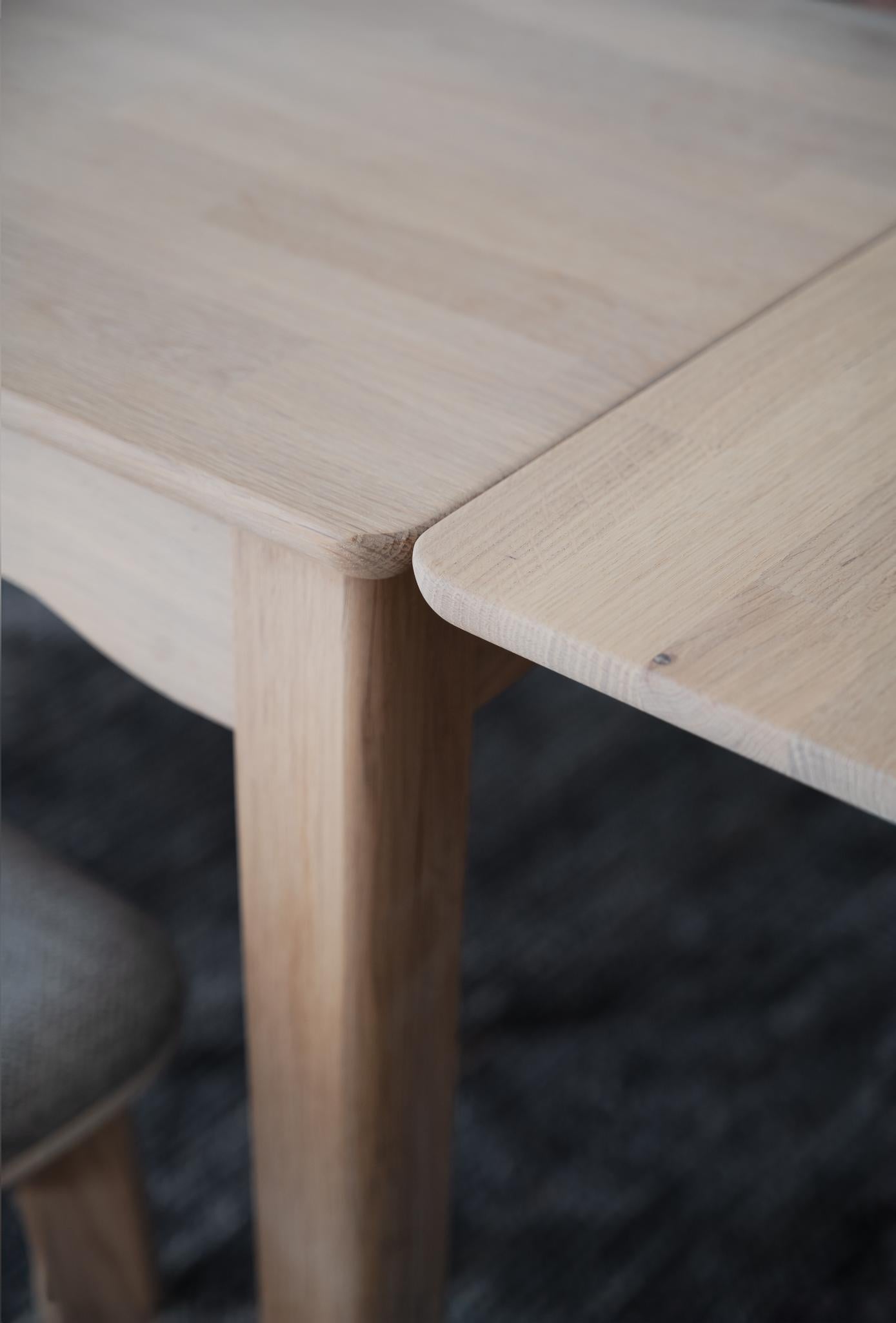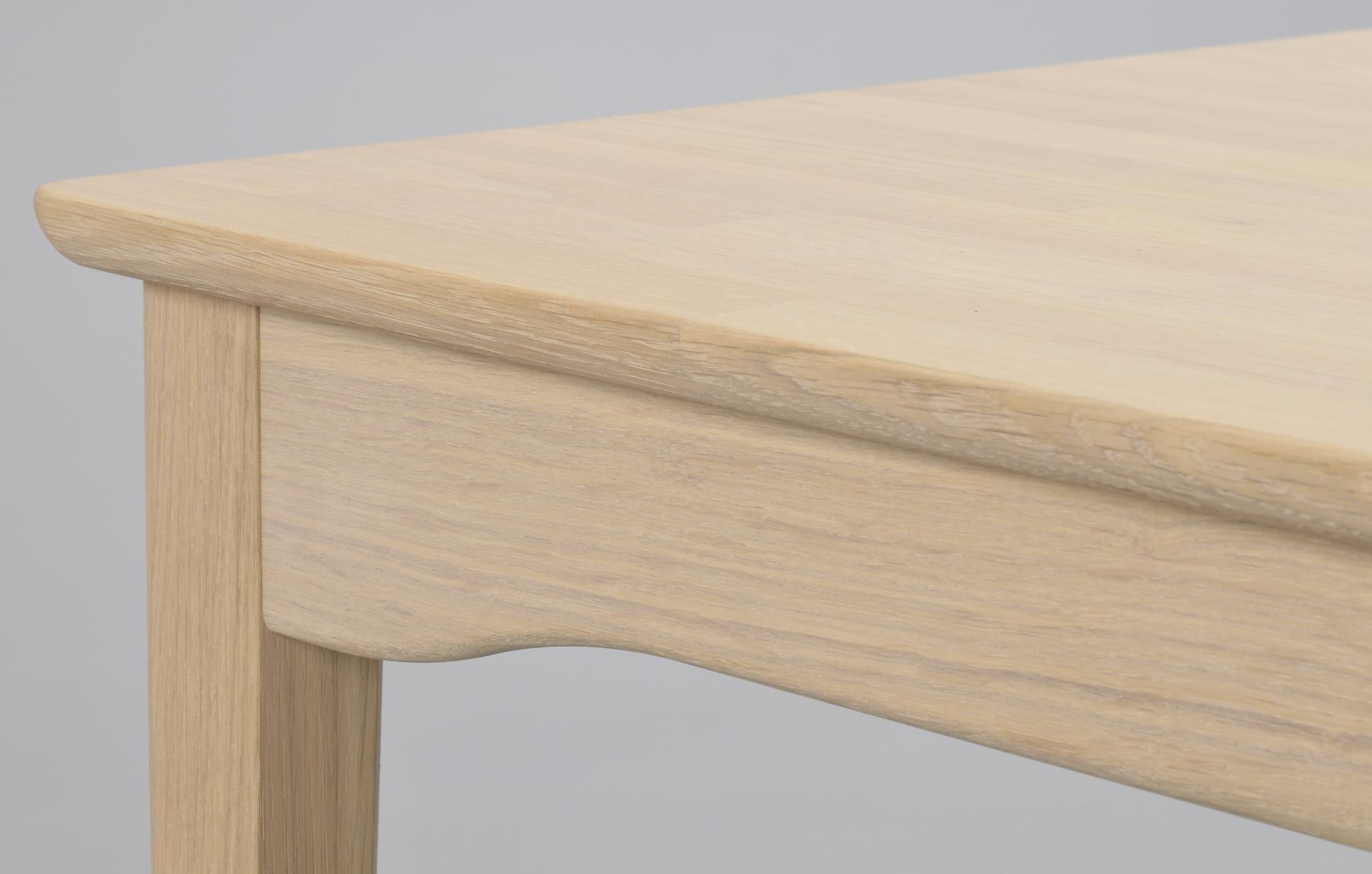 • Närbild av snickardetaljer på bord i ljust trä med rundade kanter och ben