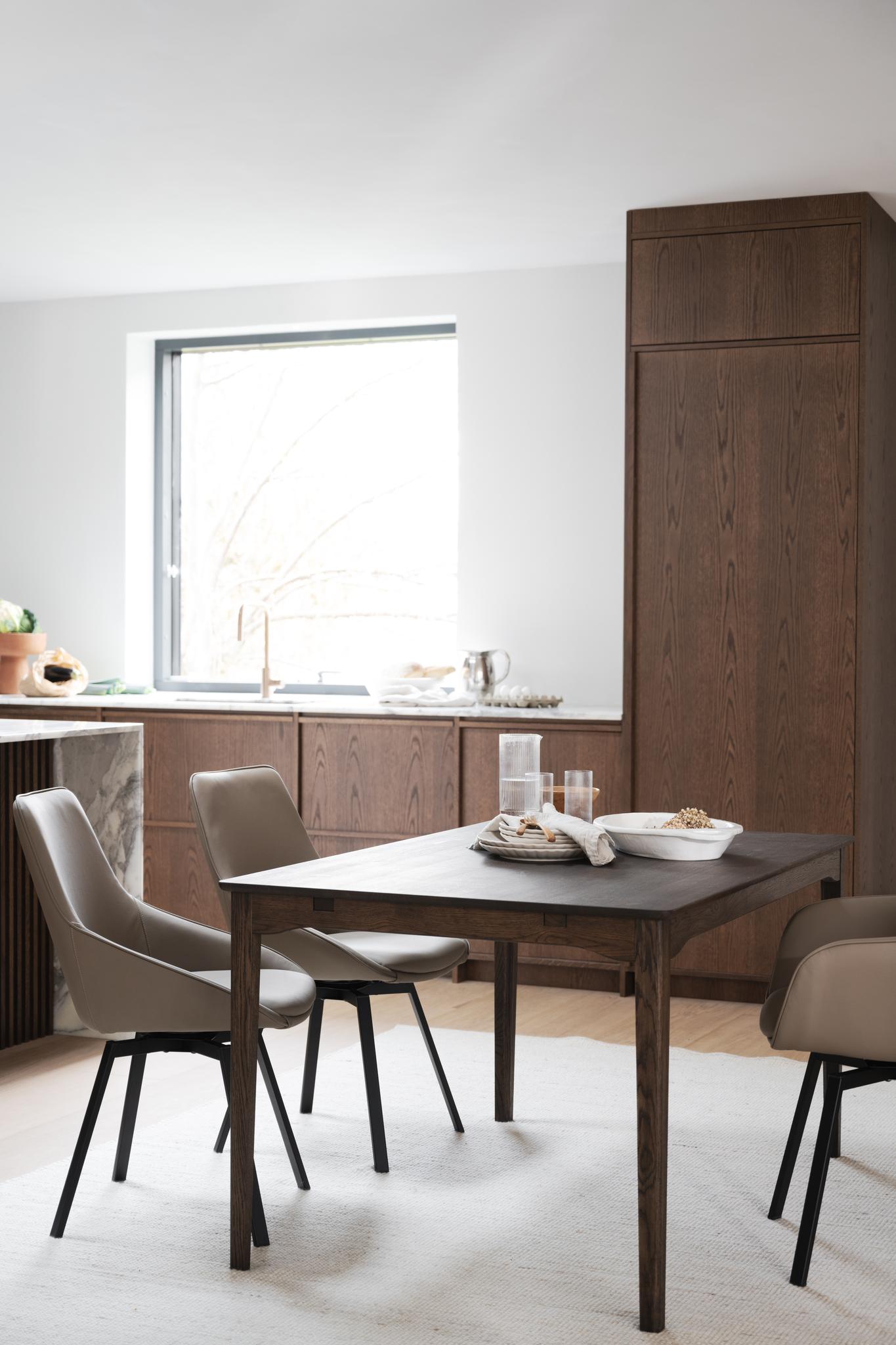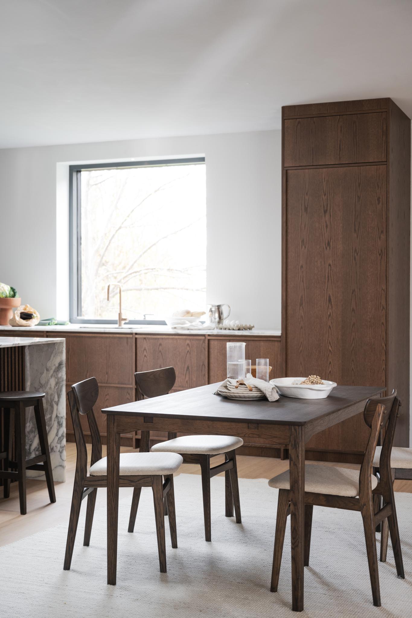 • Matbord i mörk ek med svarta stolar i minimalistiskt kök med träskåp och stort fönster