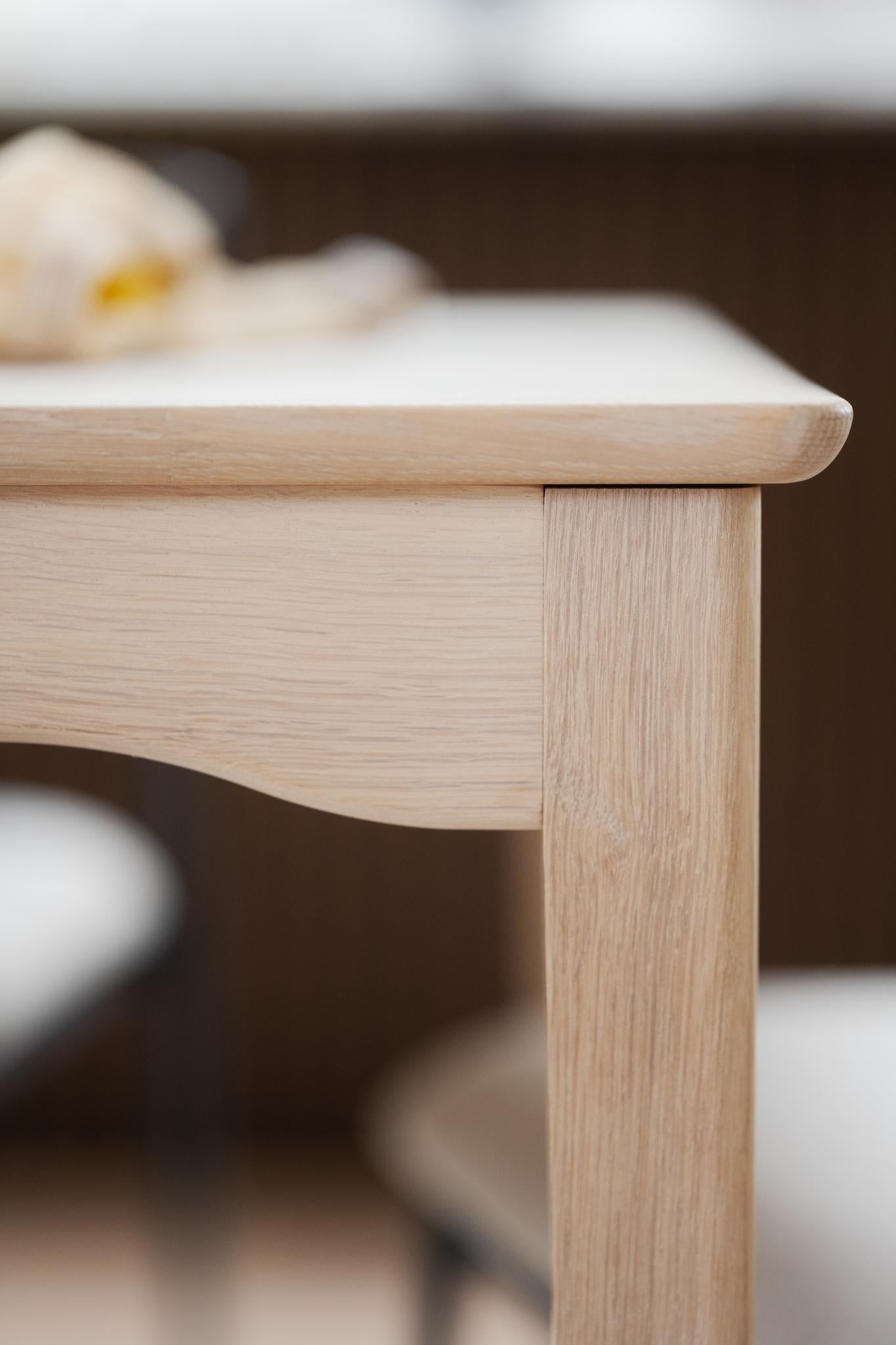 • Närbild på träbordsskiva med ljus ekfärg och rundade hörn, visar naturlig trästruktur och fot i massivt trä