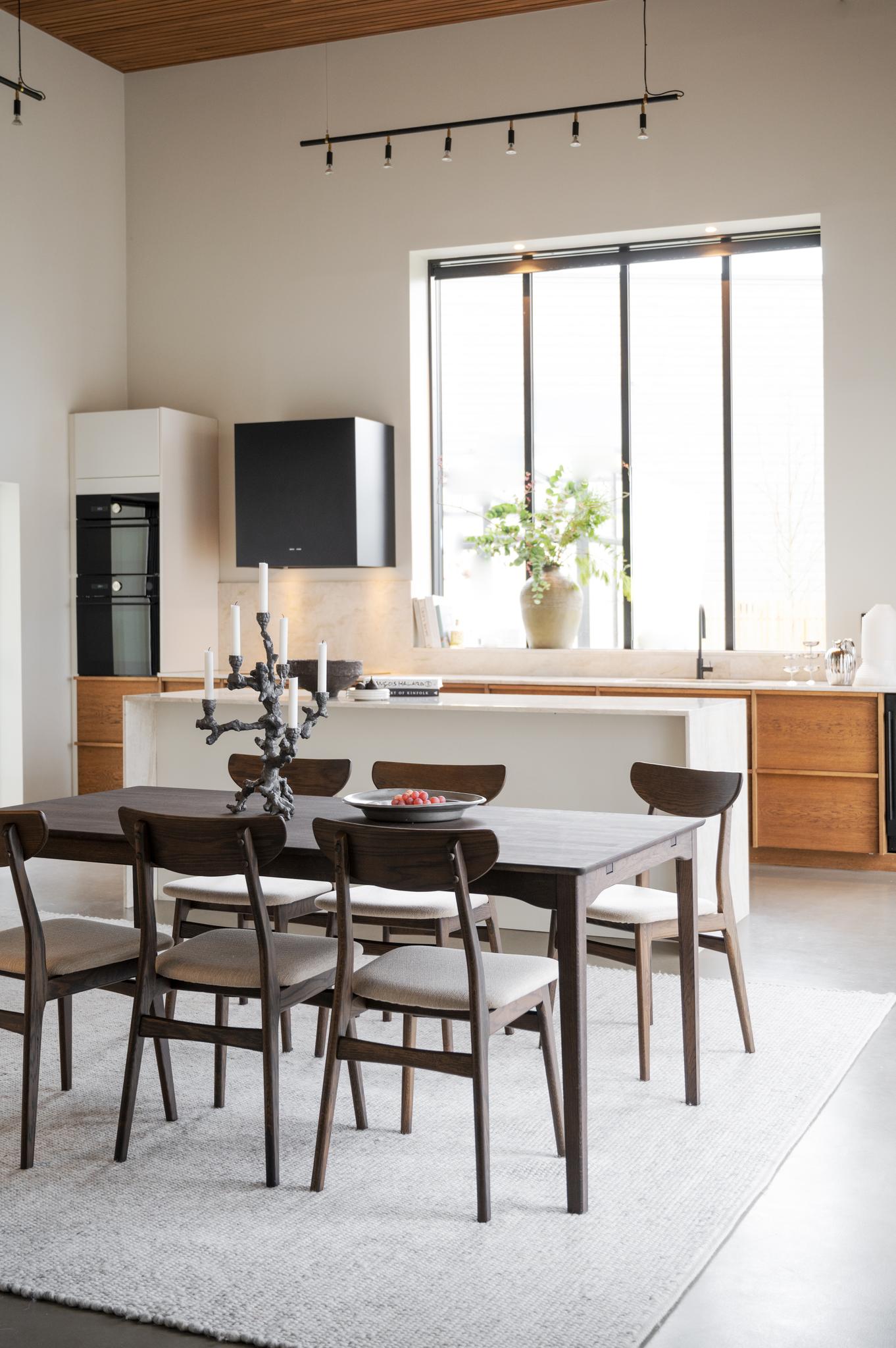 • Modern matplats med ljust träbord, stolar med beige dynor och mörka träskåp i köket