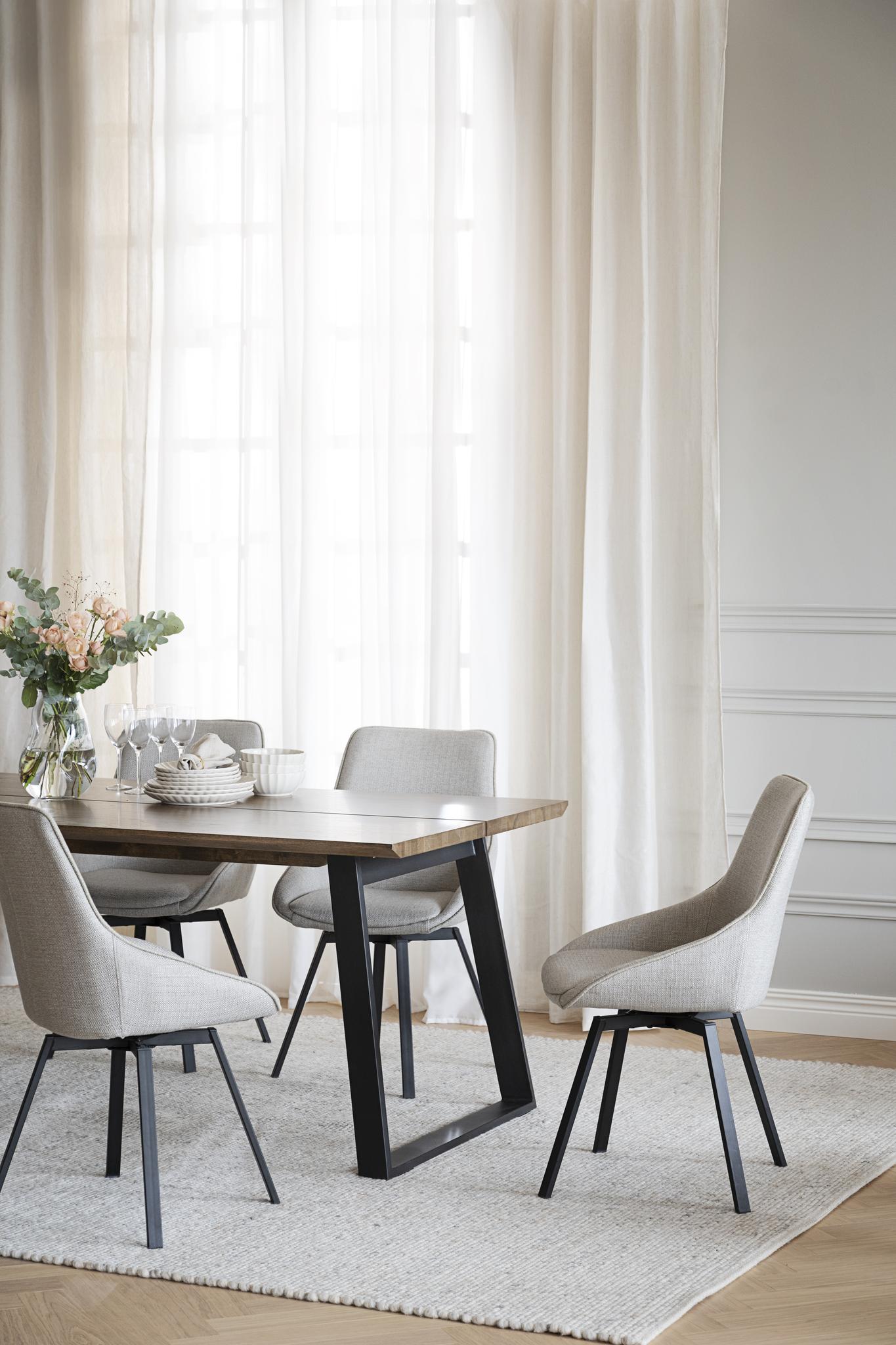 • Matbord med träskiva och svarta metallben på ljus matta i ljust matrum med vita gardiner